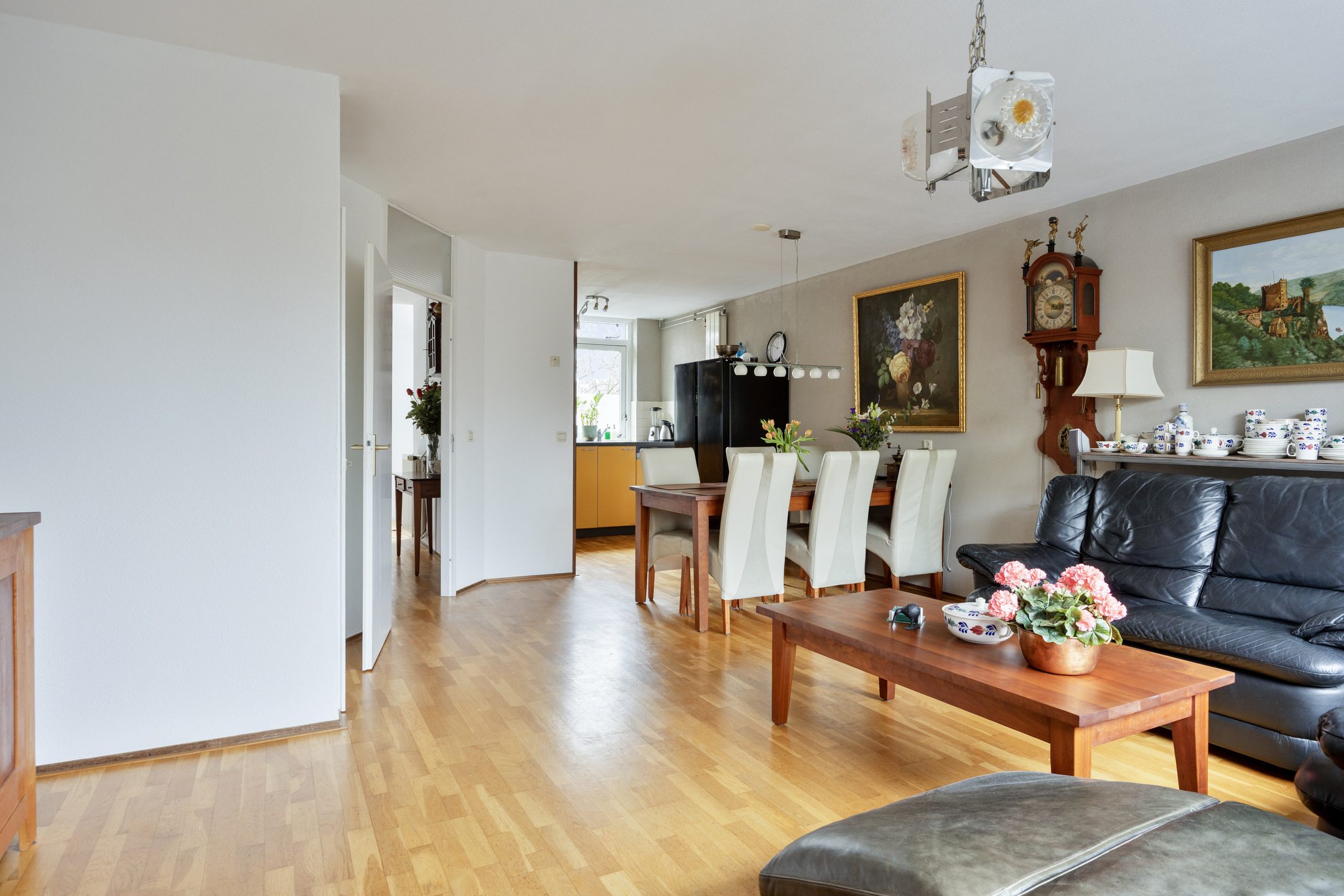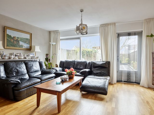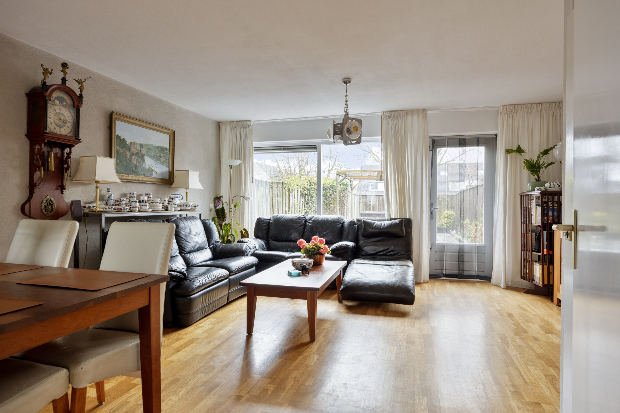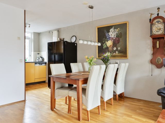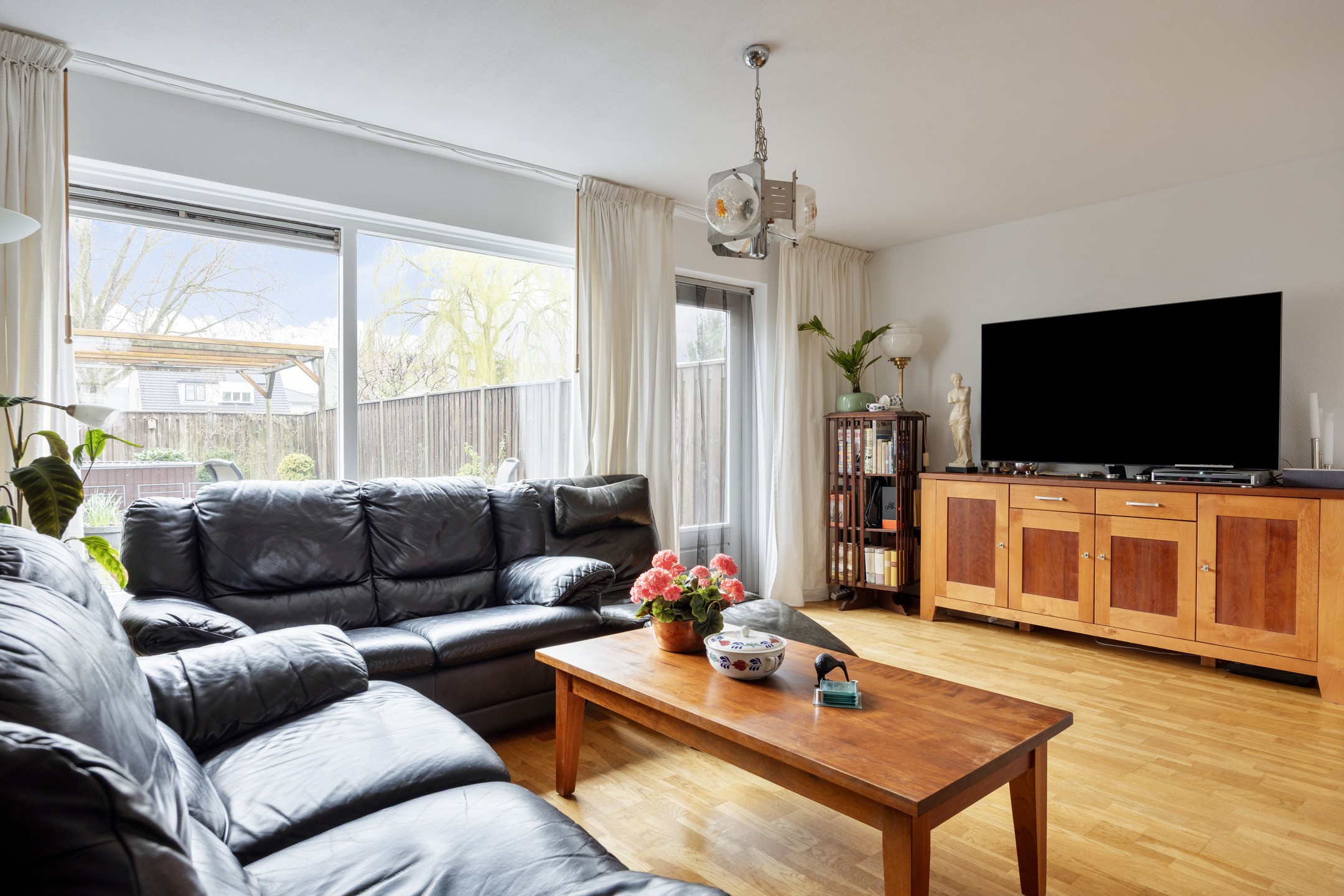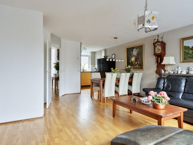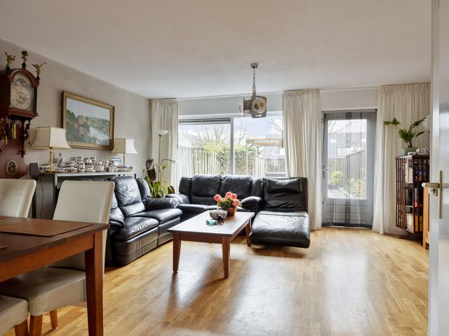 De woonkamer is voorzien van een houten vloer en houten kozijnen met dubbel glas. Vanuit de woonkamer is de achtertuin bereikbaar.