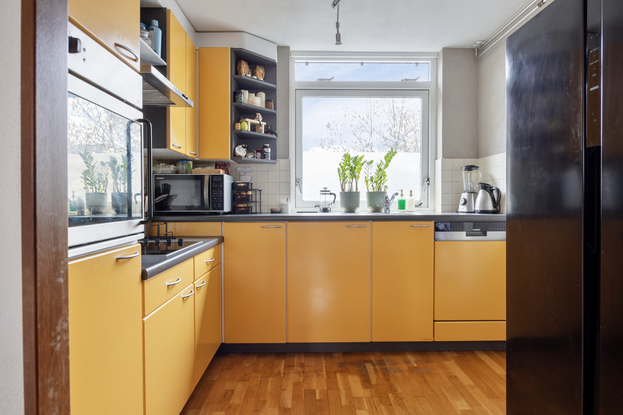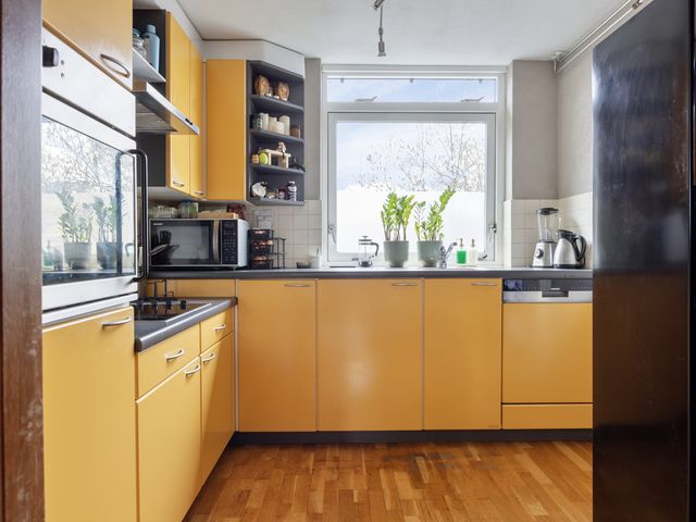 De open keuken is uitgerust met een inductiekookplaat, oven, afzuigkap, RVS-spoelbak en vaatwasser.