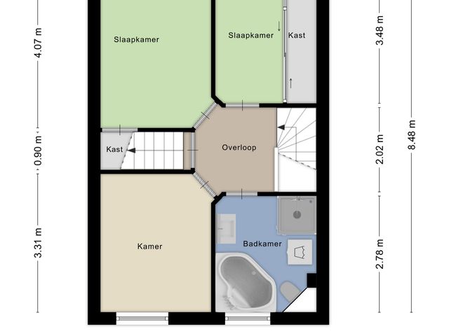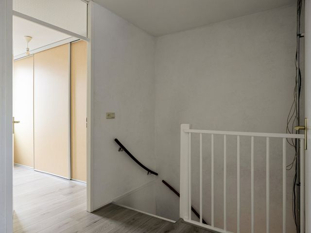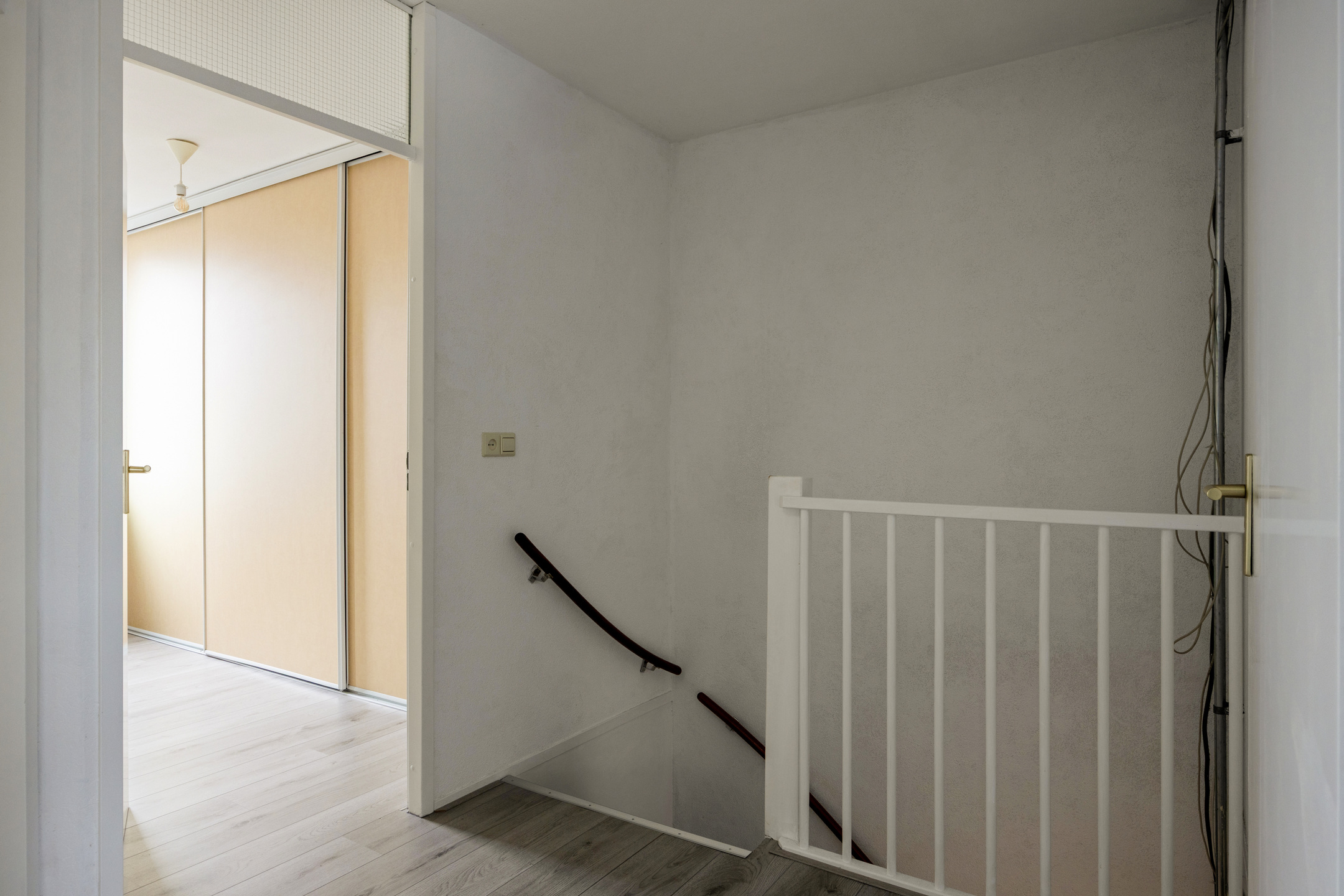 De overloop geeft toegang tot drie slaapkamers, de badkamer en de trapopgang naar de tweede verdieping.