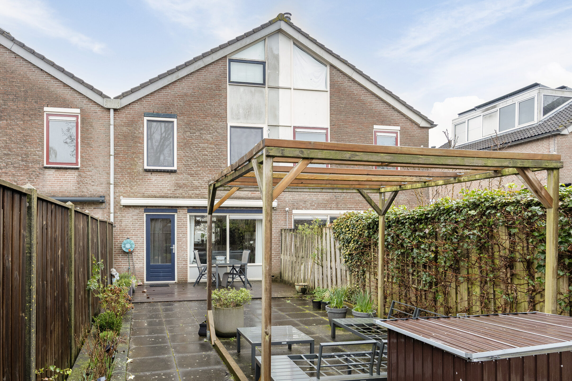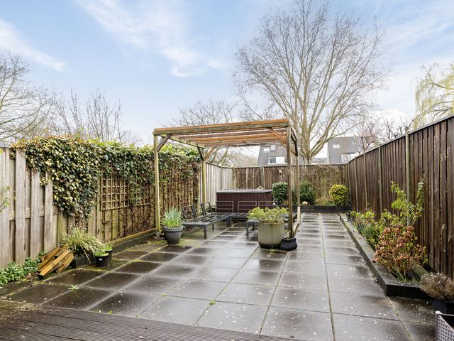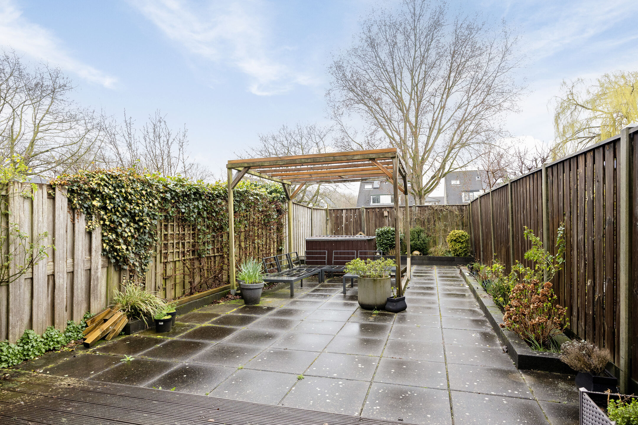 De onderhoudsvrij aangelegde achtertuin, gelegen op het westen, is voorzien van een elektrisch zonnescherm.