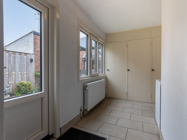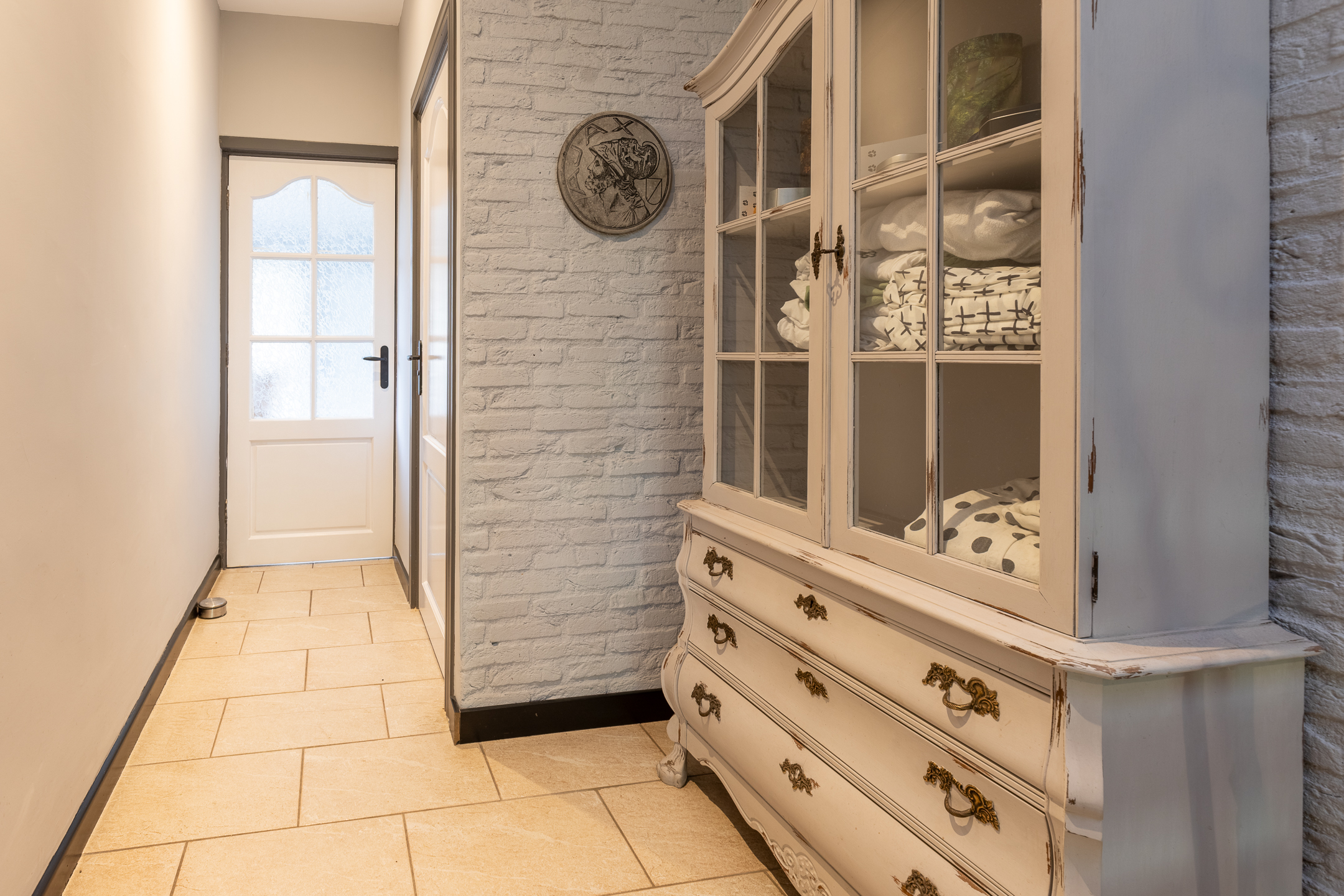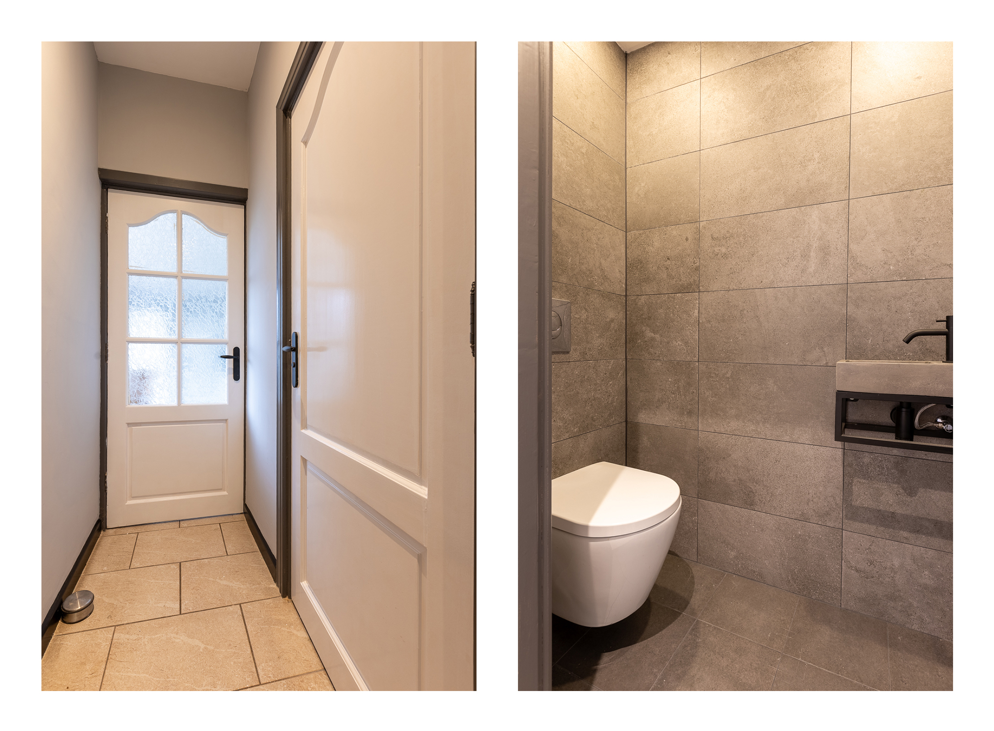 Entree met meterkast en toegang tot de hal. De hal is voorzien van een tegelvloer, trapopgang en een moderne toiletruimte. Vanuit de hal zijn zowel de woonkamer als de keuken bereikbaar.
