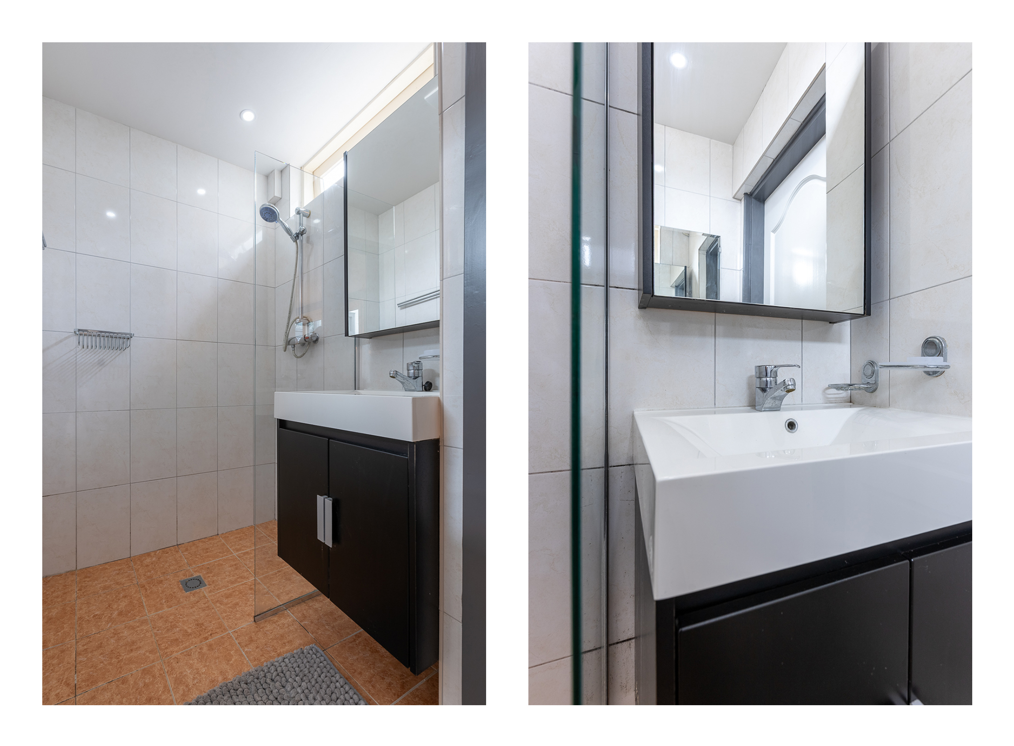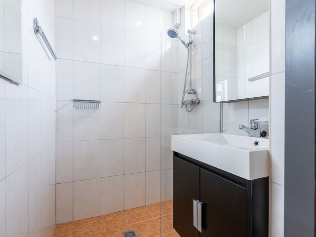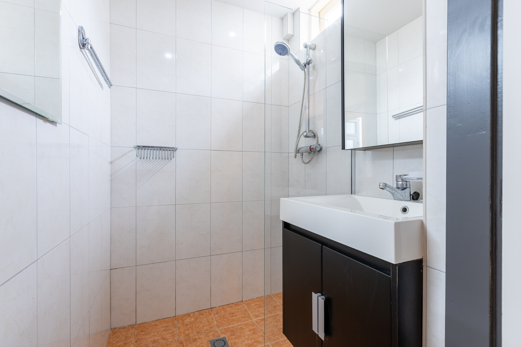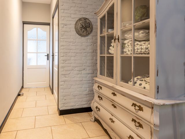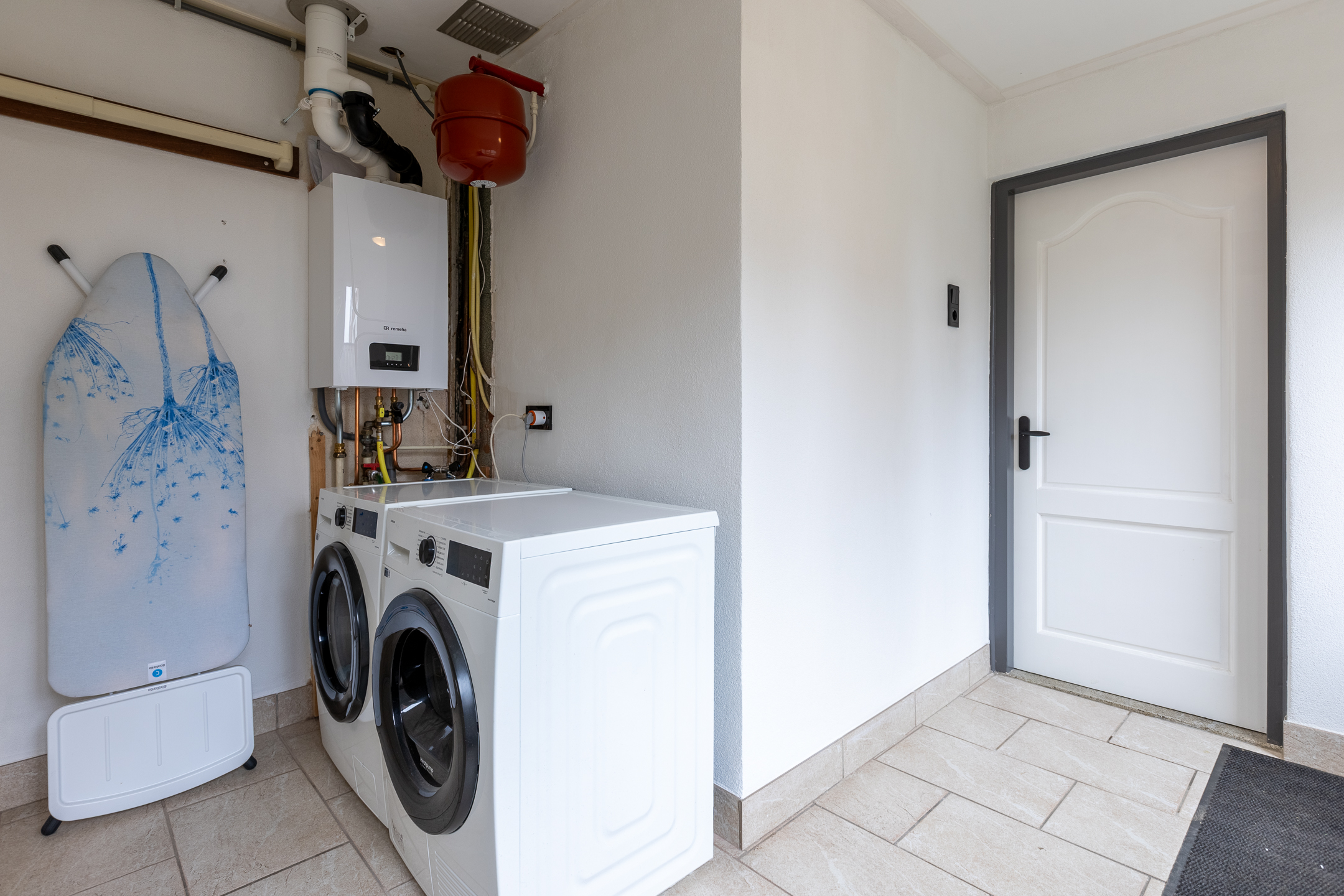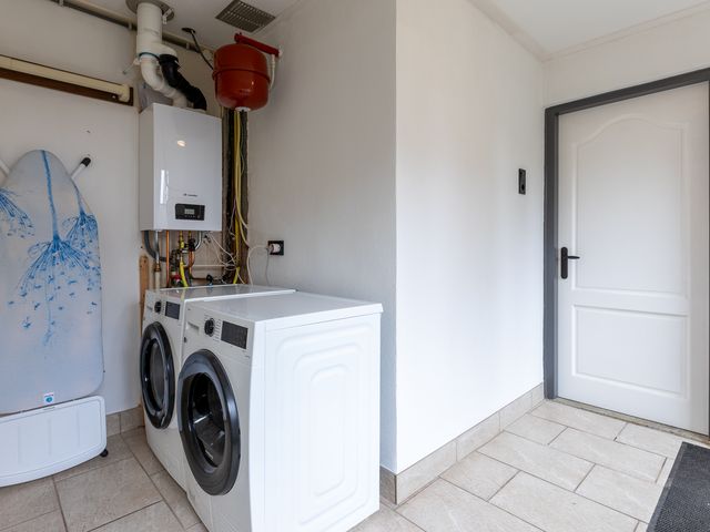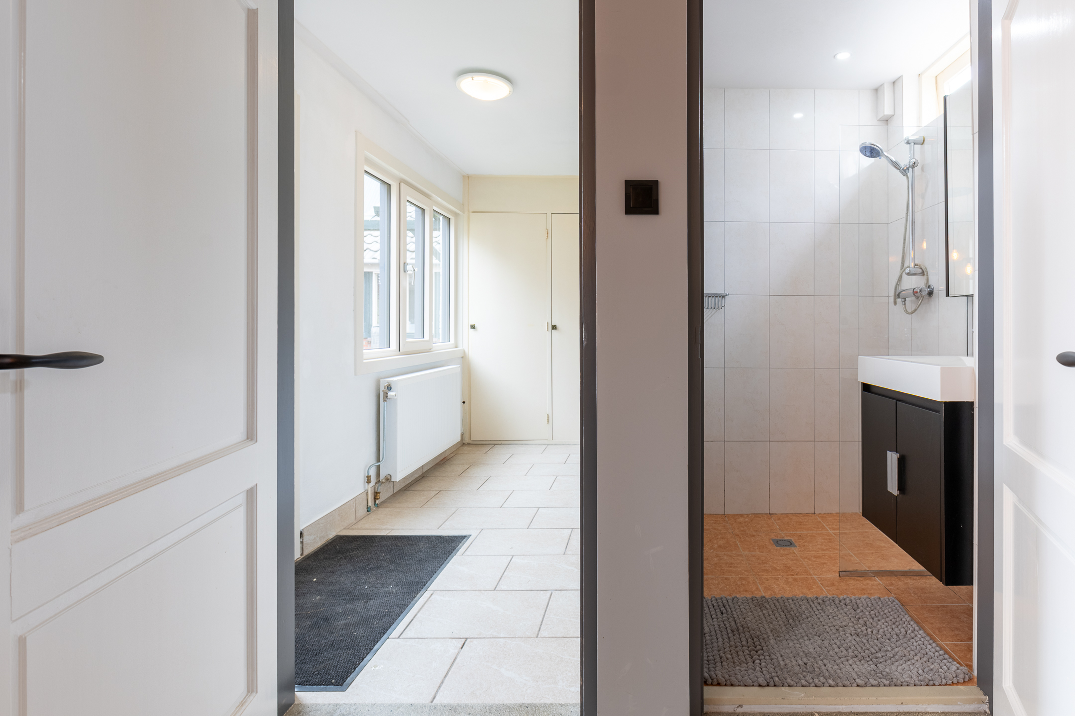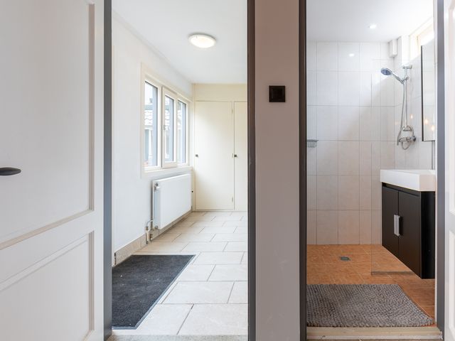 De badkamer is voorzien van douche en badkamermeubel. De bijkeuken is voorzien van een tegelvloer, inbouwkasten, aansluitingen voor wasapparatuur en de opstelplaats van de cv-ketel (2025)