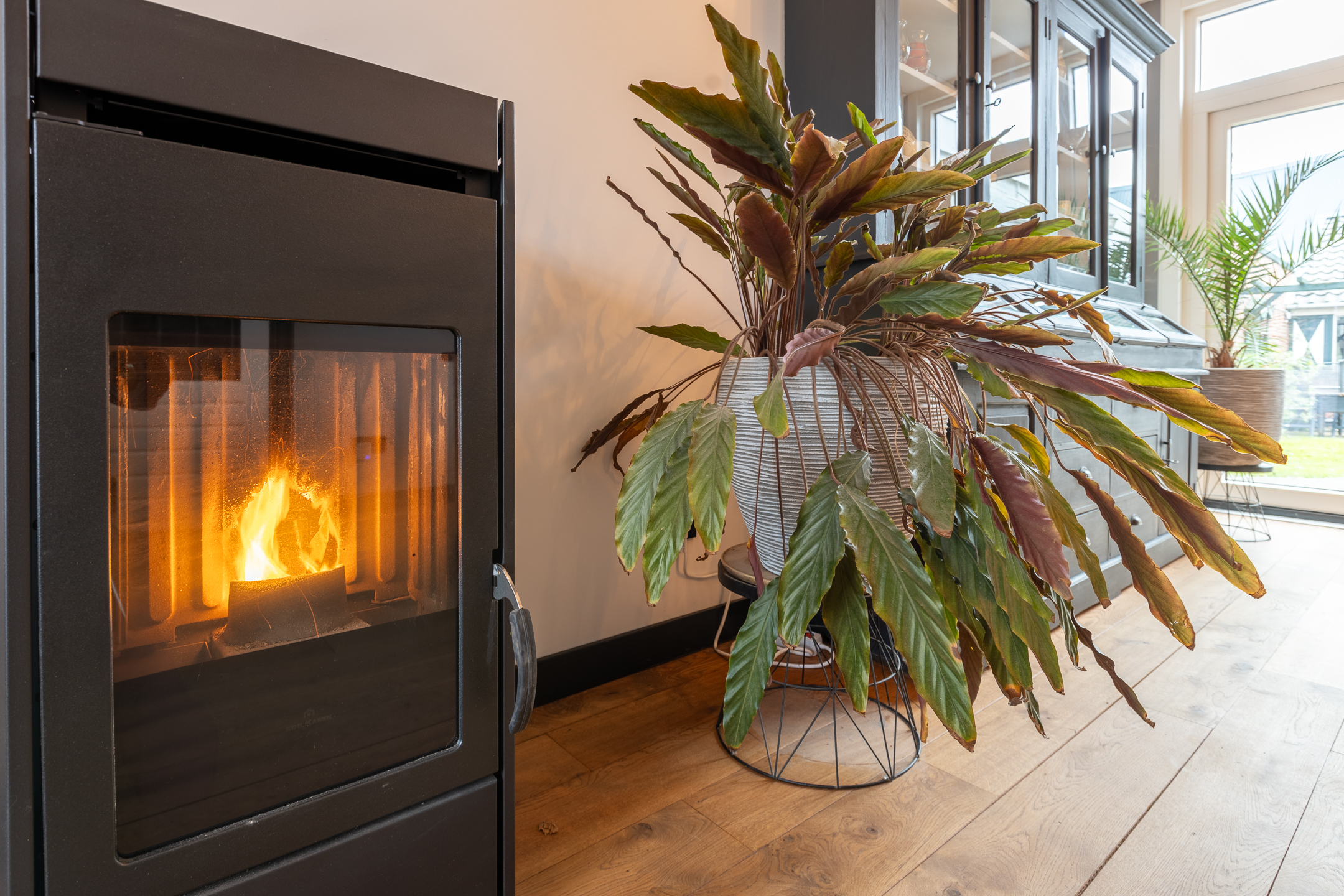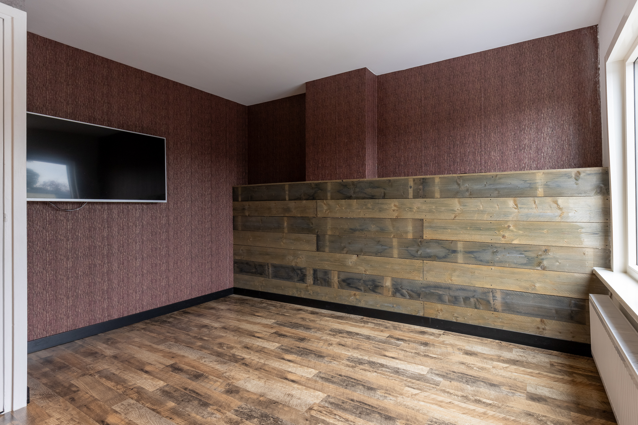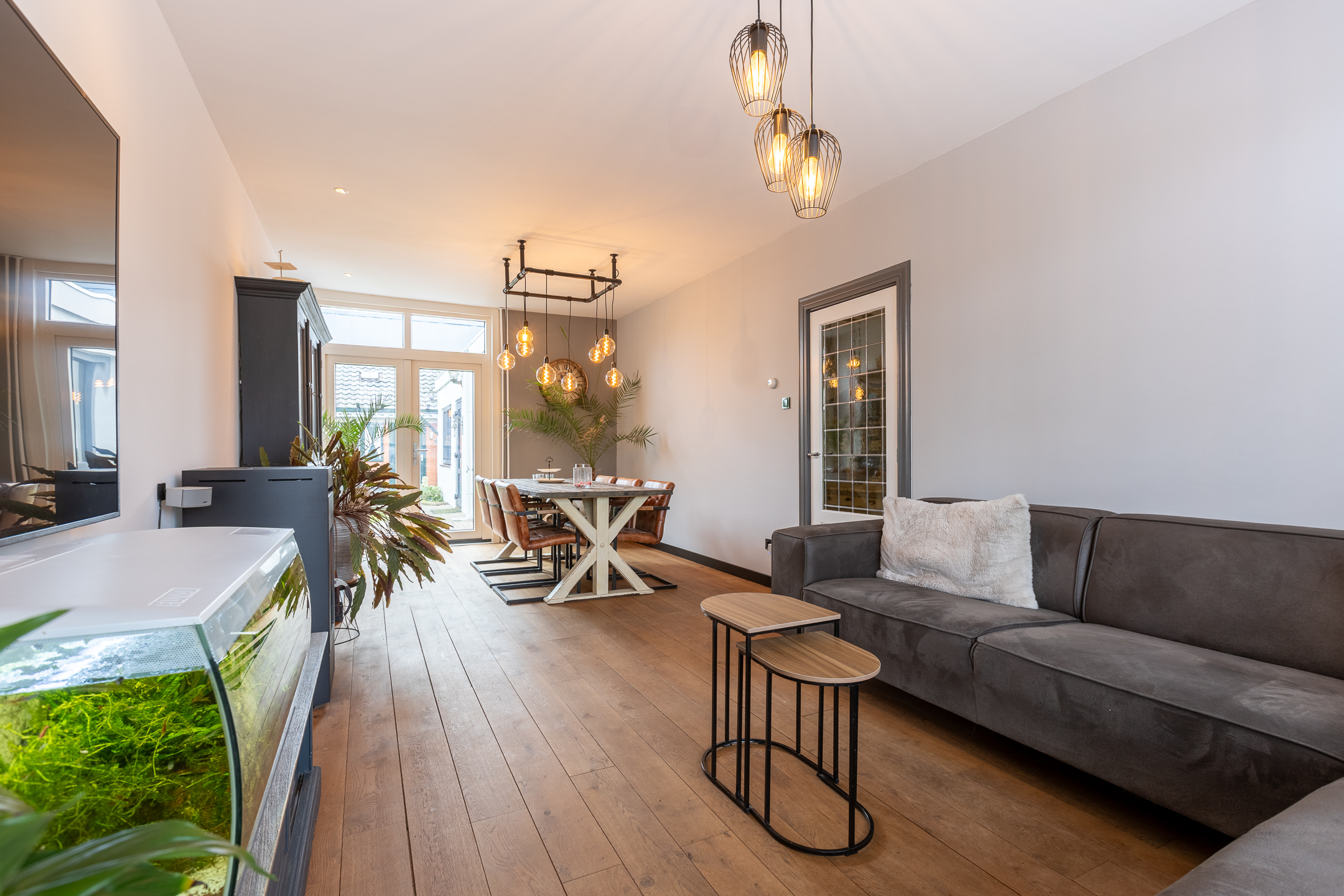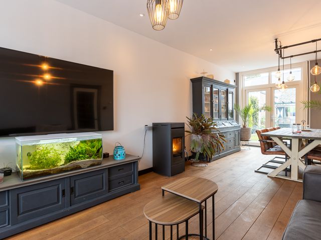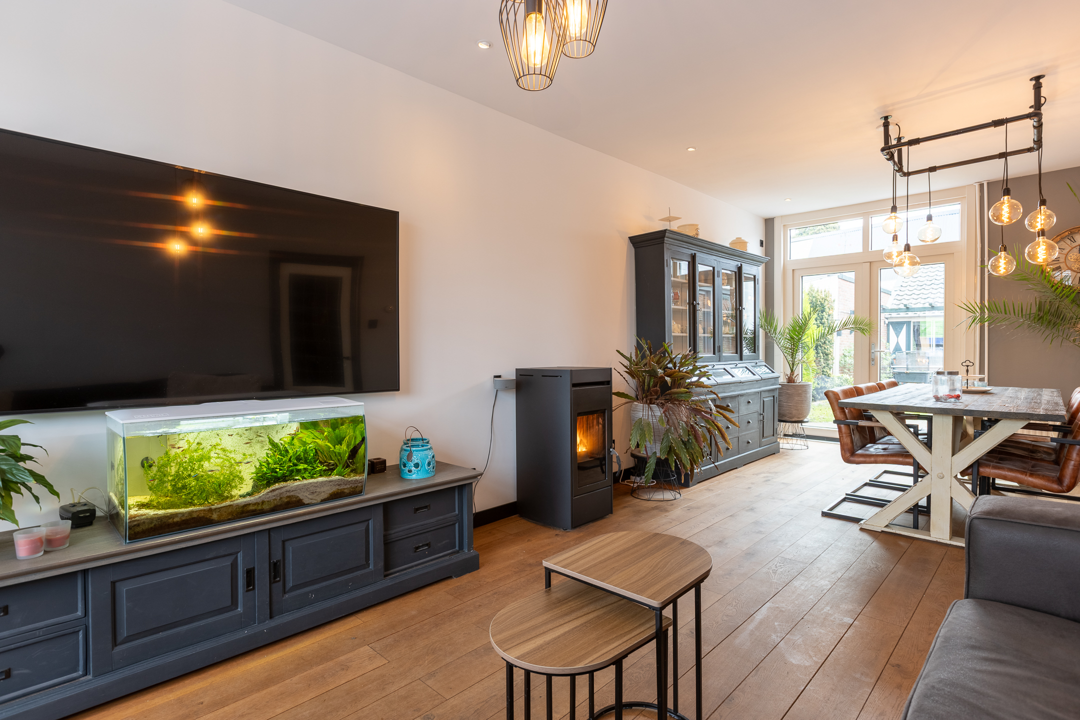 De woonkamer is voorzien van een houten vloer en een pelletkachel. De wanden en het plafond zijn volledig geïsoleerd en voorzien van stucwerk. Aan de achterzijde is de woning voorzien van openslaande kunststof tuindeuren, waardoor er een prettige verbinding met de tuin ontstaat.