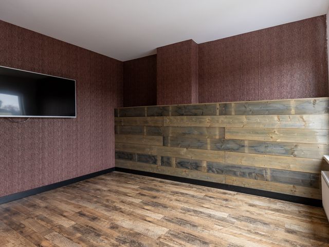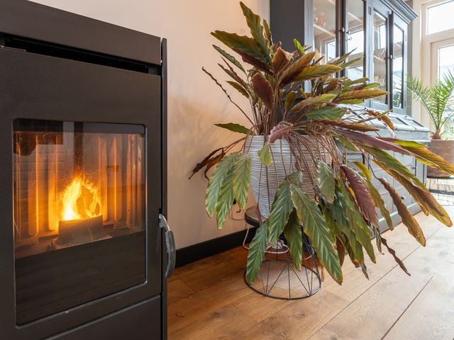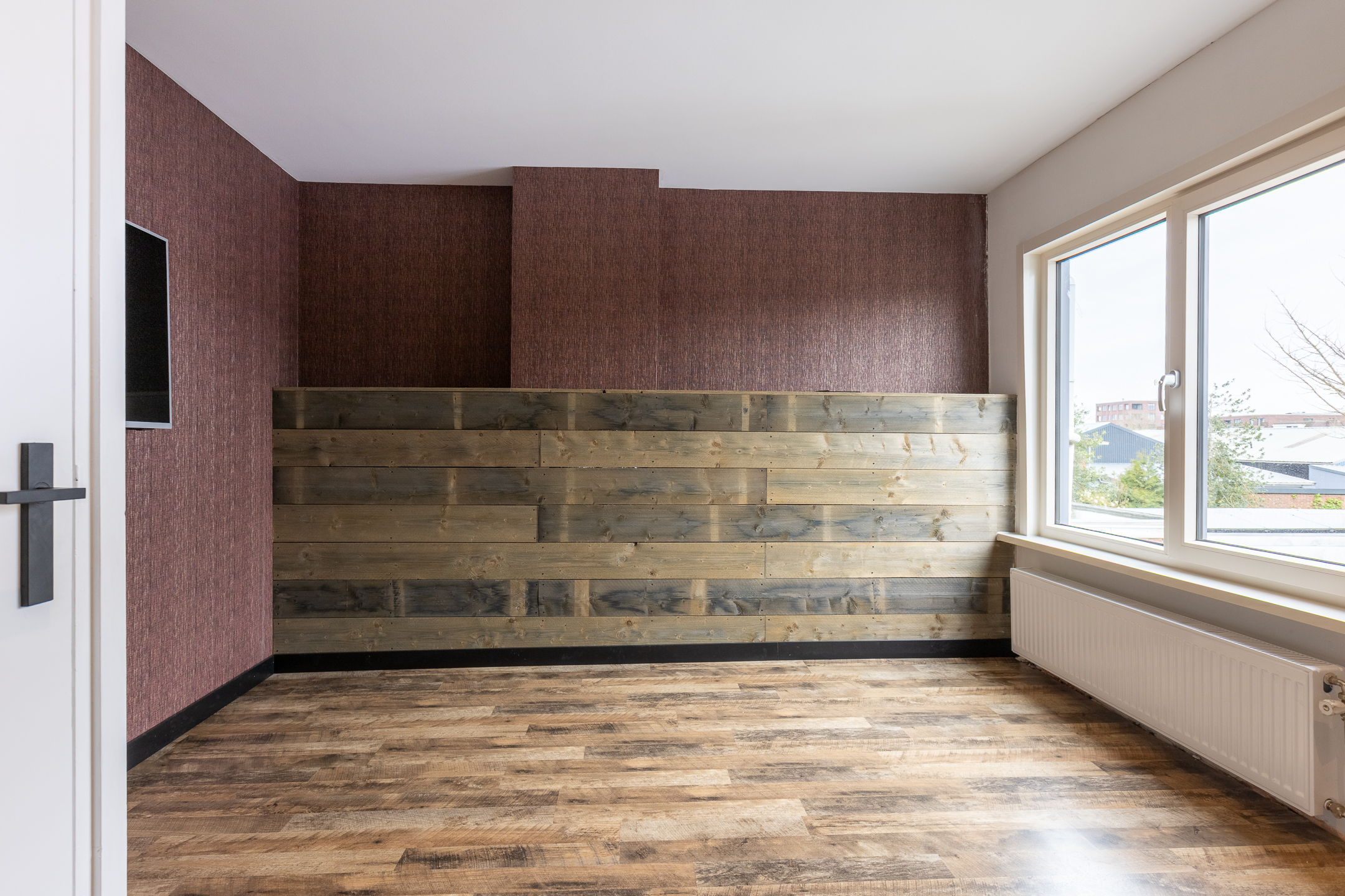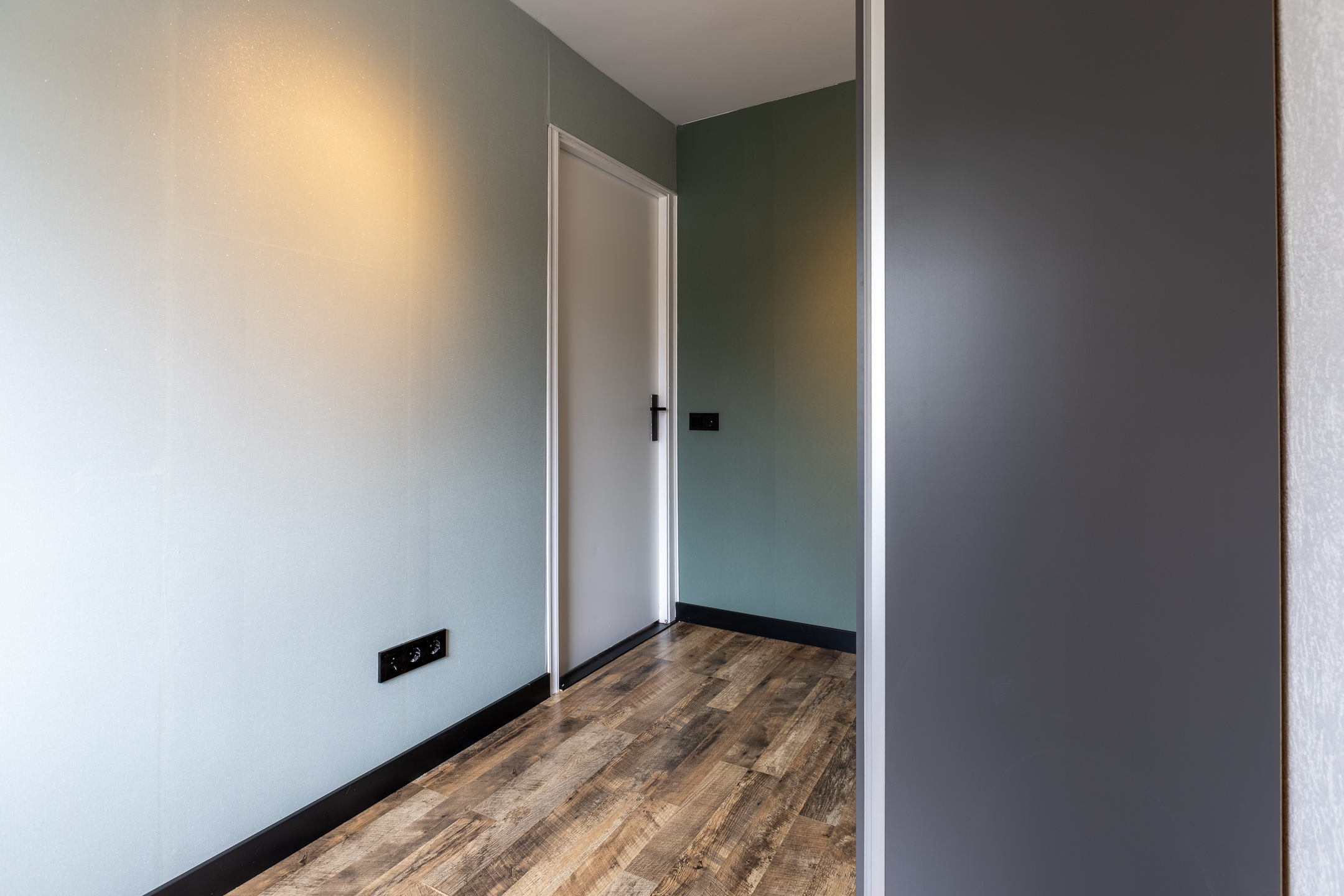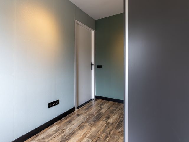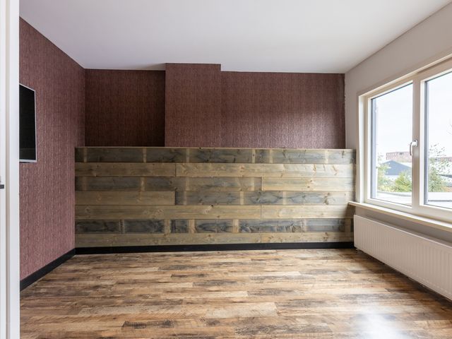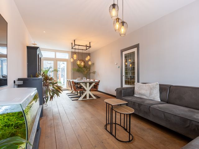 De woonkamer is voorzien van een houten vloer en een pelletkachel. De wanden en het plafond zijn volledig geïsoleerd en voorzien van stucwerk. Aan de achterzijde is de woning voorzien van openslaande kunststof tuindeuren, waardoor er een prettige verbinding met de tuin ontstaat.