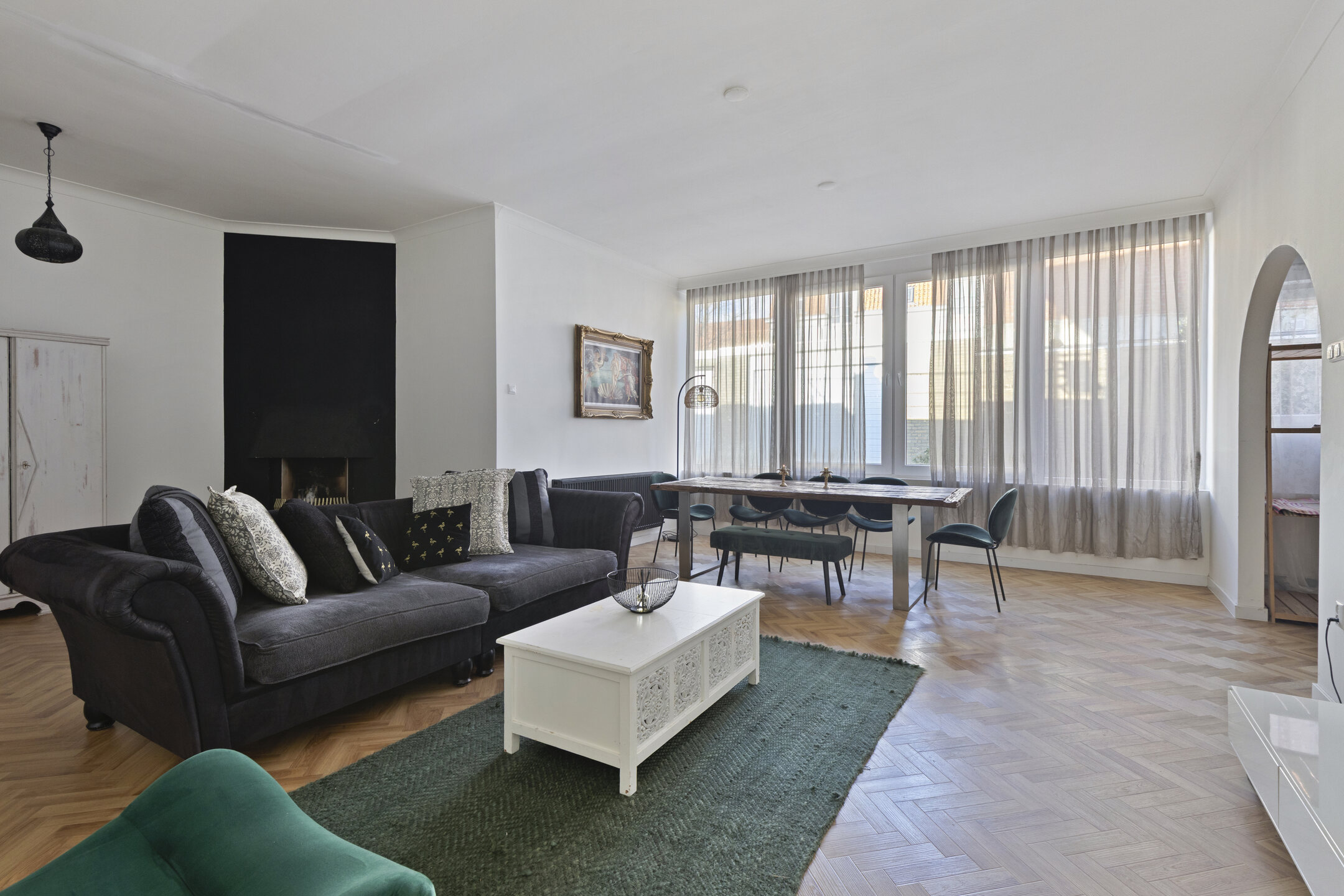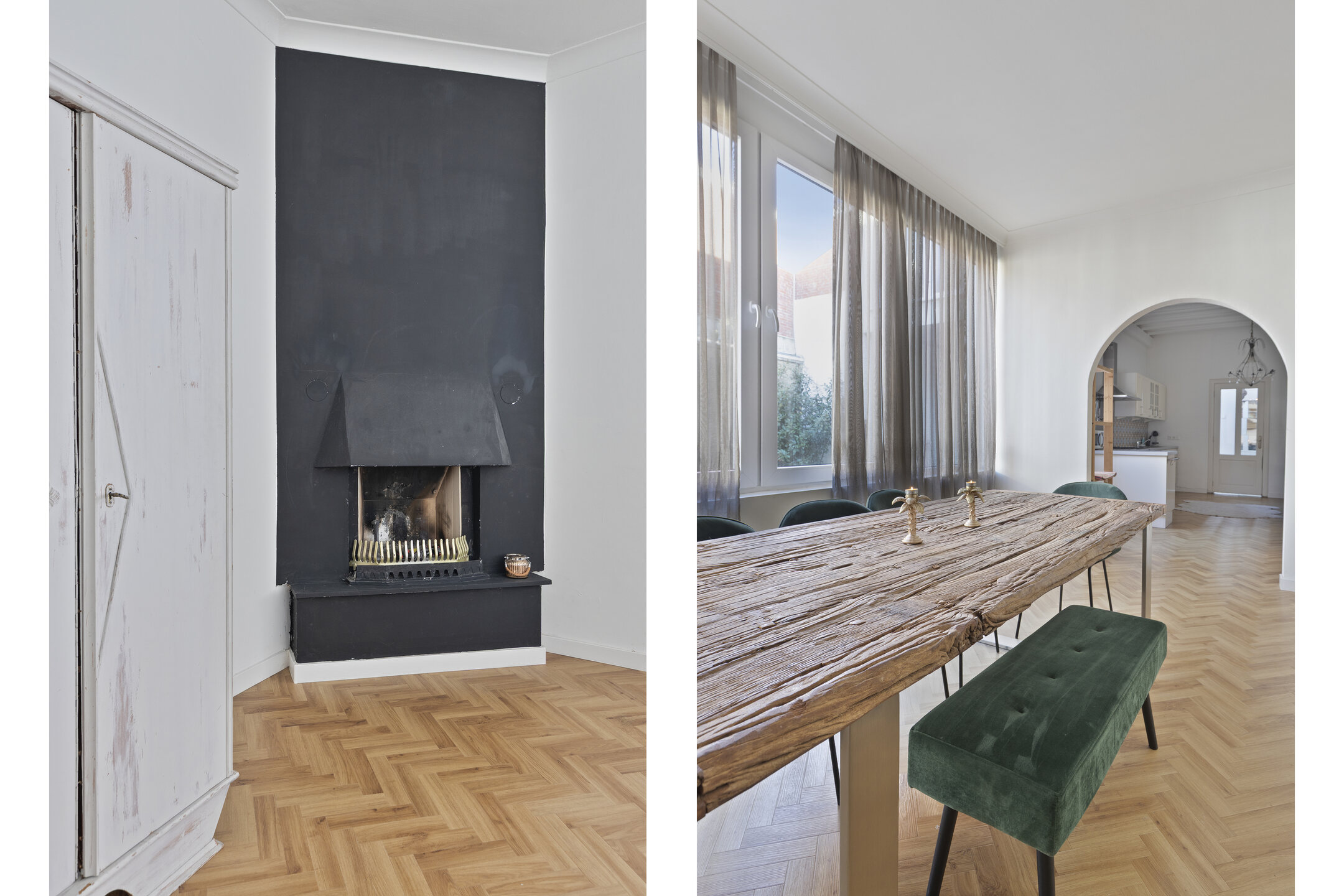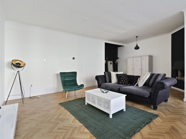 De ruime woonkamer ademt een warme en huiselijke sfeer en is een plek waar u zich direct thuis voelt. De open haard zorgt voor extra gezelligheid, terwijl de grote raampartijen zorgen voor een prettige lichtinval. De woonkamer en keuken zijn voorzien van een in visgraat gelegde pvc-vloer.