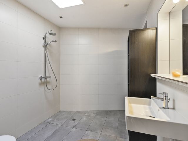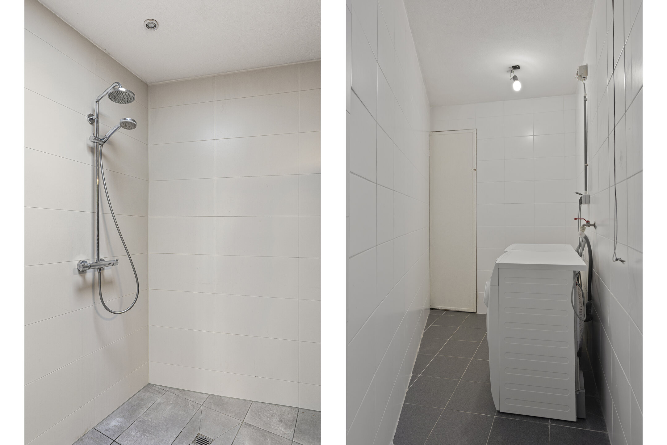 De moderne badkamer beschikt over een tegelvloer, vaste wastafel en douche. Aansluitend bevindt zich een aparte wasruimte met aansluitingen voor de wasapparatuur en de opstelling van de CV-ketel ( huur 2025).
