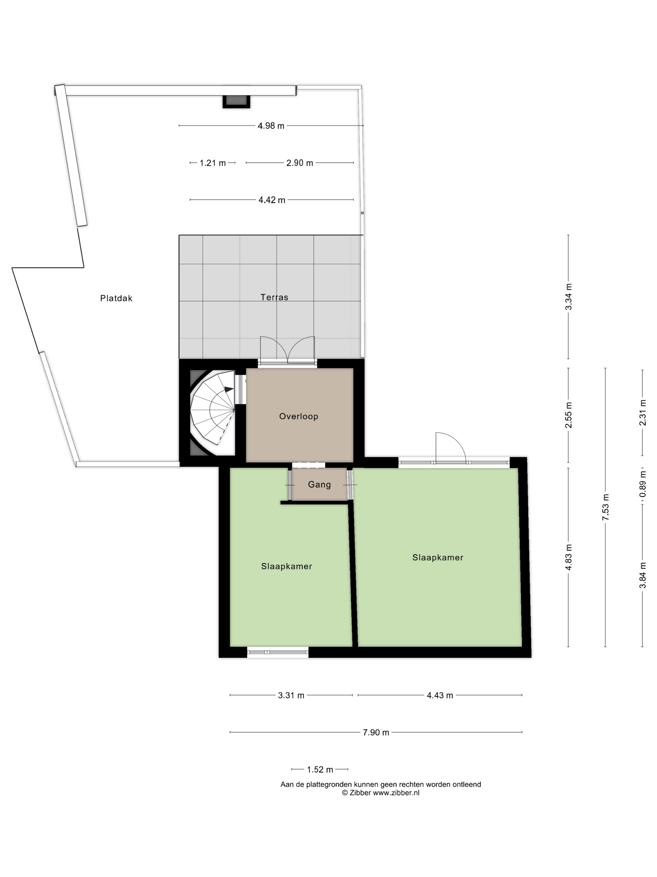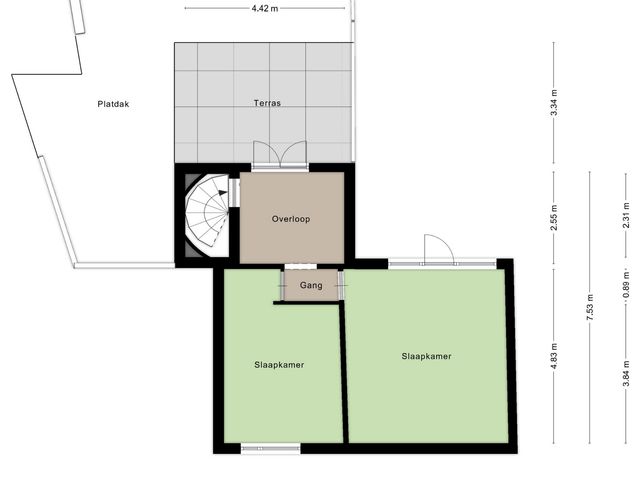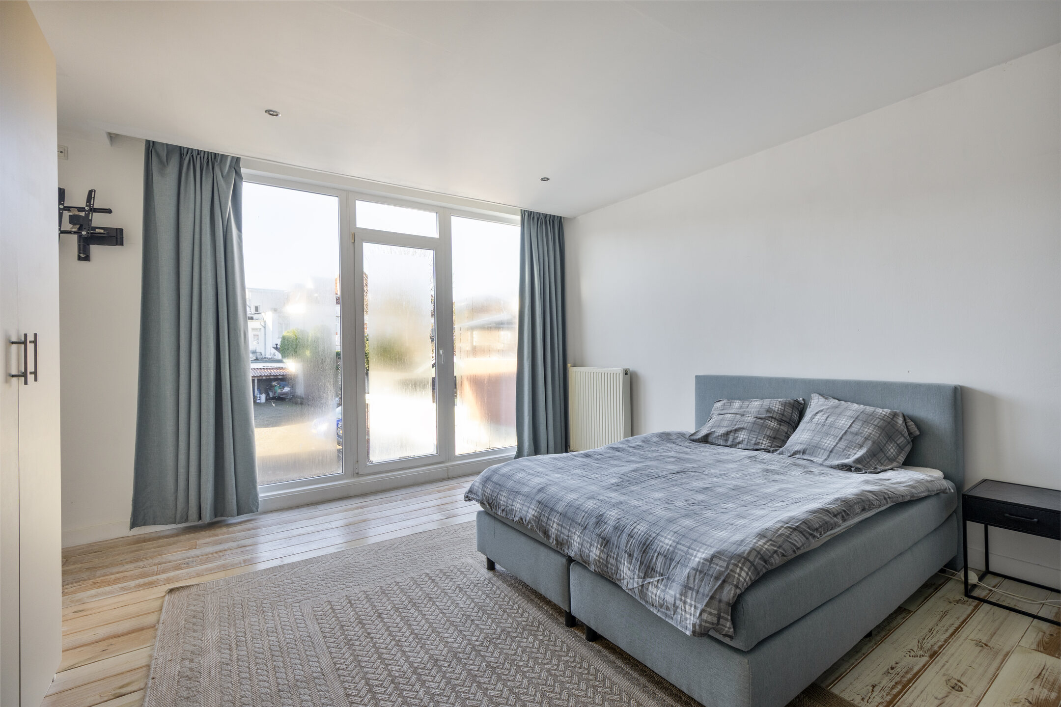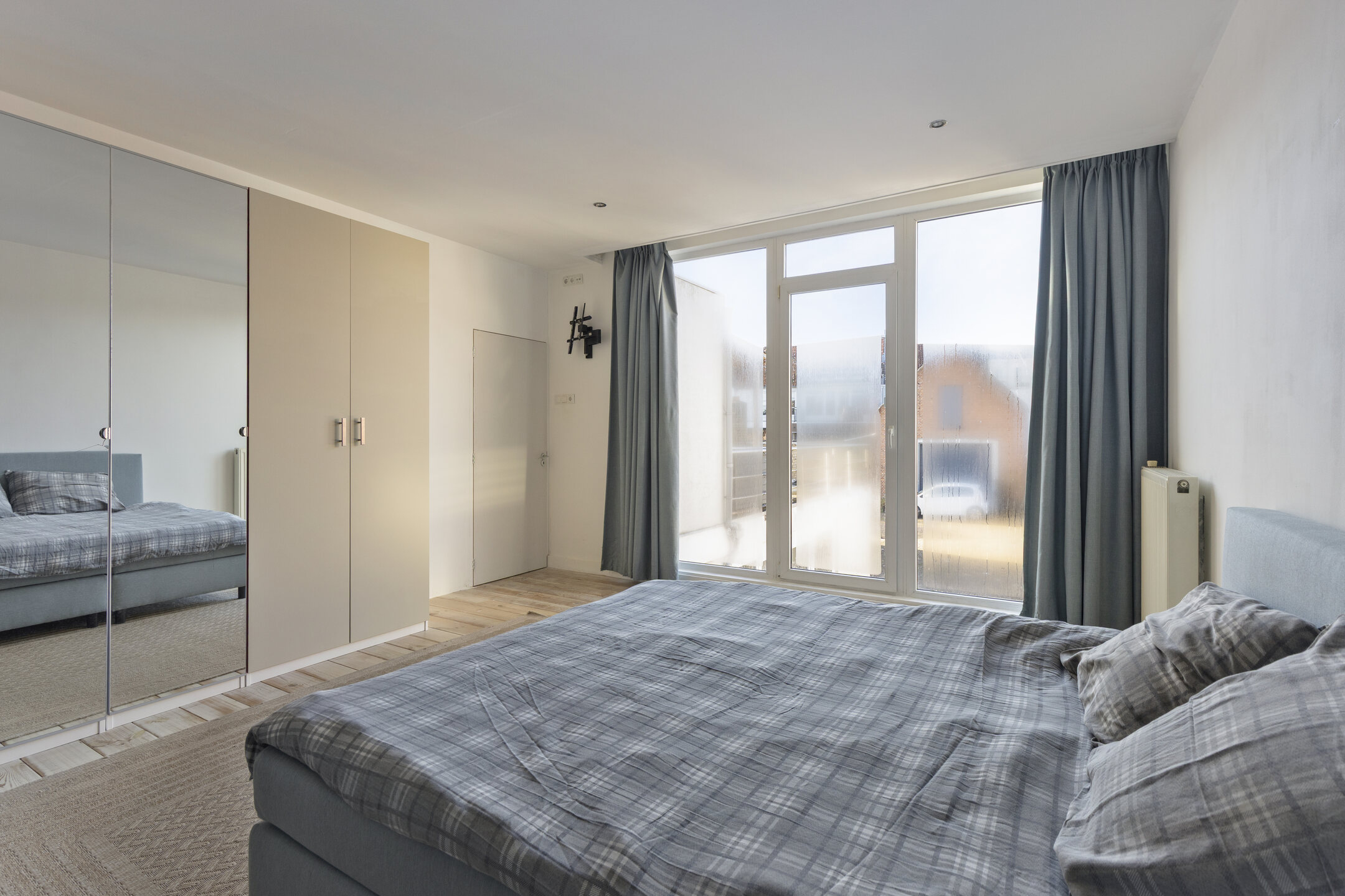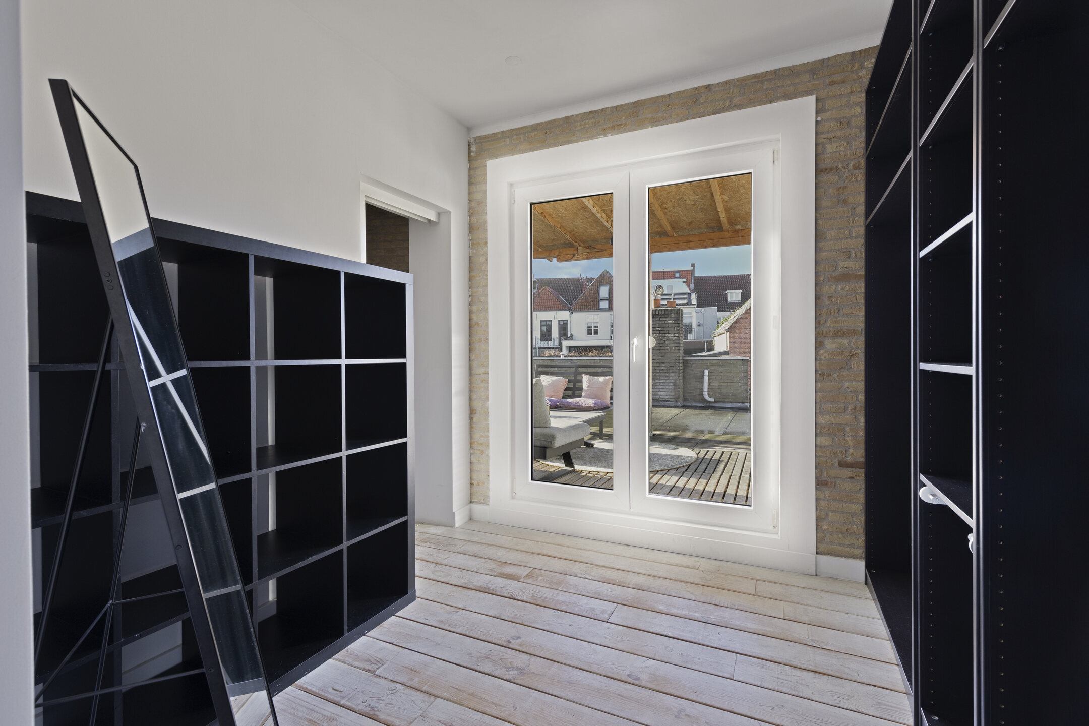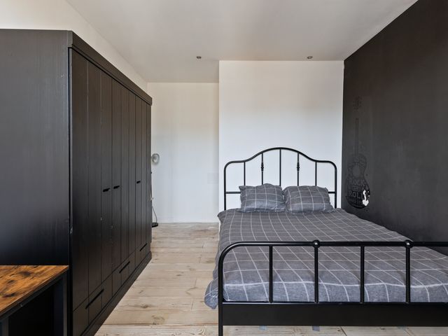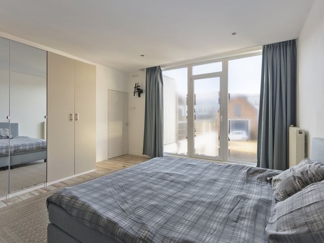 De overloop met houten vloer biedt toegang tot twee ruime slaapkamers en het dakterras. Op de overloop bevindt zich tevens een vaste kastenwand, wat zorgt voor praktische en extra bergruimte.