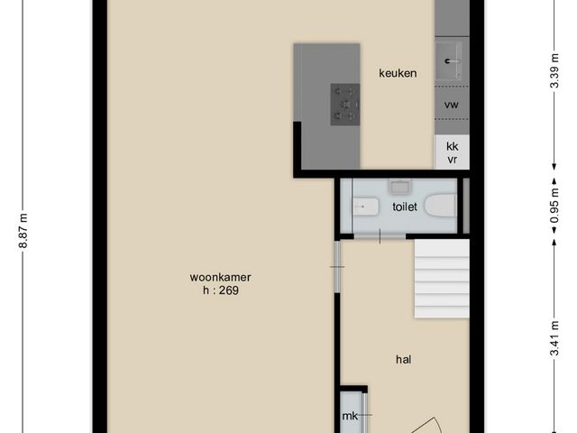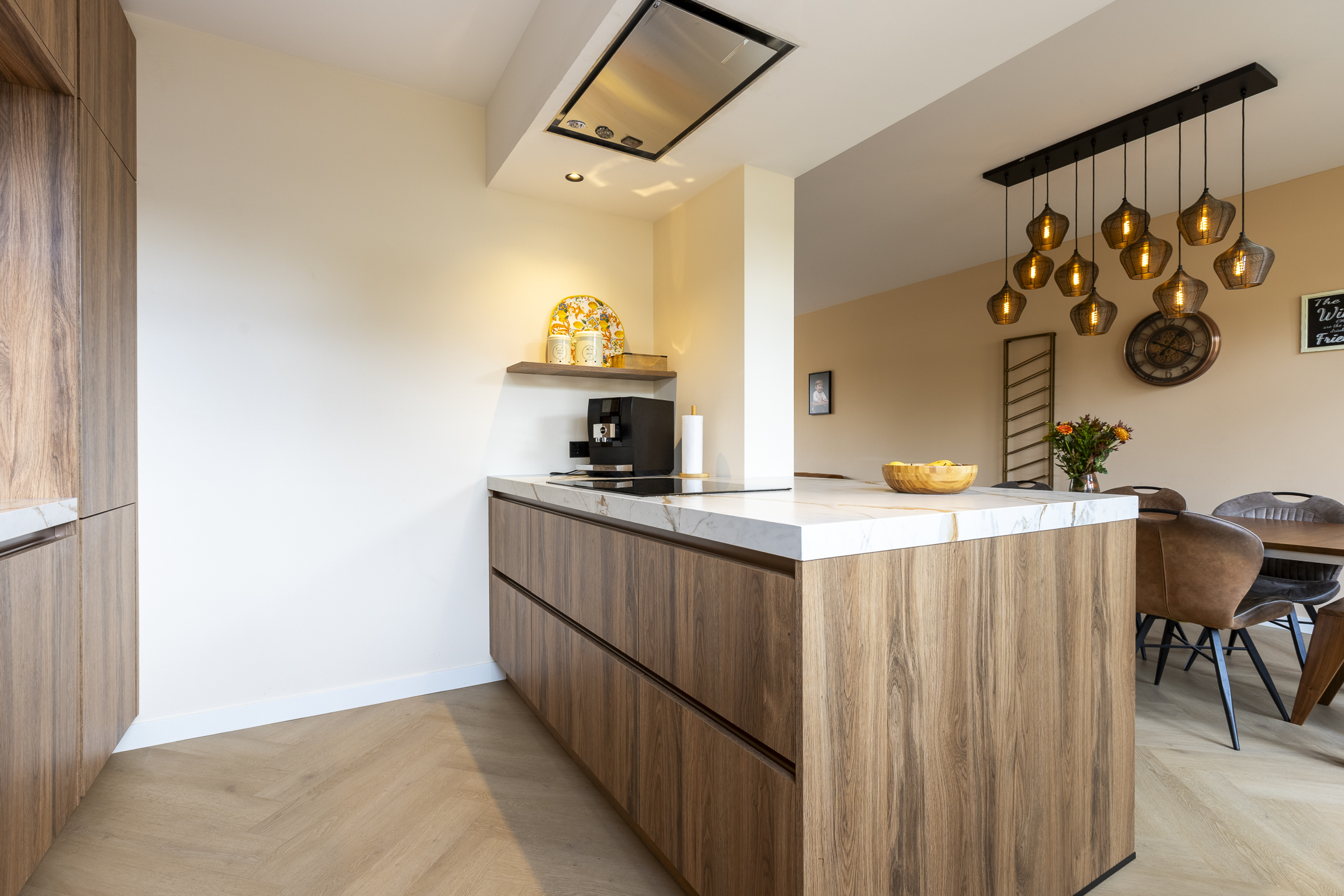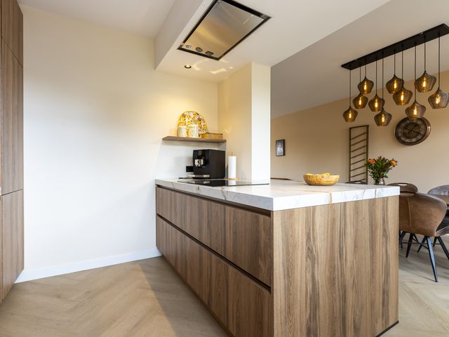Entree met meterkast, trapopgang en toiletruimte voorzien van toilet en urinoir. De tuingerichte woonkamer is licht en ruim, met een Pvc-visgraatvloer, gestuukte wanden en vloerverwarming. Via de openslaande deuren loopt u zo de onderhoudsvriendelijke tuin in. De moderne open keuken (2025) is voorzien van een kookeiland met inductiekookplaat, afzuiging, oven, quooker, vaatwasser en koel-vriescombinatie. Vanuit de keuken is tevens het luik naar de kruipruimte bereikbaar, wat extra praktische bergruimte biedt.