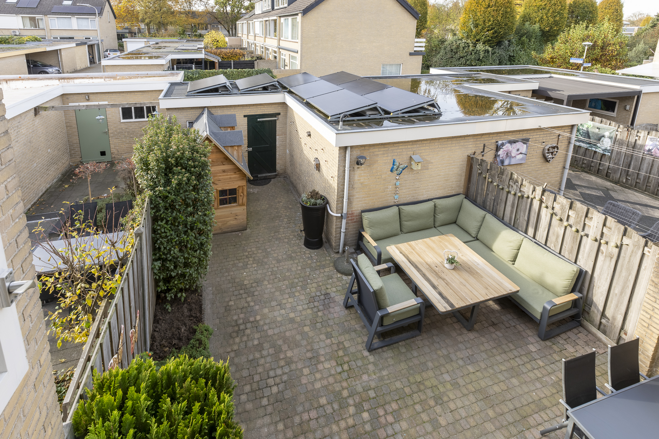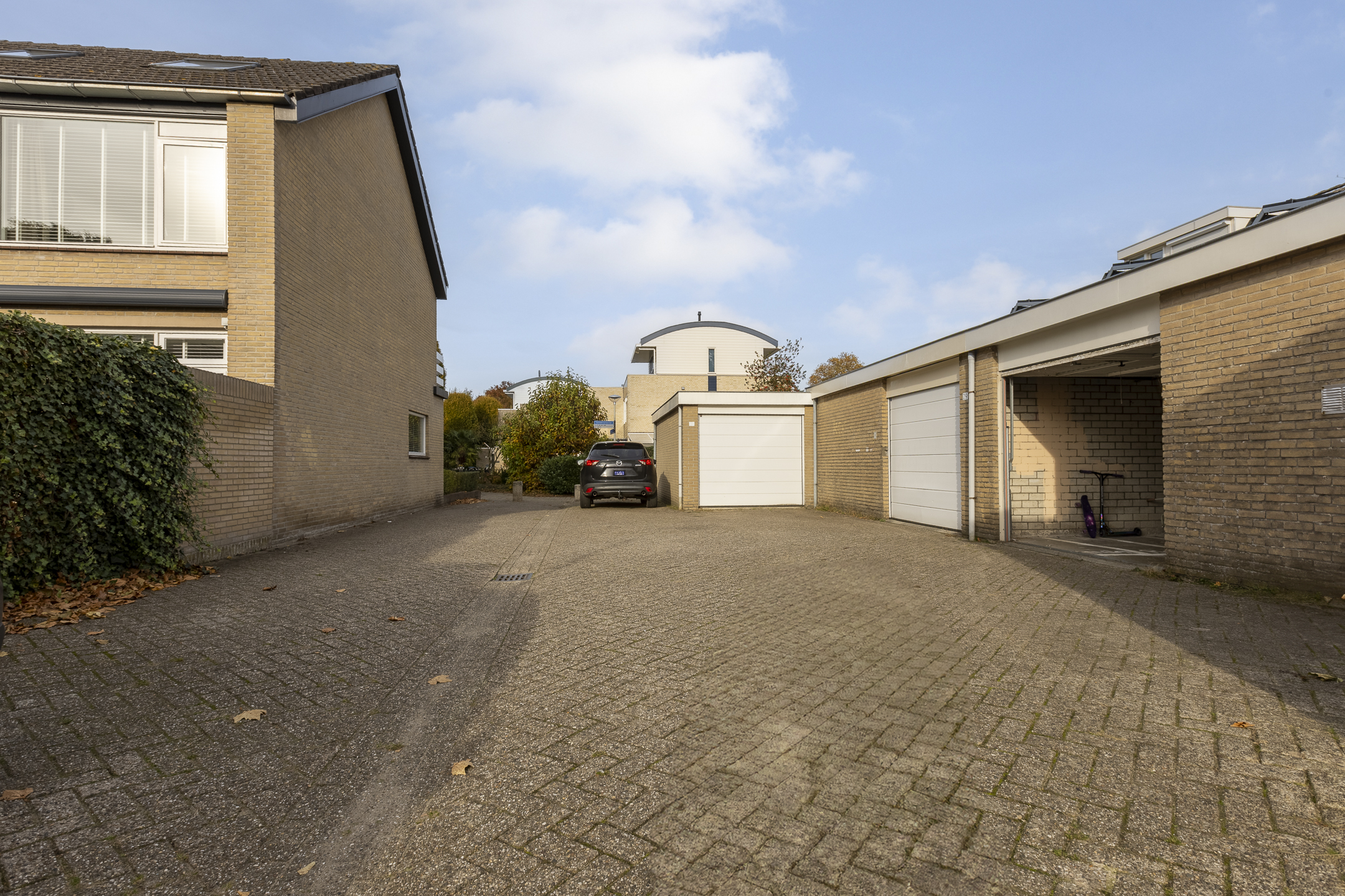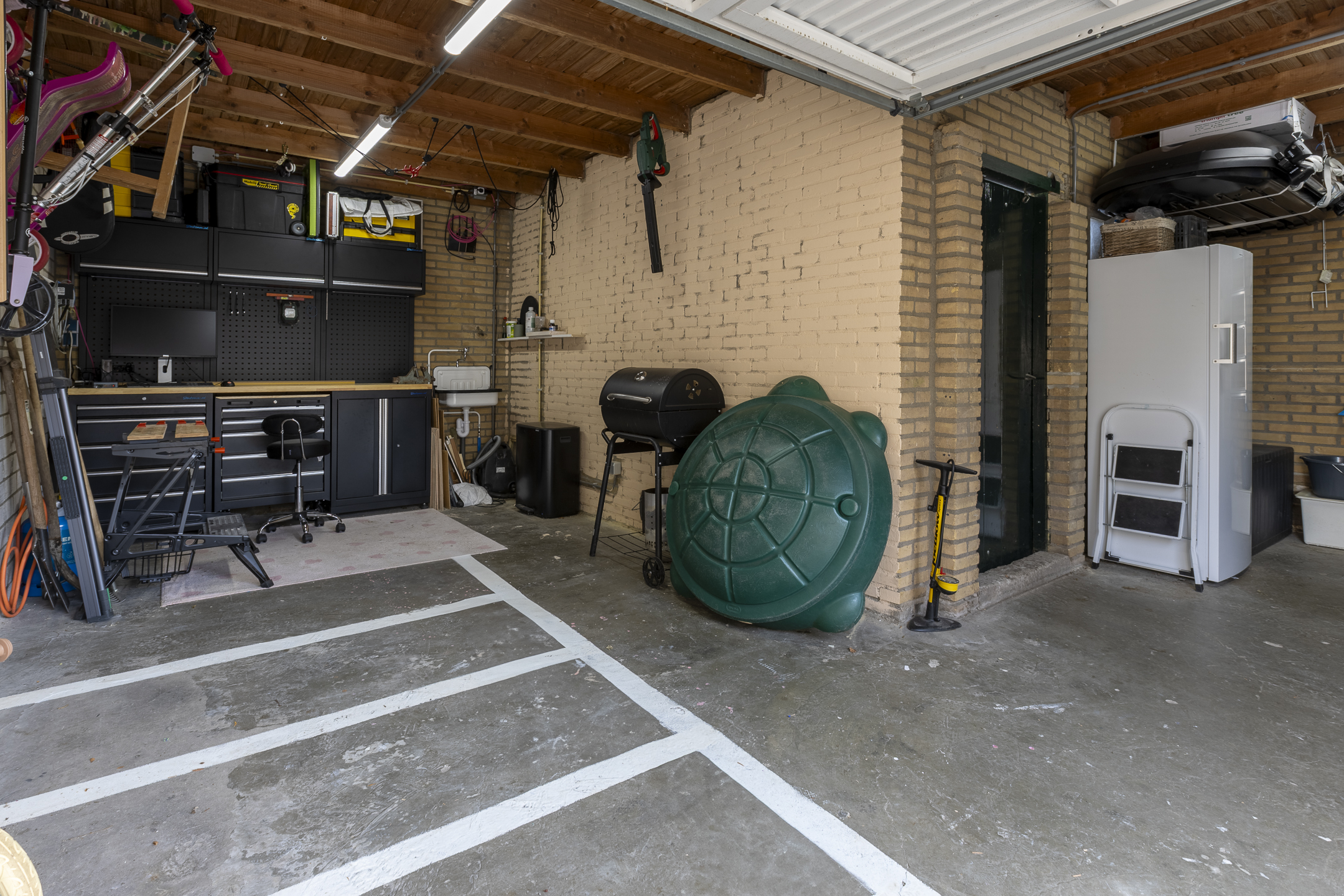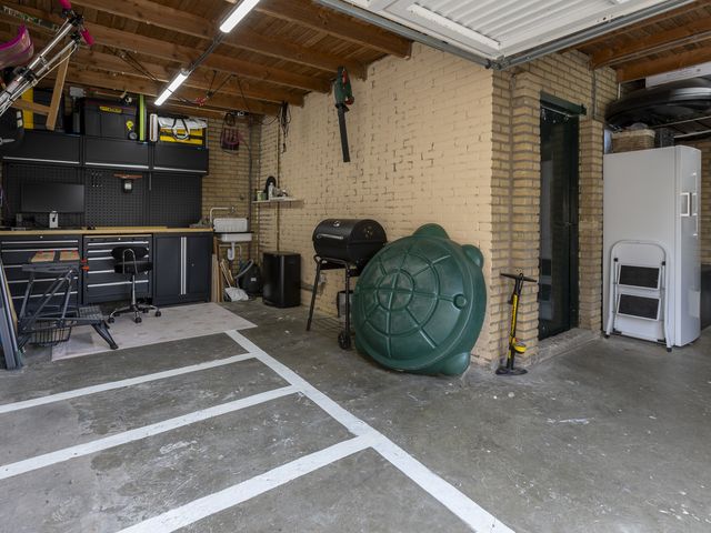 De onderhoudsvriendelijke tuin is volledig betegeld en biedt volop ruimte om te ontspannen of een loungehoek te creëren. Dankzij de ligging is er altijd een zonnig plekje te vinden. De garage is bereikbaar via een kanteldeur en beschikt over een aparte loopdeur, berging en stortbak, waardoor het een praktische ruimte is voor zowel de auto als extra opslag.