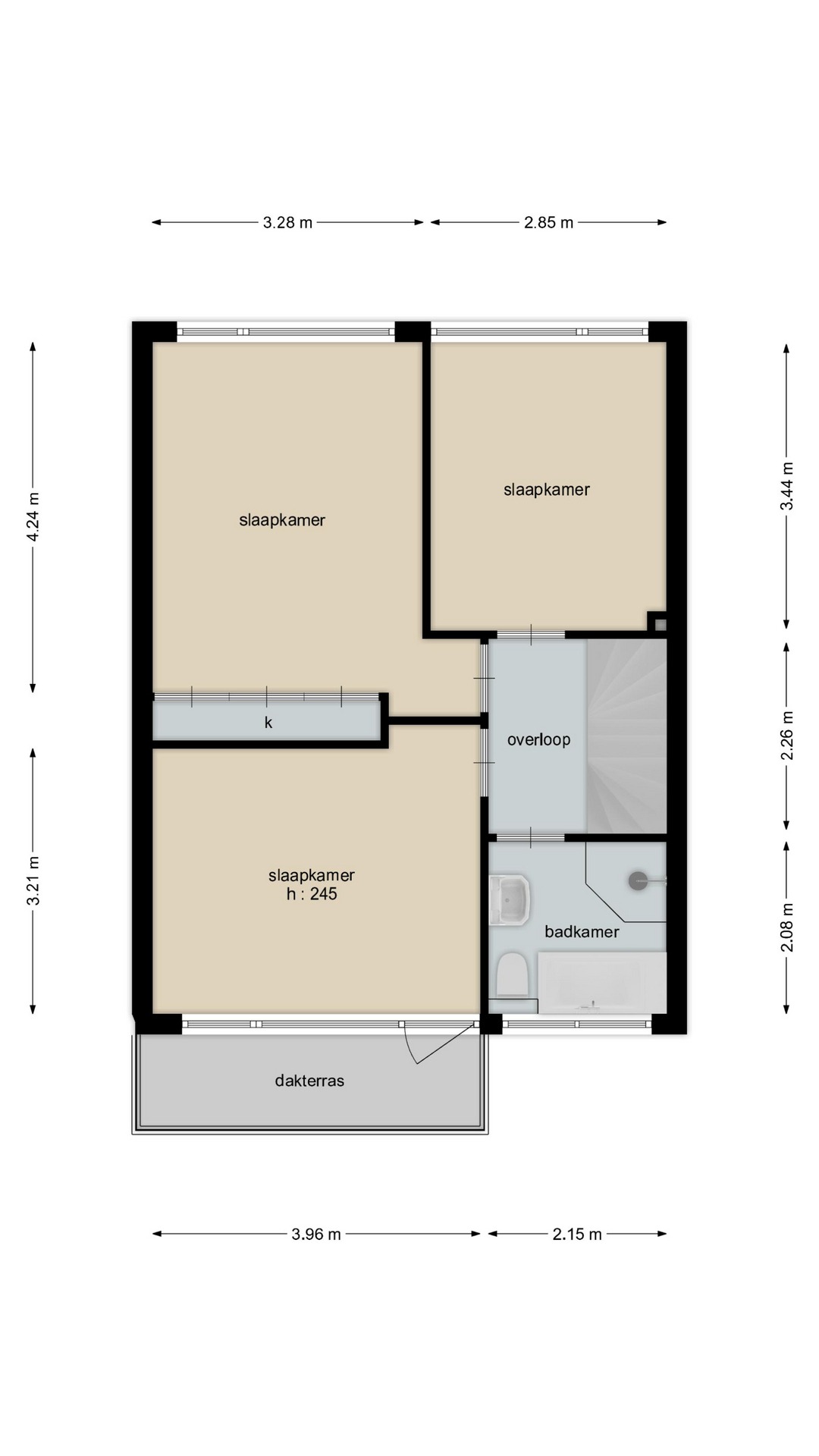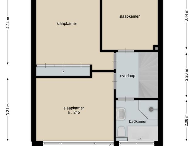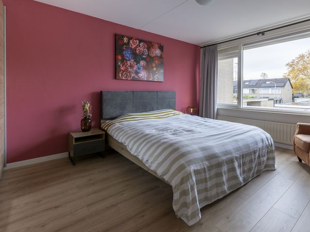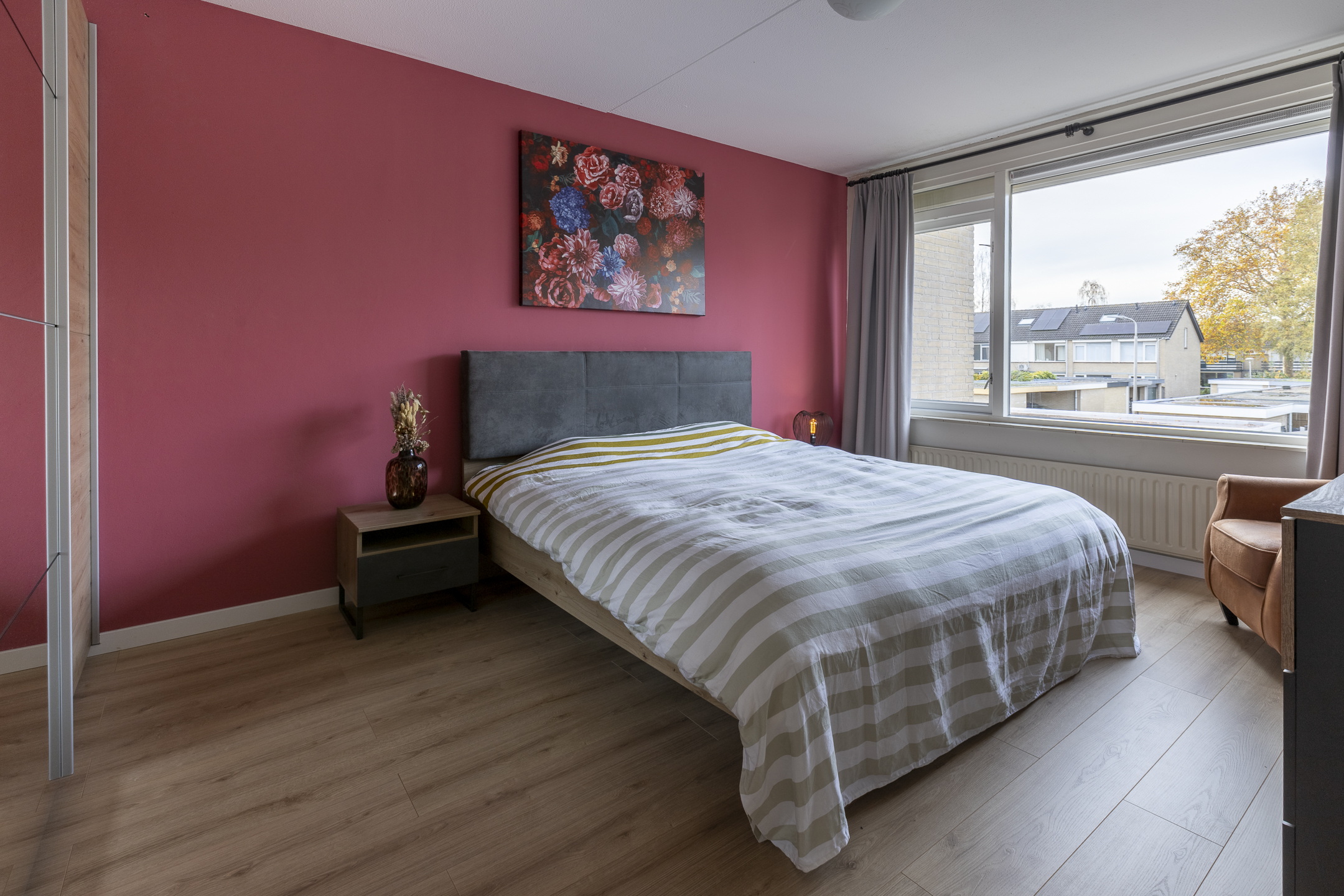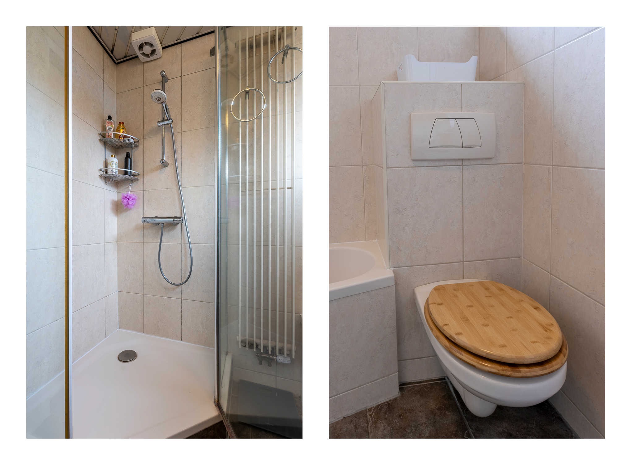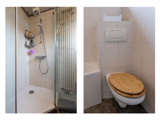 De overloop geeft toegang tot drie slaapkamers, volledig voorzien van laminaatvloer. De slaapkamer aan de voorzijde beschikt over een deur naar het balkon. Aan de achterzijde bevinden zich twee slaapkamers, waarvan één is uitgerust met een praktische kastenwand en een handmatig bedienbaar rolluik. De badkamer is voorzien van ligbad, douche, toilet en wastafel.