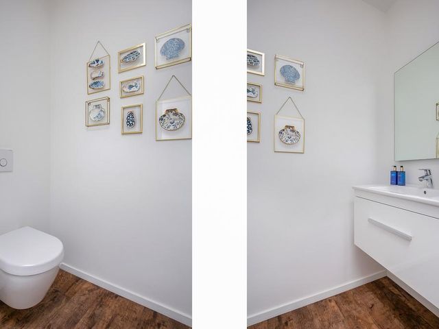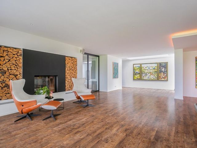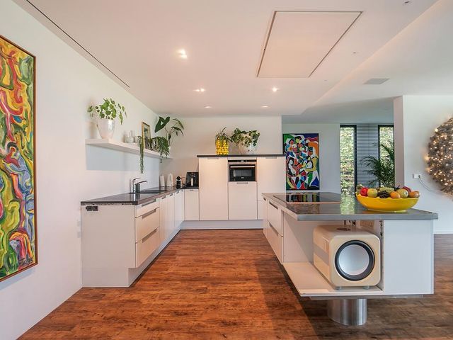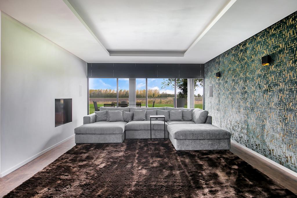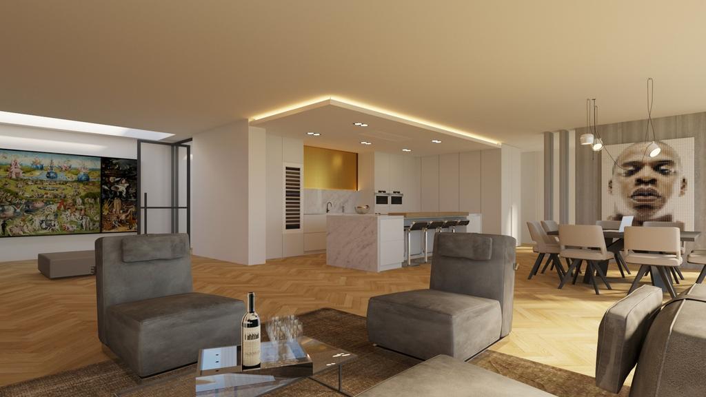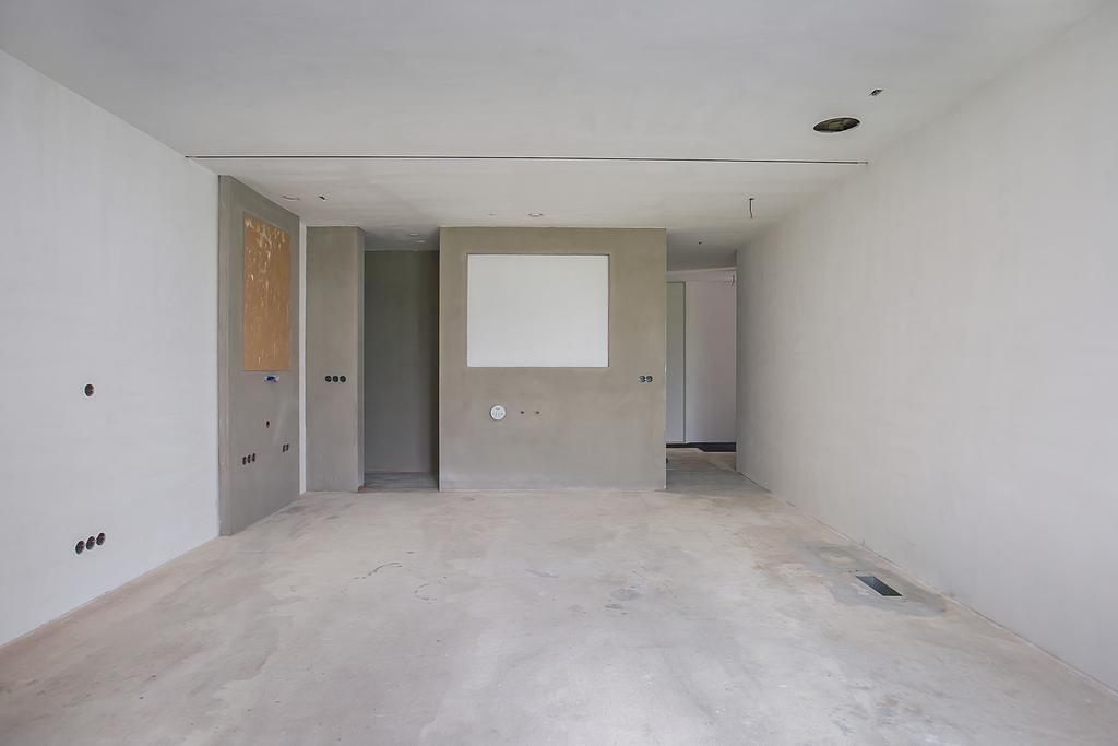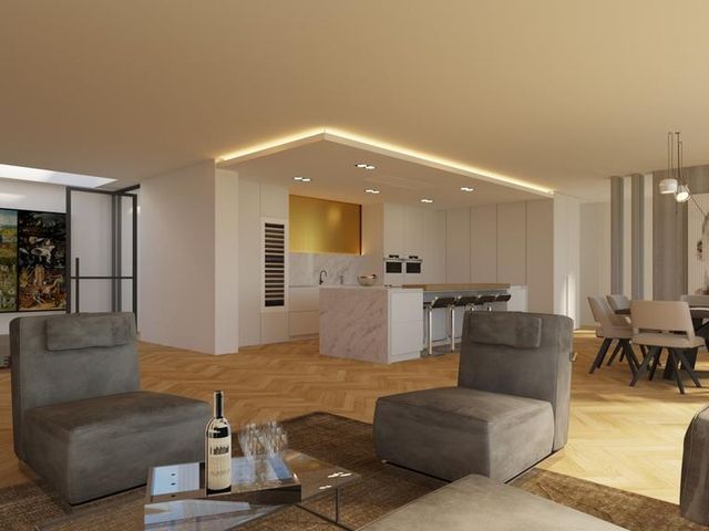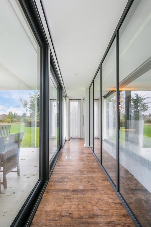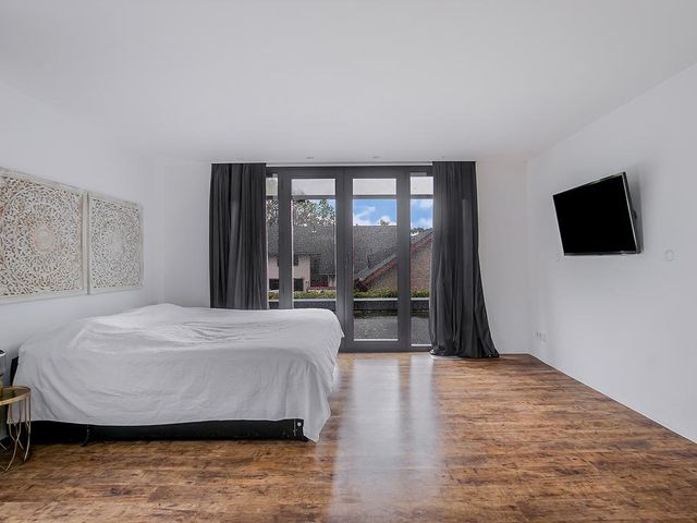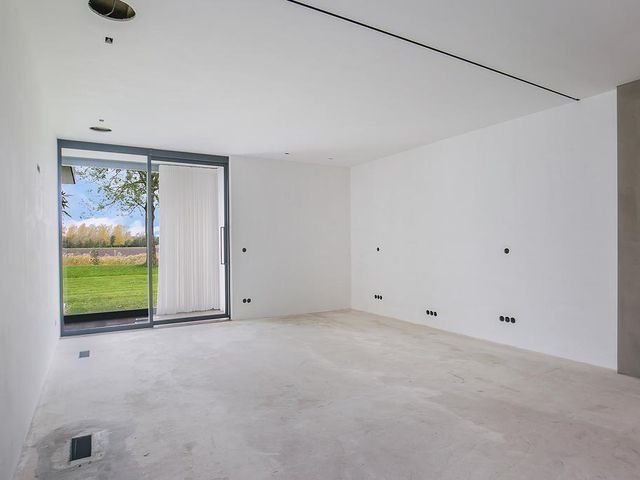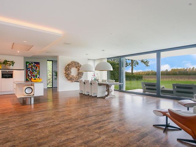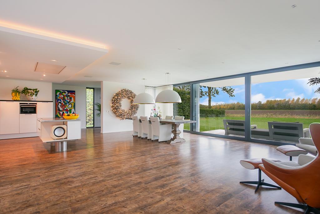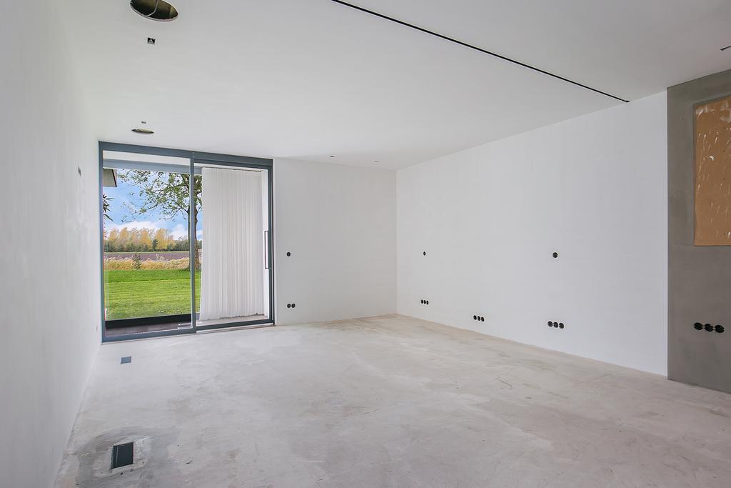 Riante woon-/eetkeuken met prachtig uitzicht, voldoende ruimte voor een grote eettafel een er is een gezellig zitje aanwezig bij de design haard. Open keuken met kookeiland voorzien van alle inbouwapparatuur. Zij uitgang met opstelling meterkast en nog mogelijkheid voor kantoorruimte of speelruimte voor kinderen. Separate en sfeervolle woonkamer woonkamer middels glazen deuren te bereiken vanuit woonkeuken. Aan de rechterzijde van de woning is een ruimte aanwezig van circa 50 m2. Hier zijn alle voorbereiden getroffen voor een fraaie slaapgelegenheid met eigen badkamer en suite, toiletruimte en dressing. Deze ruimte dient alleen nog cosmetisch te worden afgemaakt en badkamer te worden geïnstalleerd. De gehele begane grond is voorzien van een laminaatvloer.
