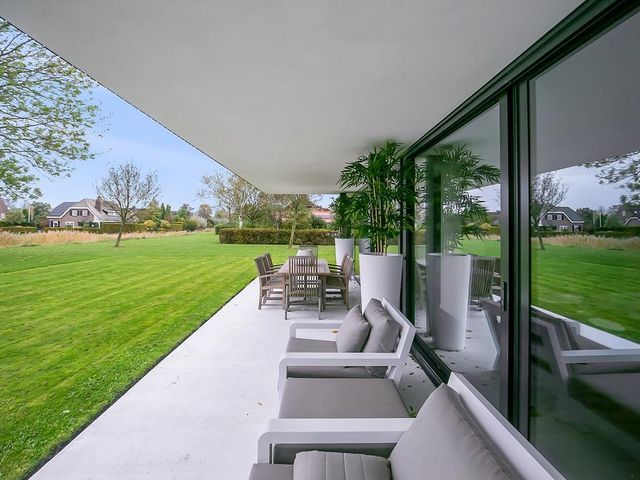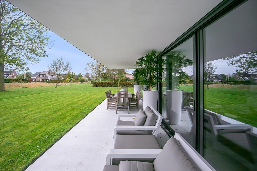Keurig aangelegde tuin rondom met groenperken gazon en aan de achterzijde een overdekt terras aan hiis met voldoende ruimte voor een eettafel en een lounge set.