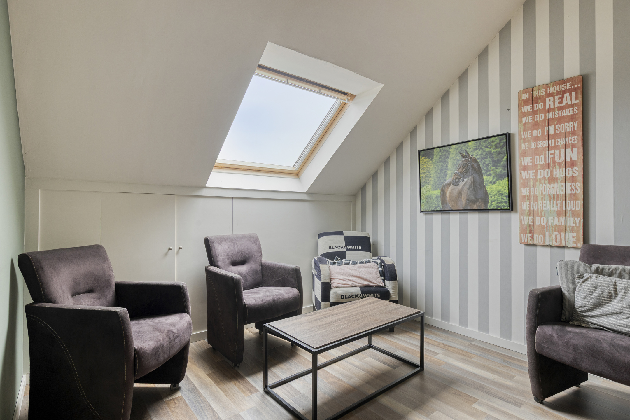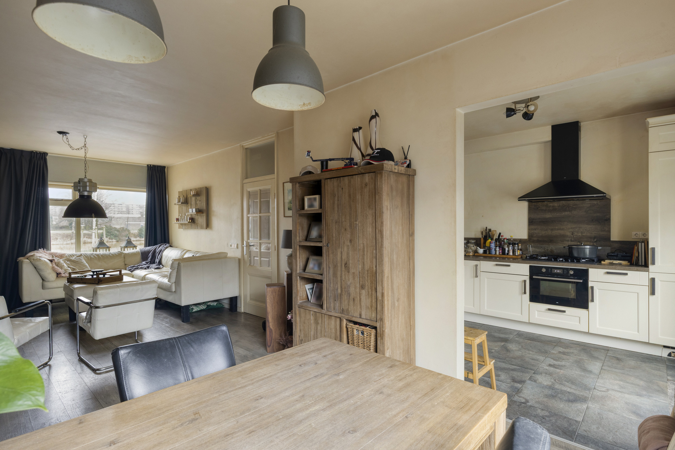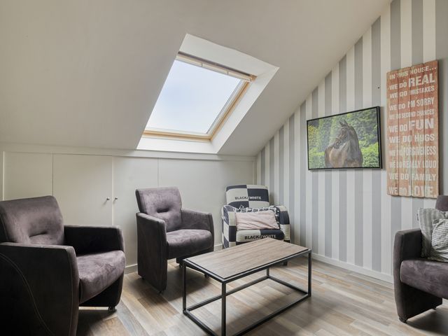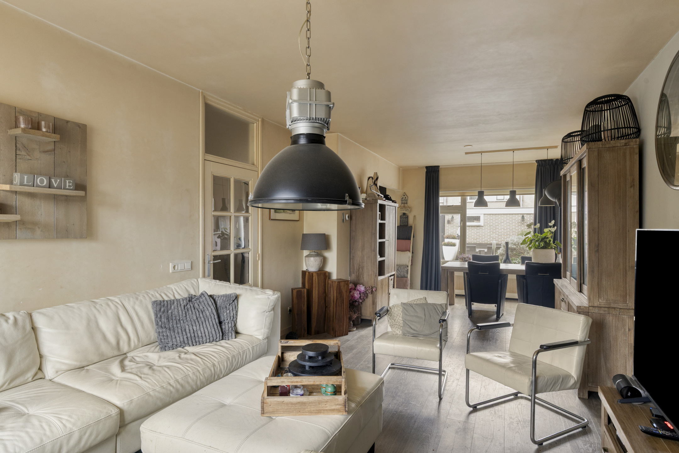 De ruime woonkamer is voorzien van een laminaatvloer, glad gestucte wanden en plafonds, houten kozijnen met dubbel glas en een screen.