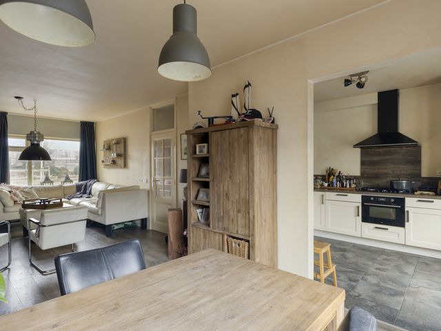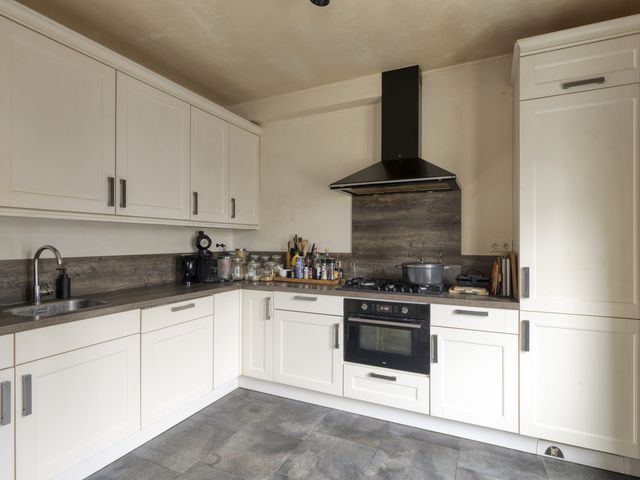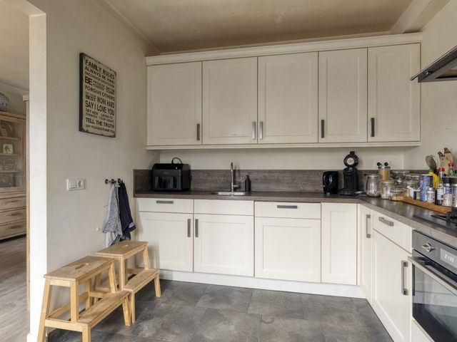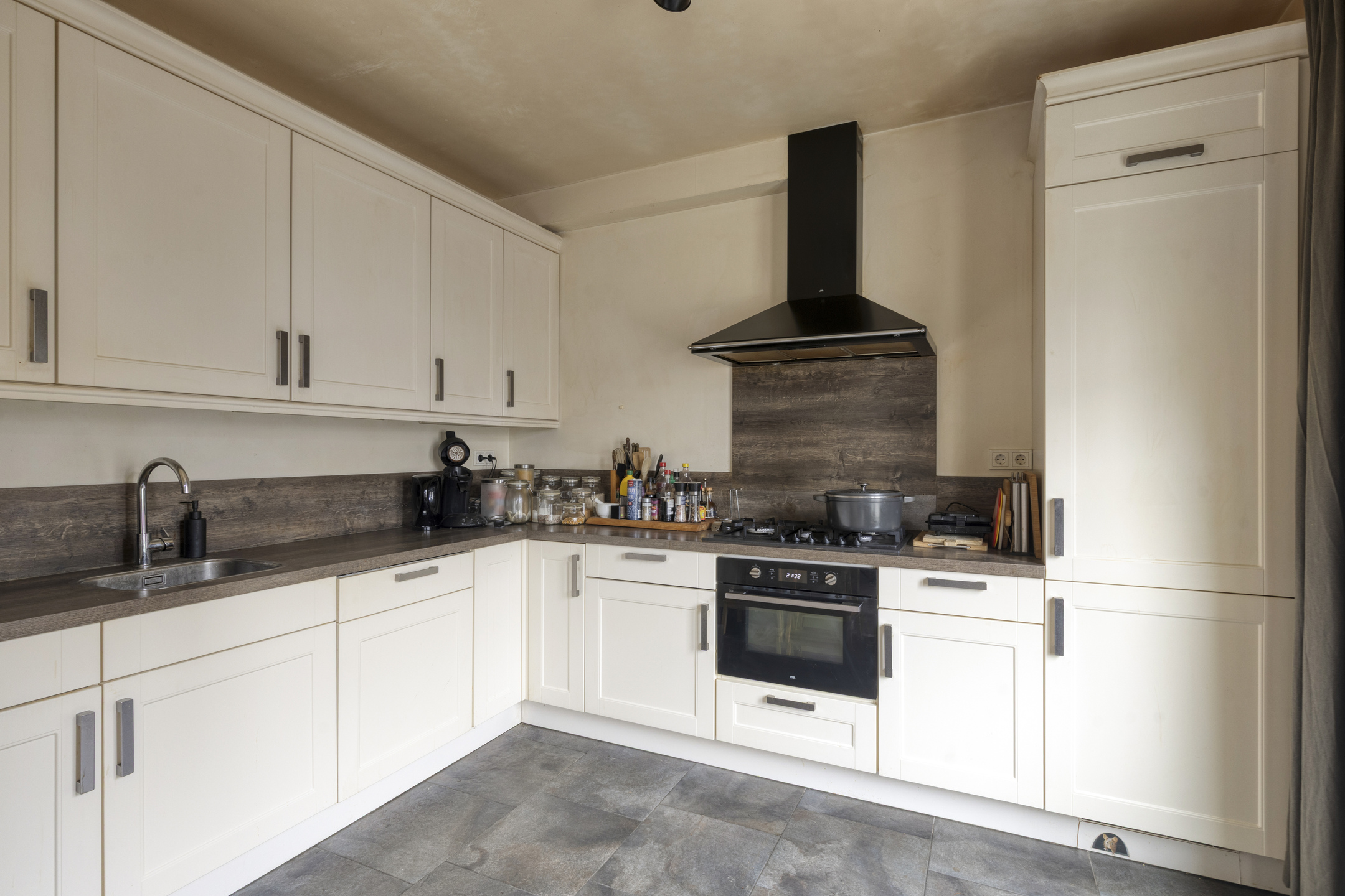 De moderne open keuken beschikt over diverse inbouwapparatuur, waaronder een vaatwasser, combi-oven, 5-pits gaskookplaat, koelkast, vriezer en afzuigkap. Verder is de keuken uitgerust met een RVS spoelbak en een houten werkblad. In de keuken is vloerverwarming aanwezig. Ook hier zijn houten kozijnen met dubbel glas toegepast.