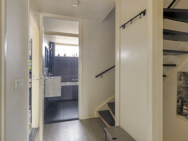 Entree/hal met laminaatvloer en toegang tot de moderne meterkast, de deels betegelde toiletruimte met toilet en fonteintje, de trapkast, de woonkamer en de trapopgang naar de eerste verdieping.