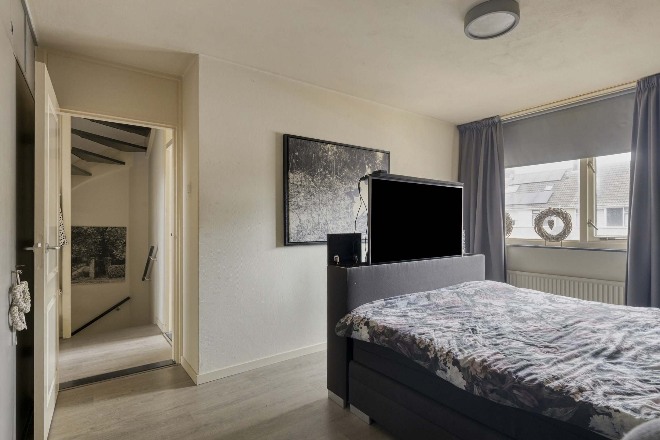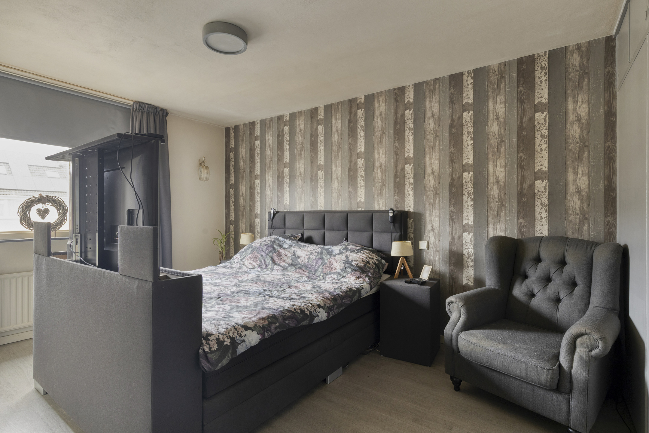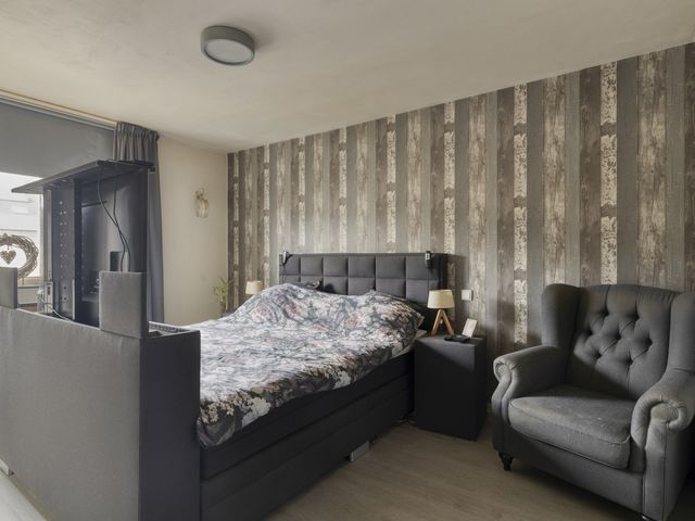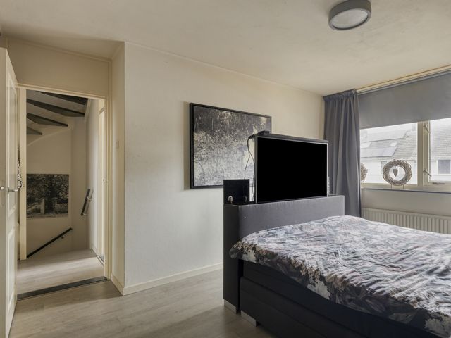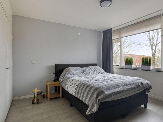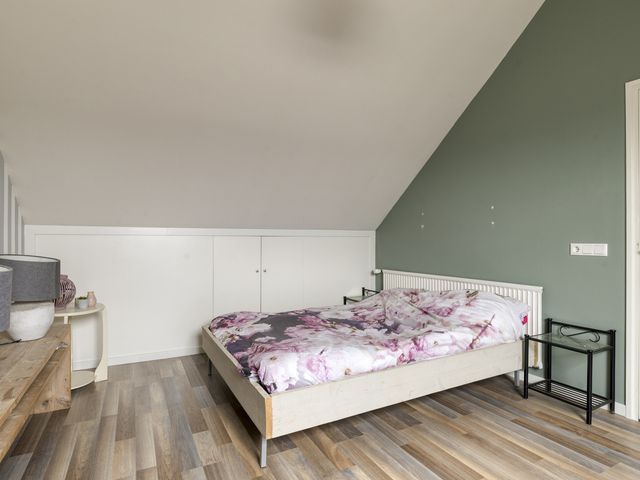 Slaapkamer I (voorzijde) is voorzien van een laminaatvloer, glad gestucte wanden en plafonds, houten kozijnen met dubbel glas, rolluiken en twee inbouwkasten.