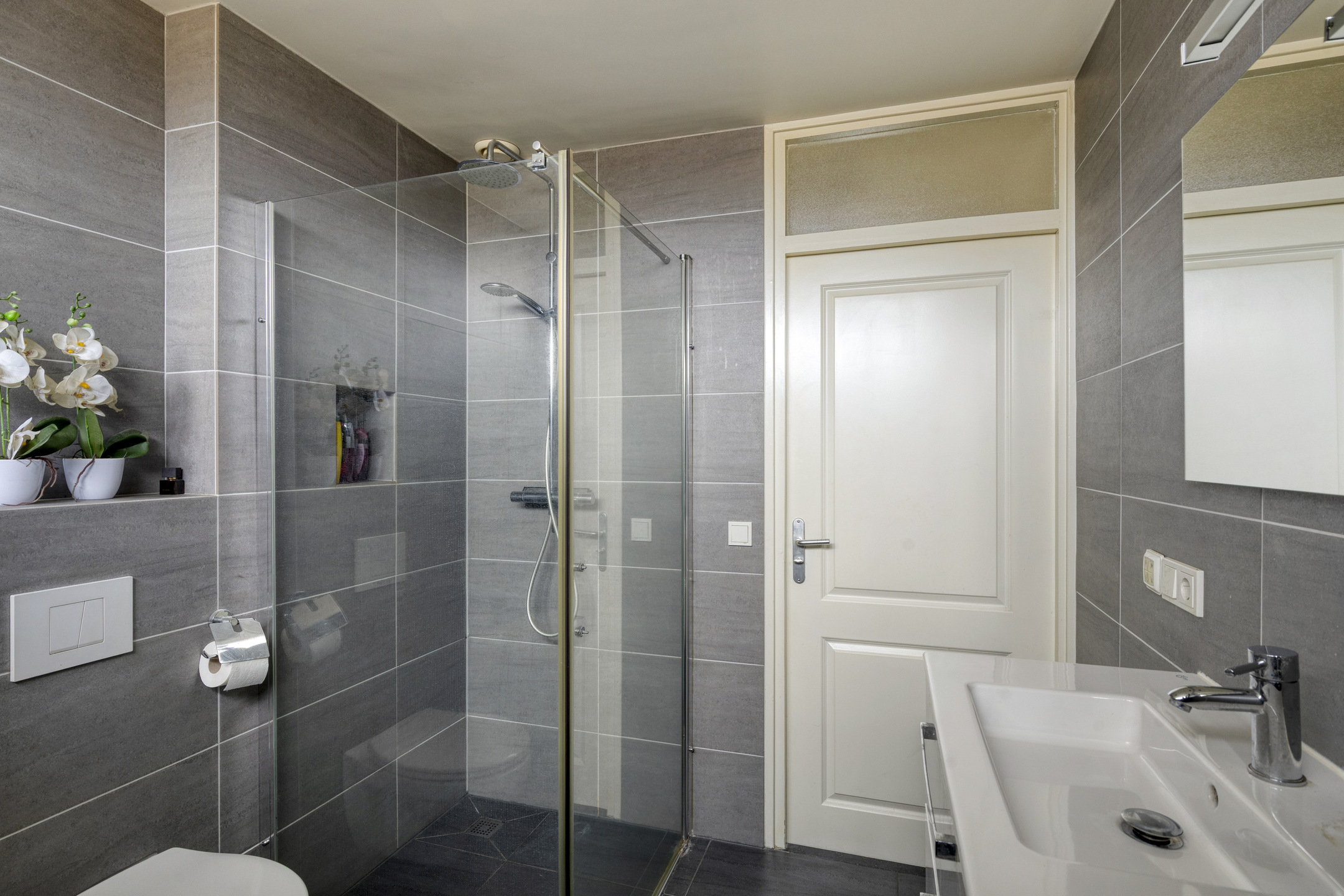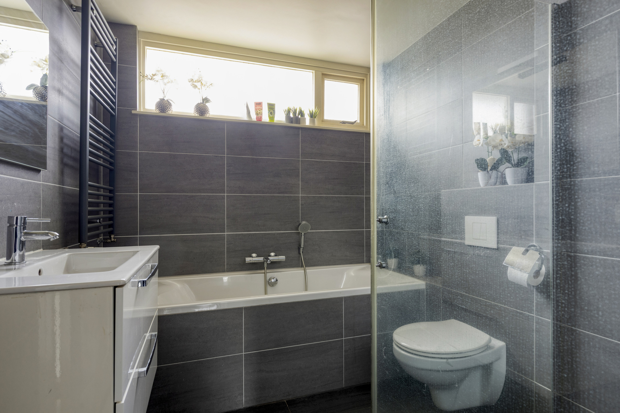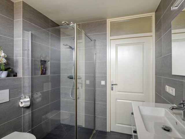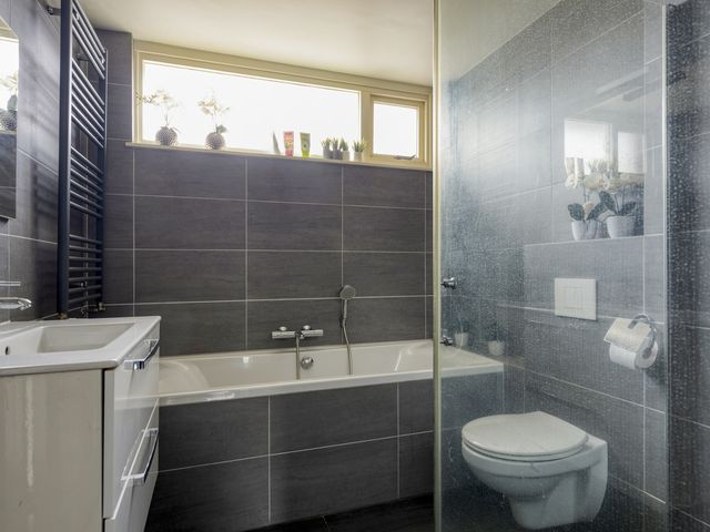 De volledig betegelde, moderne badkamer is voorzien van een wastafel, ligbad, toilet en een inloopdouche. Daarnaast beschikt de badkamer over vloerverwarming.