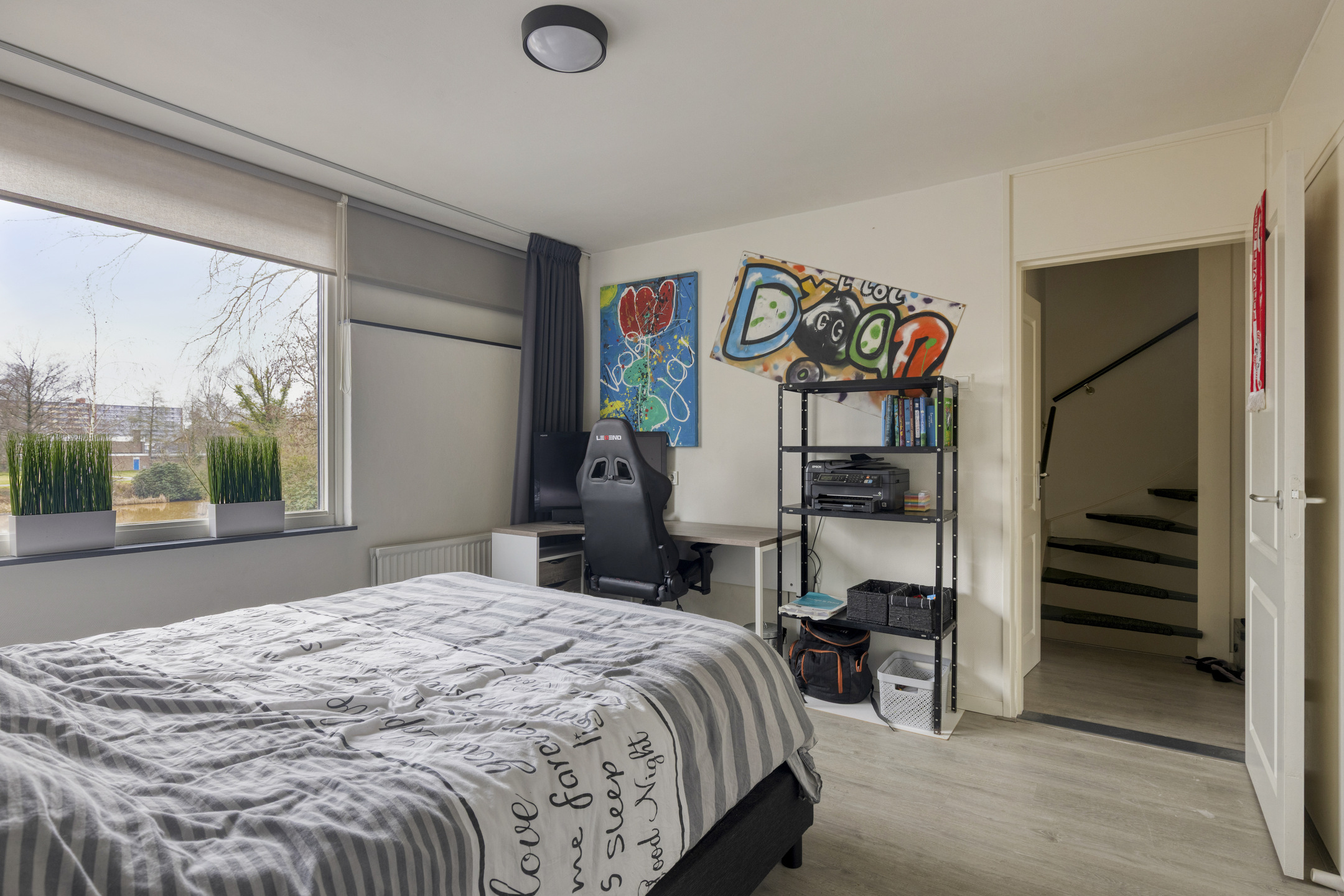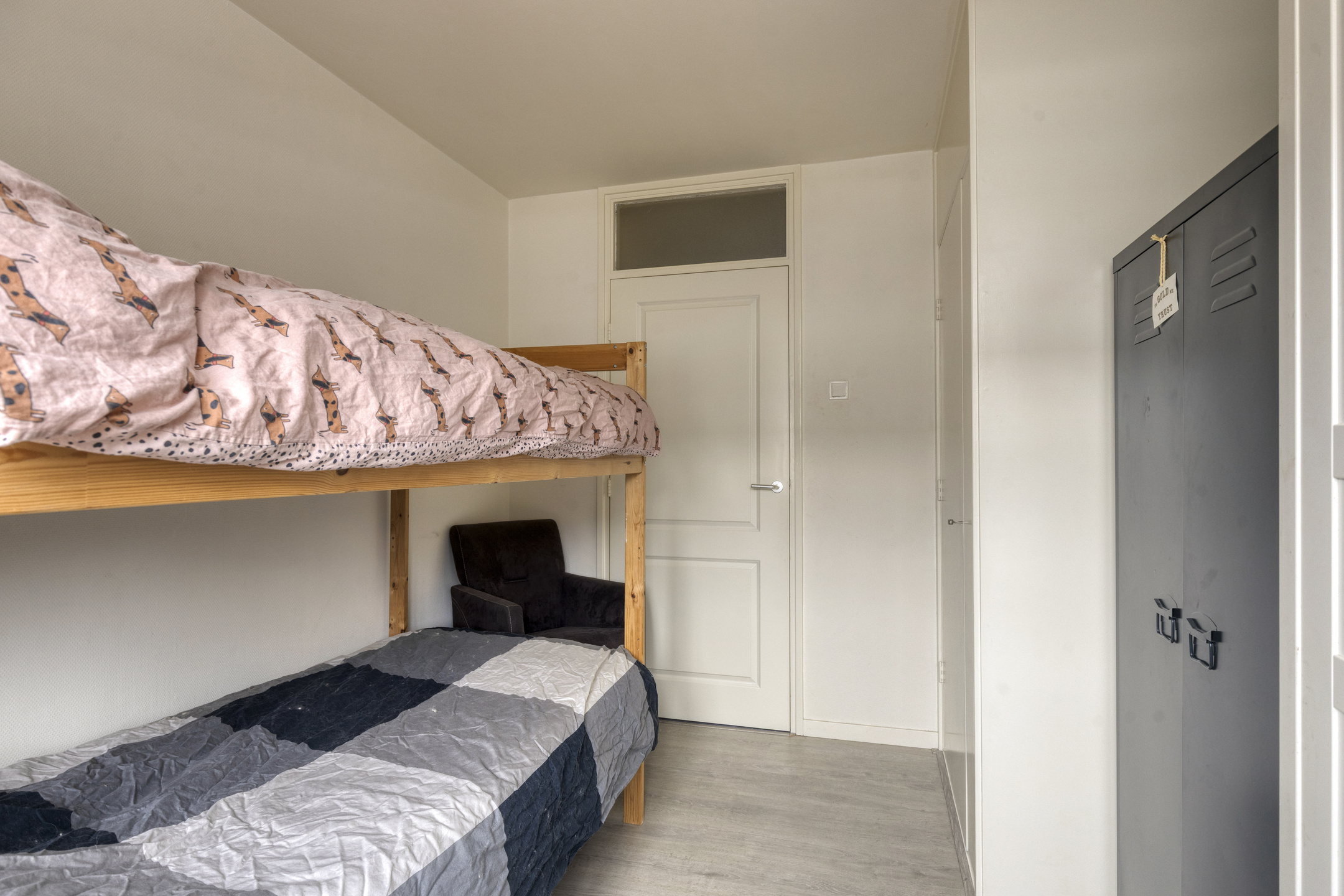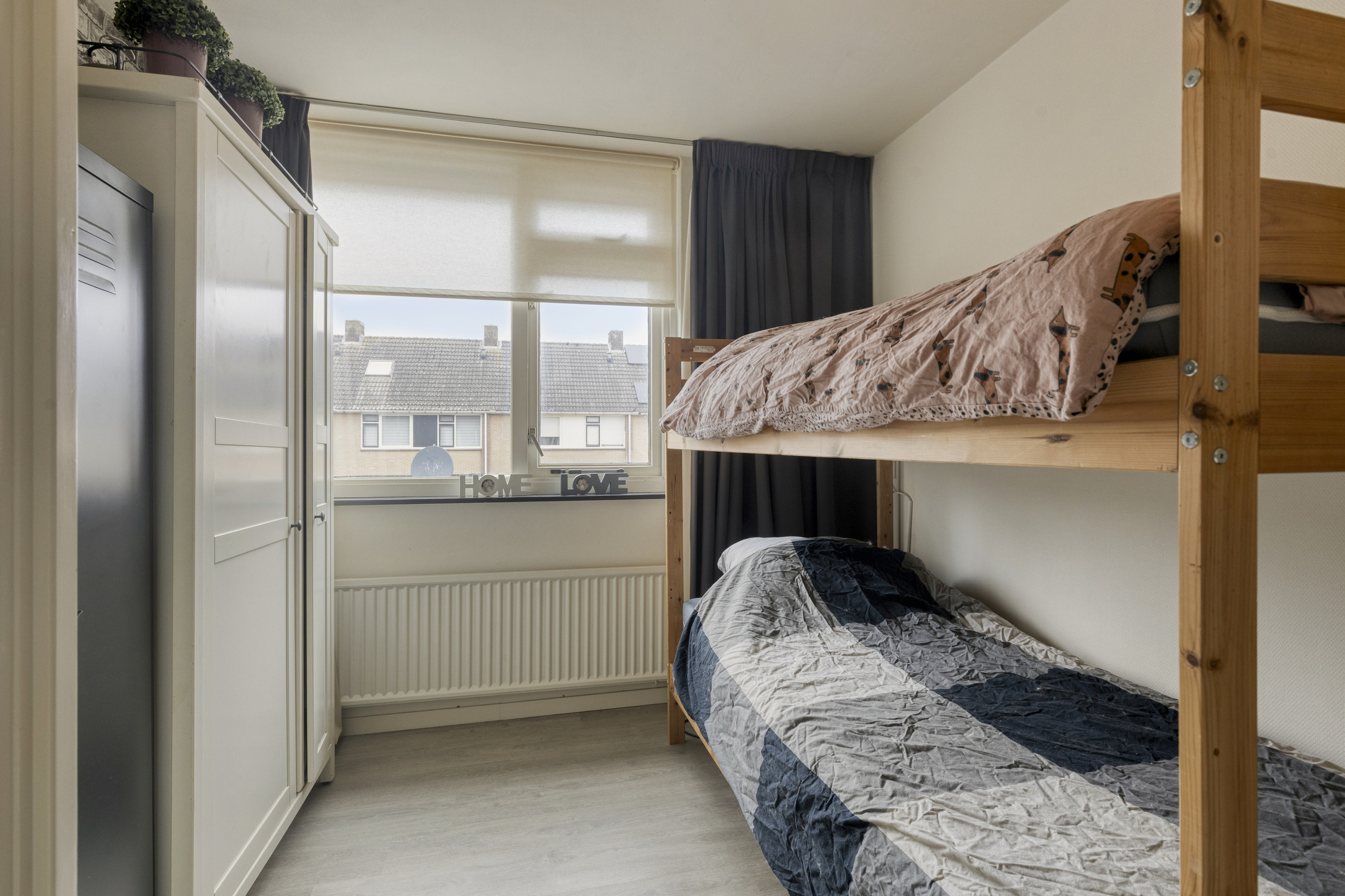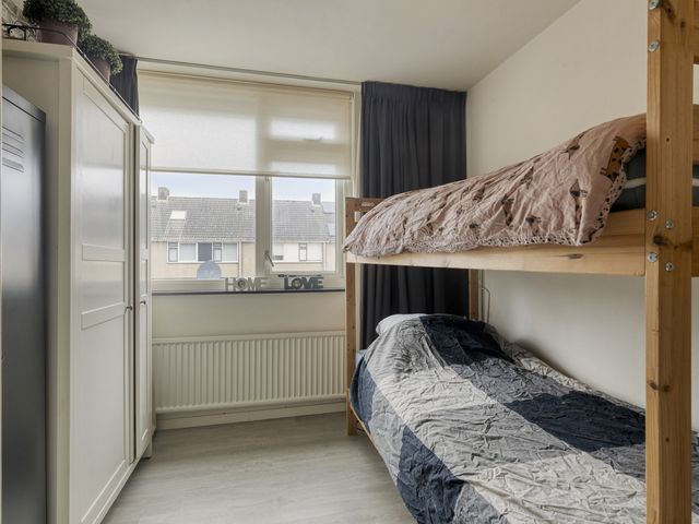 Slaapkamer III (achterzijde) is uitgevoerd met een laminaatvloer, glad gestucte wanden en plafonds, houten kozijnen met dubbel glas, rolluiken en twee inbouwkasten.
