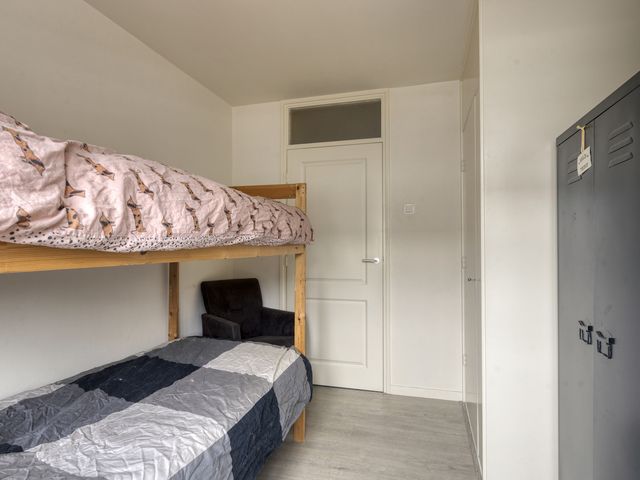 Slaapkamer II (achterzijde) beschikt eveneens over een laminaatvloer, glad gestucte wanden en plafonds, houten kozijnen met dubbel glas, rolluiken en twee inbouwkasten.