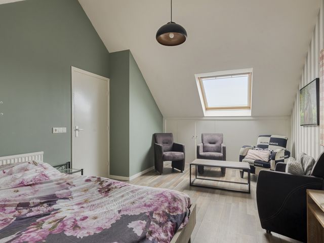 Slaapkamer IV, gelegen op zolder, is afgewerkt met een laminaatvloer, glad gestucte wanden en plafonds en beschikt over een houten dakraam met dubbel glas.