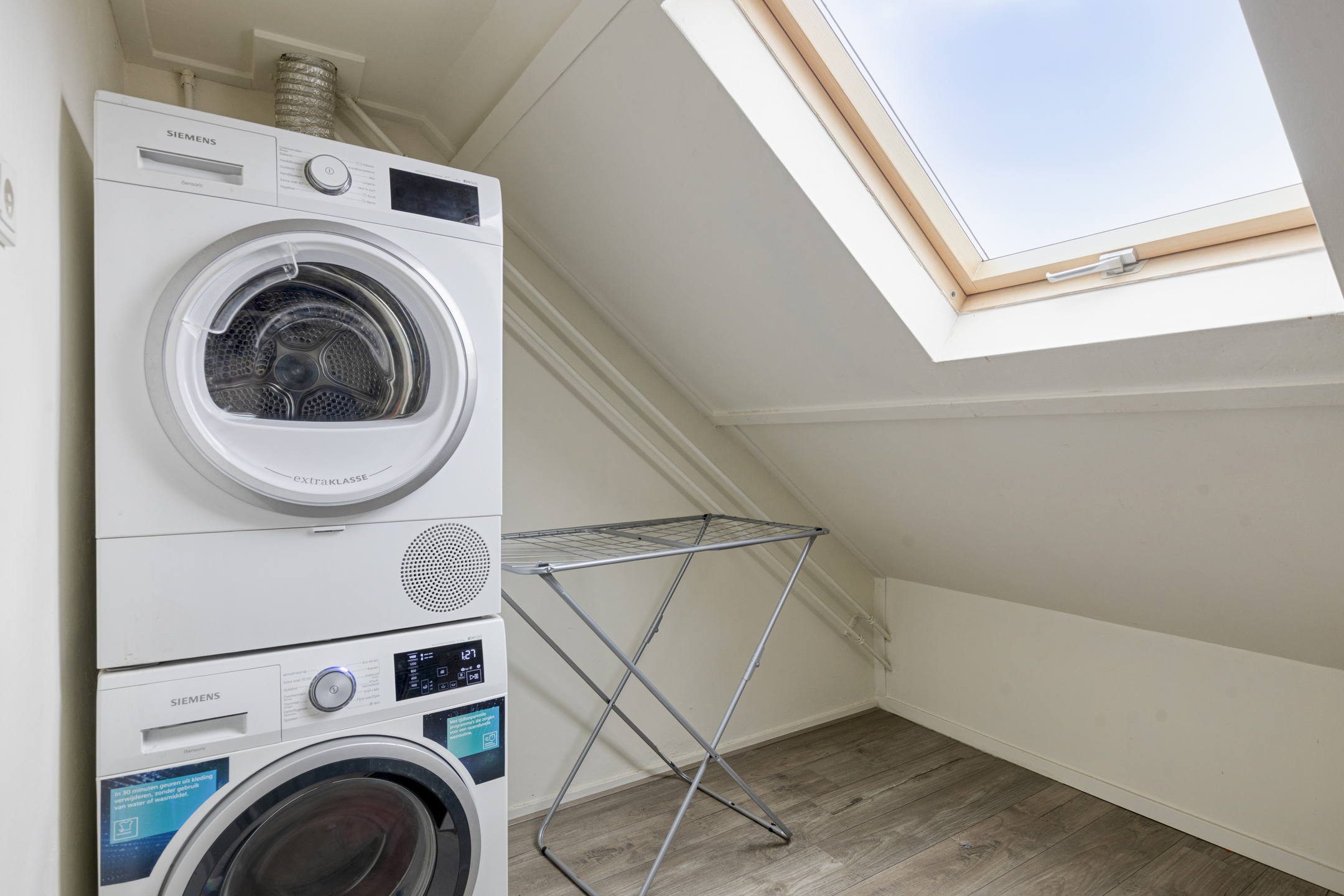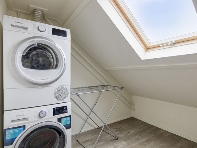 Het washok is voorzien van een wasmachineaansluiting en een houten dakraam met dubbel glas.