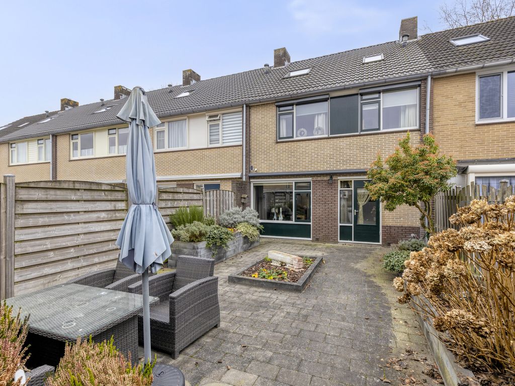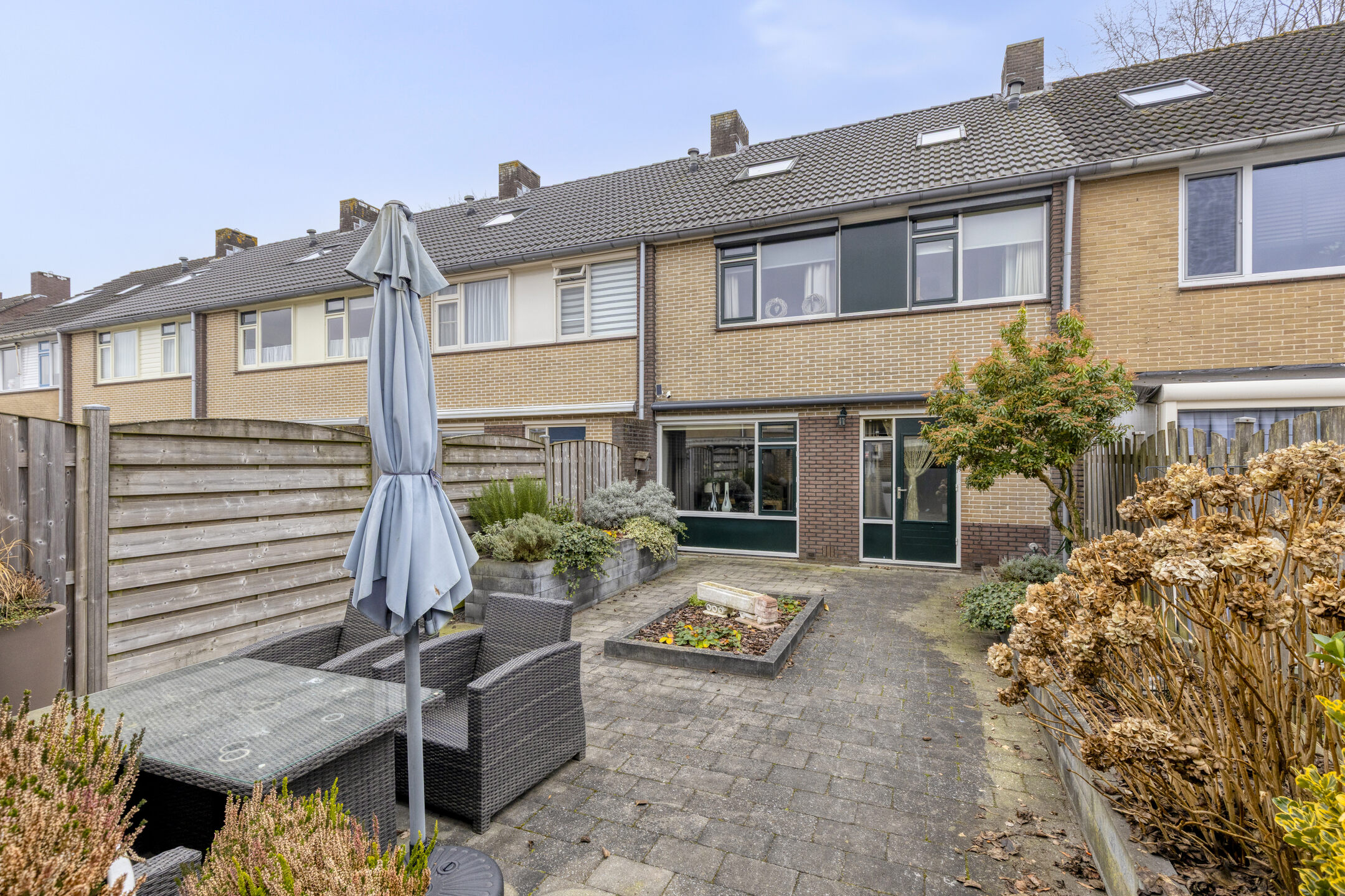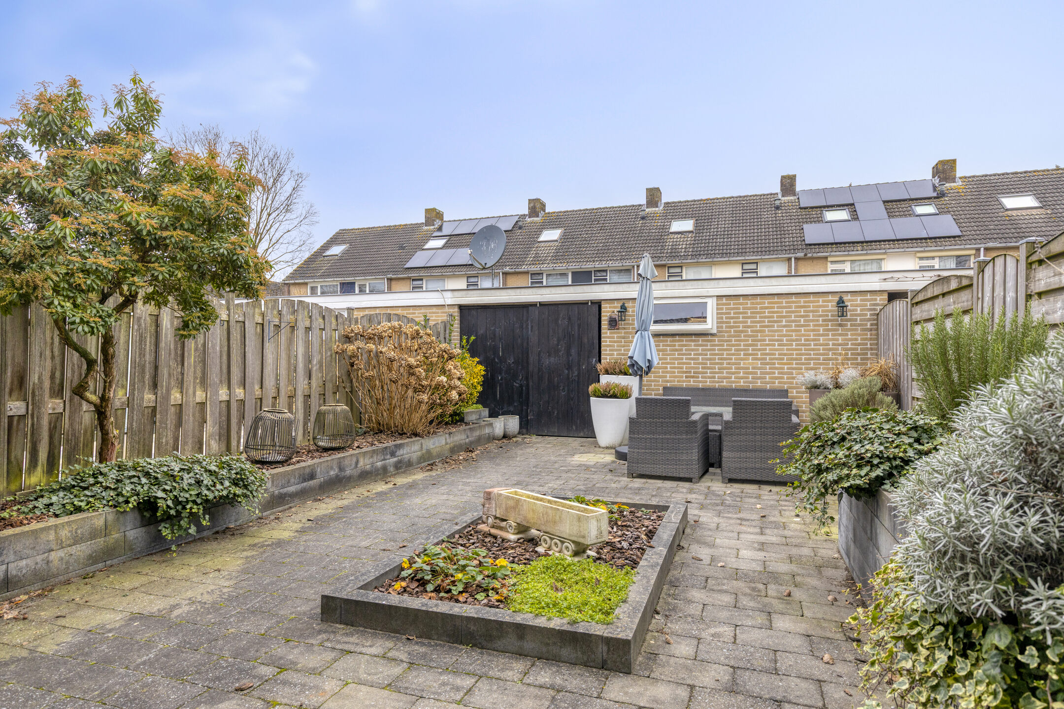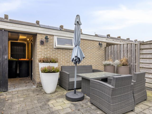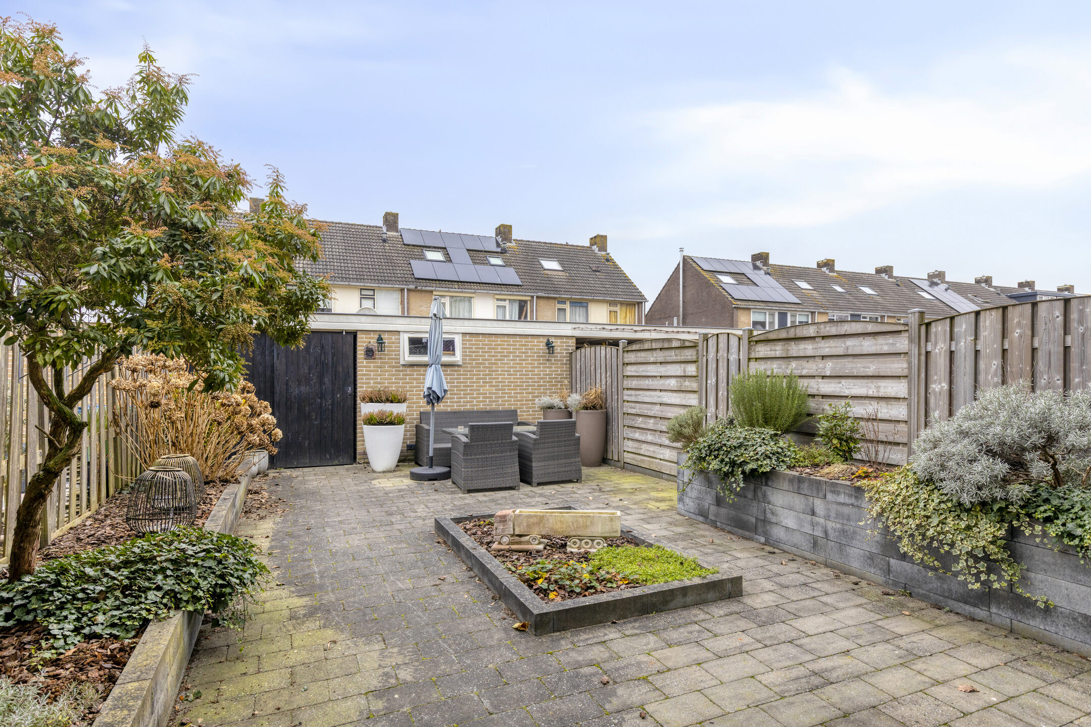 De achtertuin, gelegen op het noordwesten, is voorzien van een zonnescherm, camera’s, een achterom en een stenen berging. De berging beschikt over elektra.