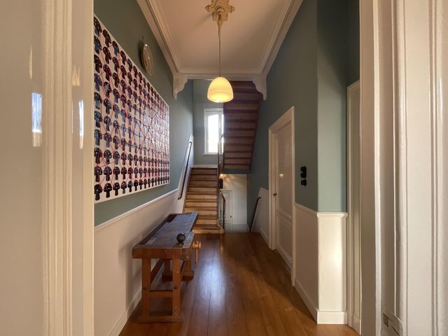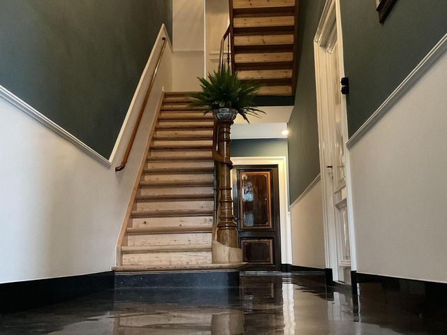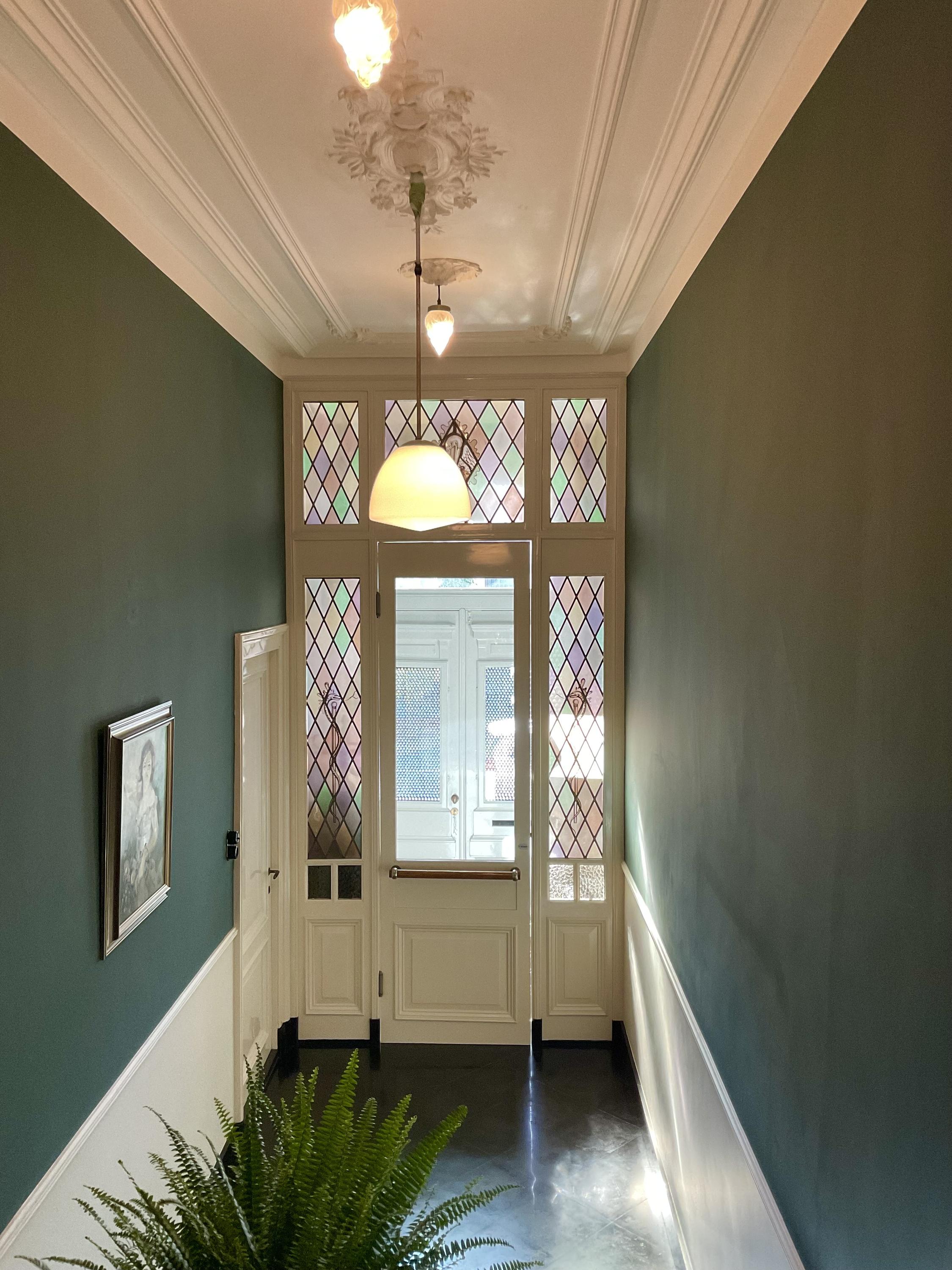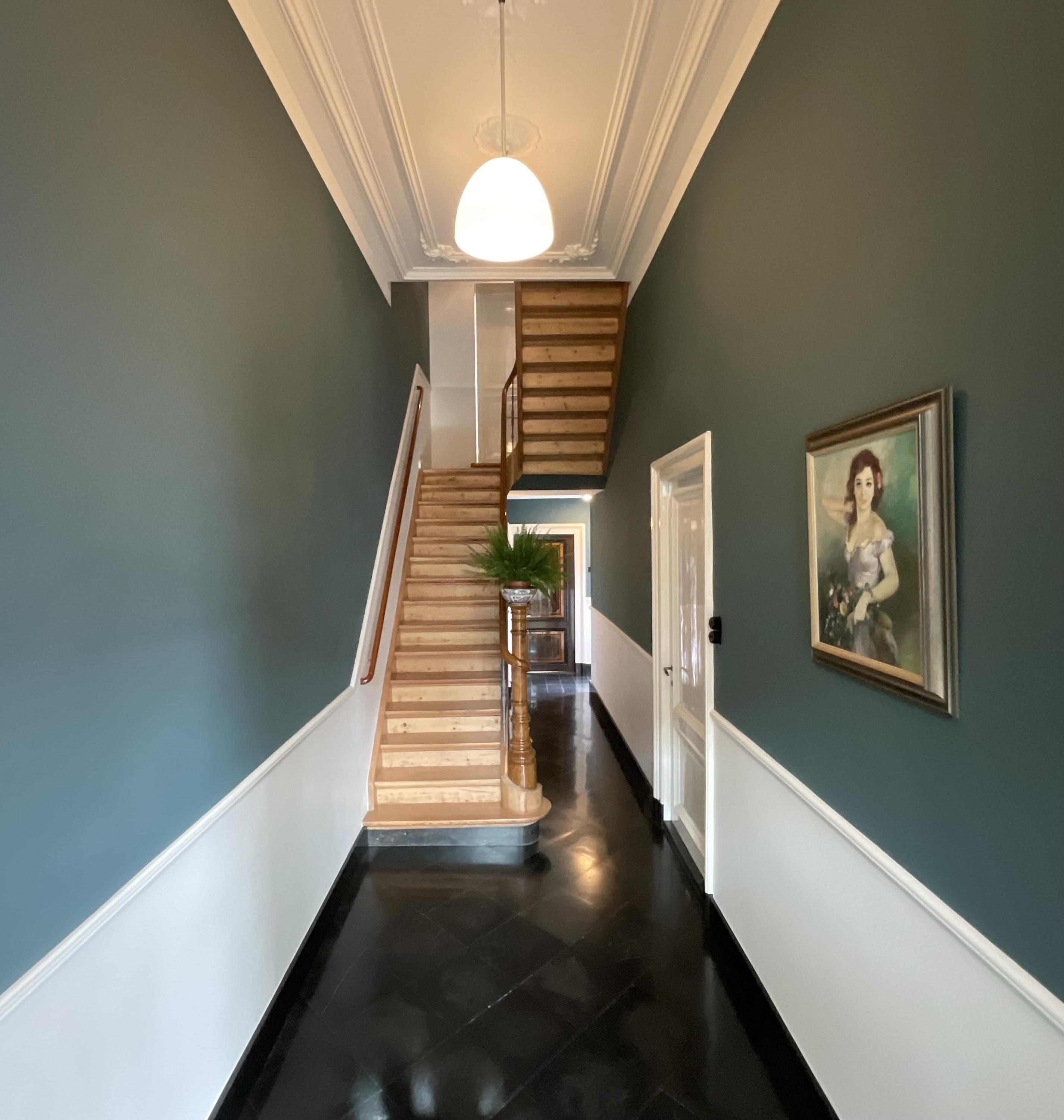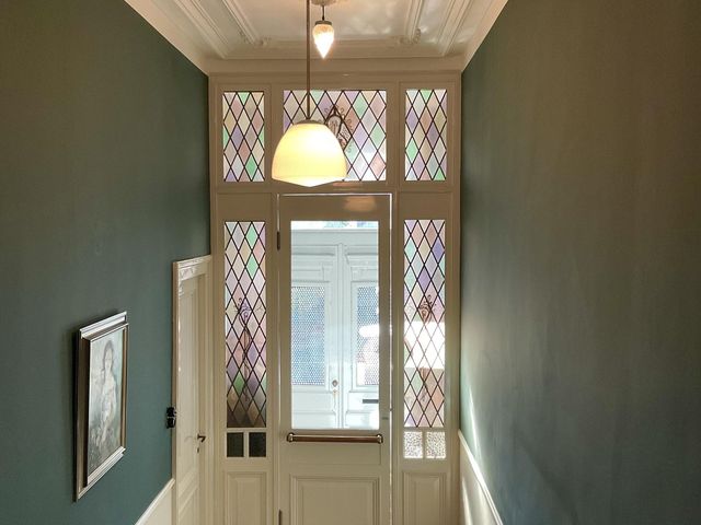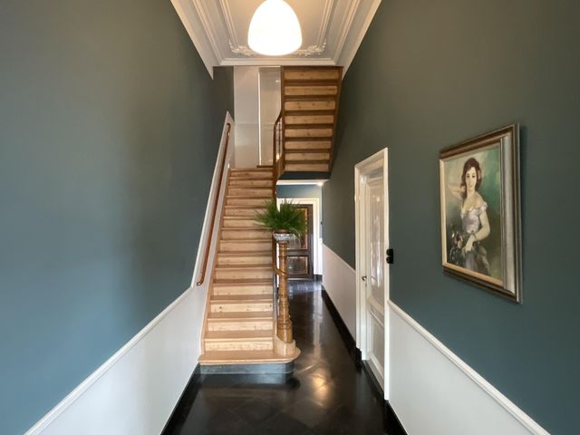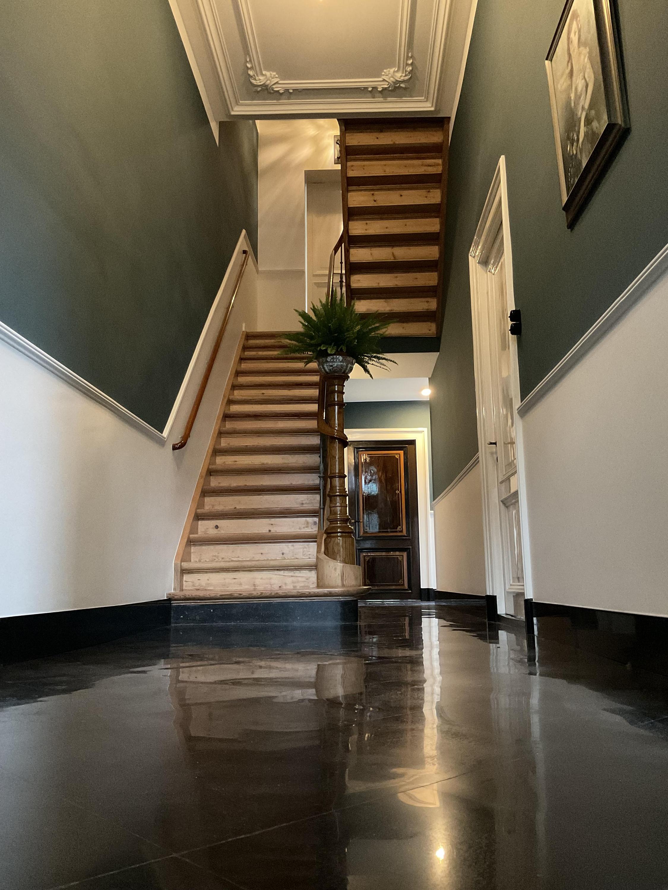 Na het zien van de karakteristieke gevel, de imposante dubbele voordeur en het opgaan van de vier arduinen traptreden is het geduldig wachten in het voorportaal bijna ondoenlijk. Neem in de statige hal zeker de tijd om de binnenkomst op u in te laten werken. Van het Noors leistenen vloer tot het fraaie sierlijke plafond hoog boven u. In de lange hal valt ons oog op de imposante trap.