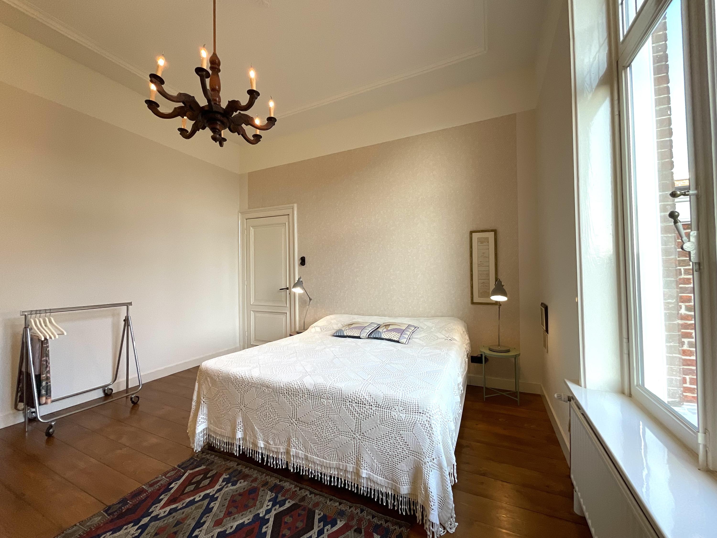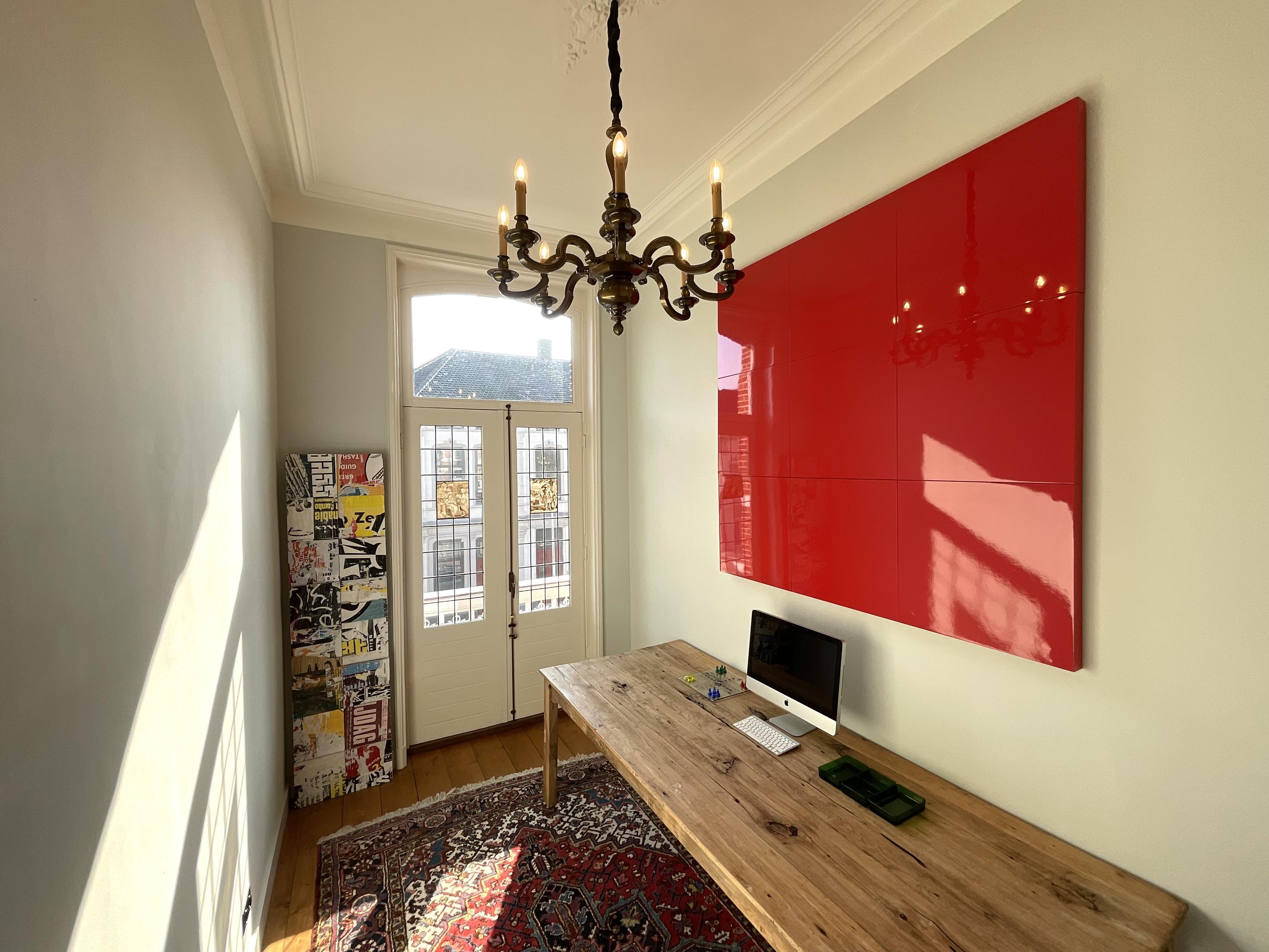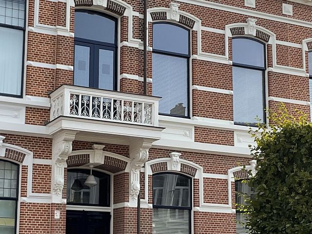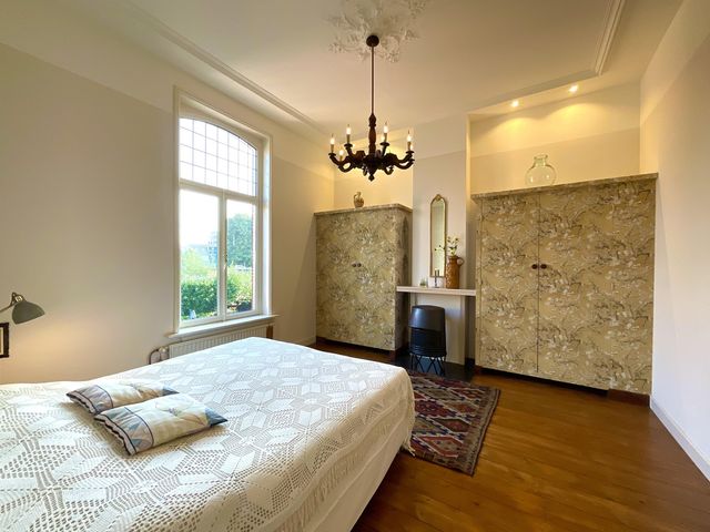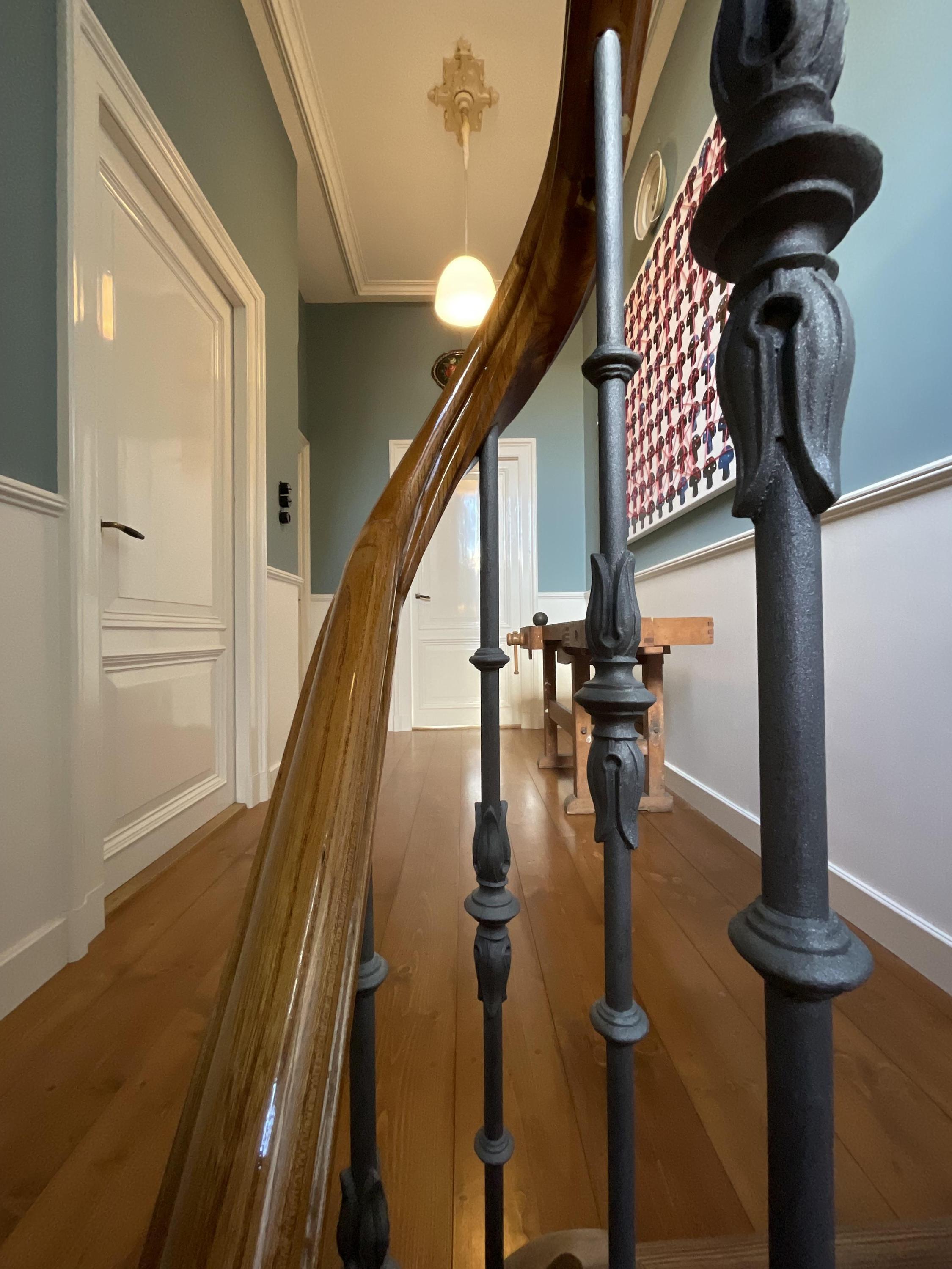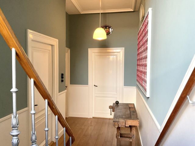 De nog originele trap met statige houten baluster is een parel. Met één hand subtiel glijdend over de oorspronkelijke leuning, komen we eerst bij de tussenverdieping. Hier is een badkamer gerealiseerd met een hele grote inloopdouche, een toilet en een wastafel. Sfeer en ruimtelijkheid beschrijven dit vertrek in een notendop. Een ruimte waar modern en klassiek tevens hand in hand gaan. Leuke weetjes: de ruimte verwarmen gebeurt hier door middel van wandverwarming en de inloopdouche is voorzien van een warmteterugwinsysteem. Negen treden hoger bereiken we de eerste verdieping waar een aantal dingen meteen in het oog springen. Bijvoorbeeld het hoge, sierlijke plafond en de massieve houten vloer. En ook de originele deuren met messing deurbeslag in een brons antieke kleur. Van de drie (slaap)kamers ligt de ‘ouderslaapkamer’ aan de achterzijde van het huis. Kenmerkend voor deze kamer is het uitzicht op de tuin, de aanwezige houtkachel en de twee diepe vaste kasten. Kijk ook hier eens naar het plafond. Sierlijsten en ornamenten vervelen nooit. De andere twee (slaap)kamers kijken uit over de Stationsstraat. Typerend en sfeer verhogend in de grootste kamer zijn de vaste kastenwand met dokters-vitrine en de houtkachel. De naastgelegen kamer is in gebruik als kantoor, heeft openslaande deuren met gebrandschilderd glas-in-lood die toegang geven tot een balkon.