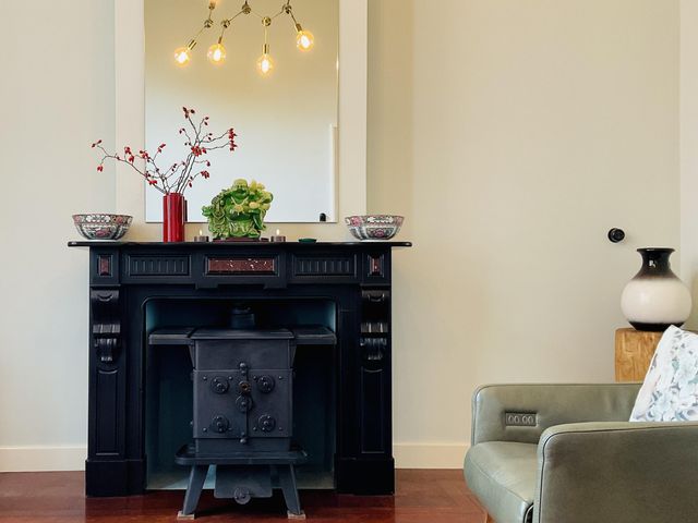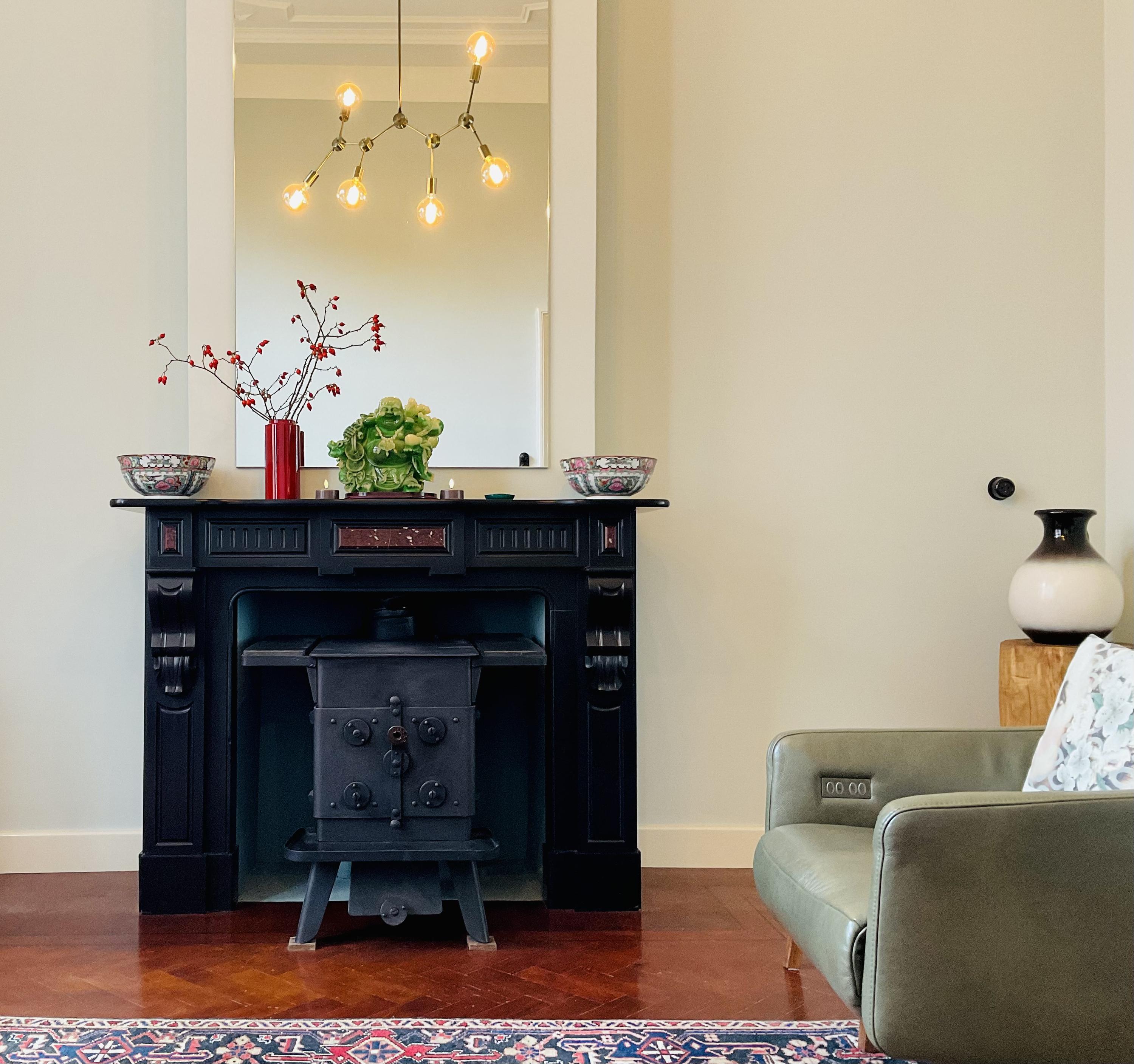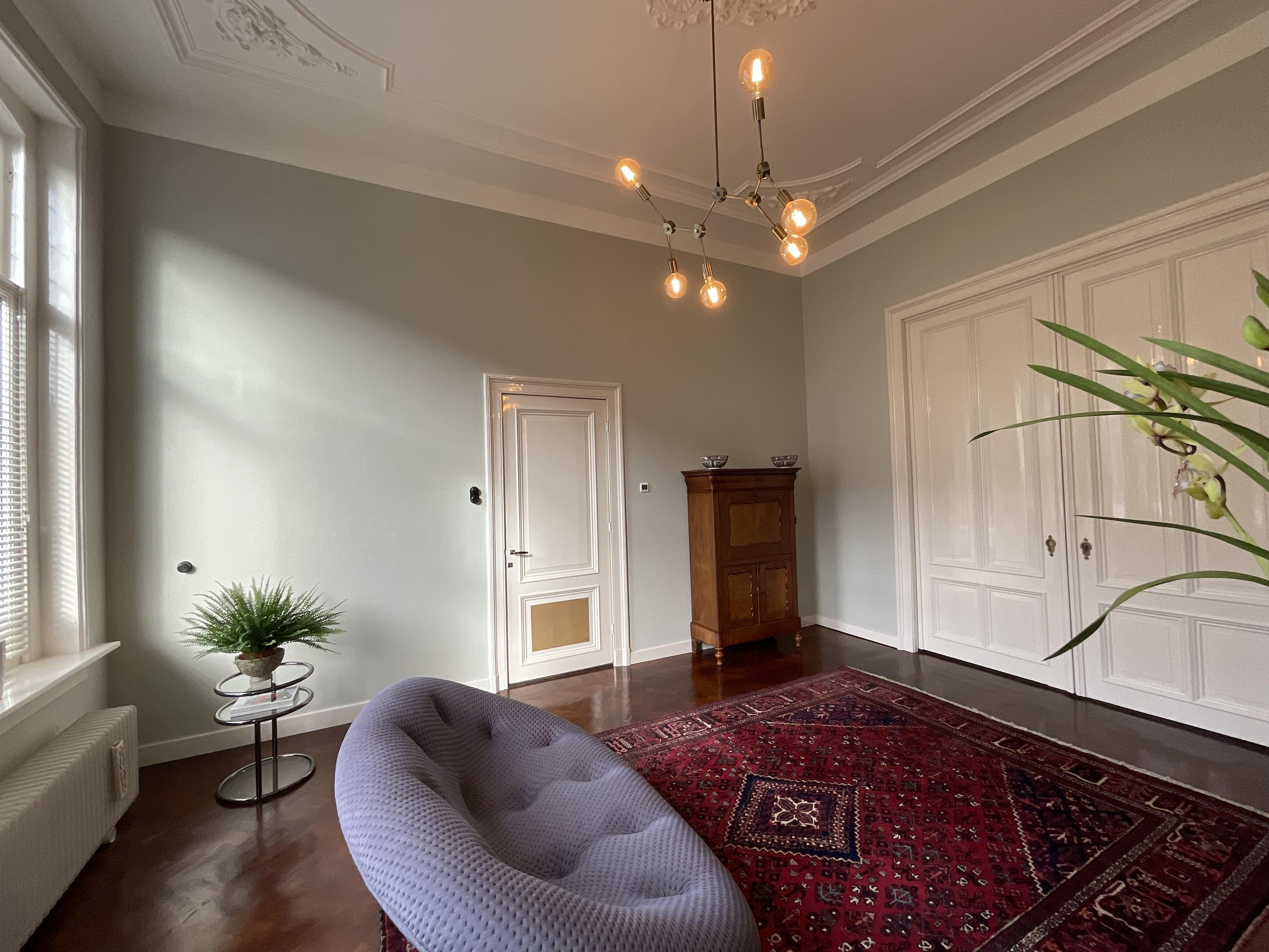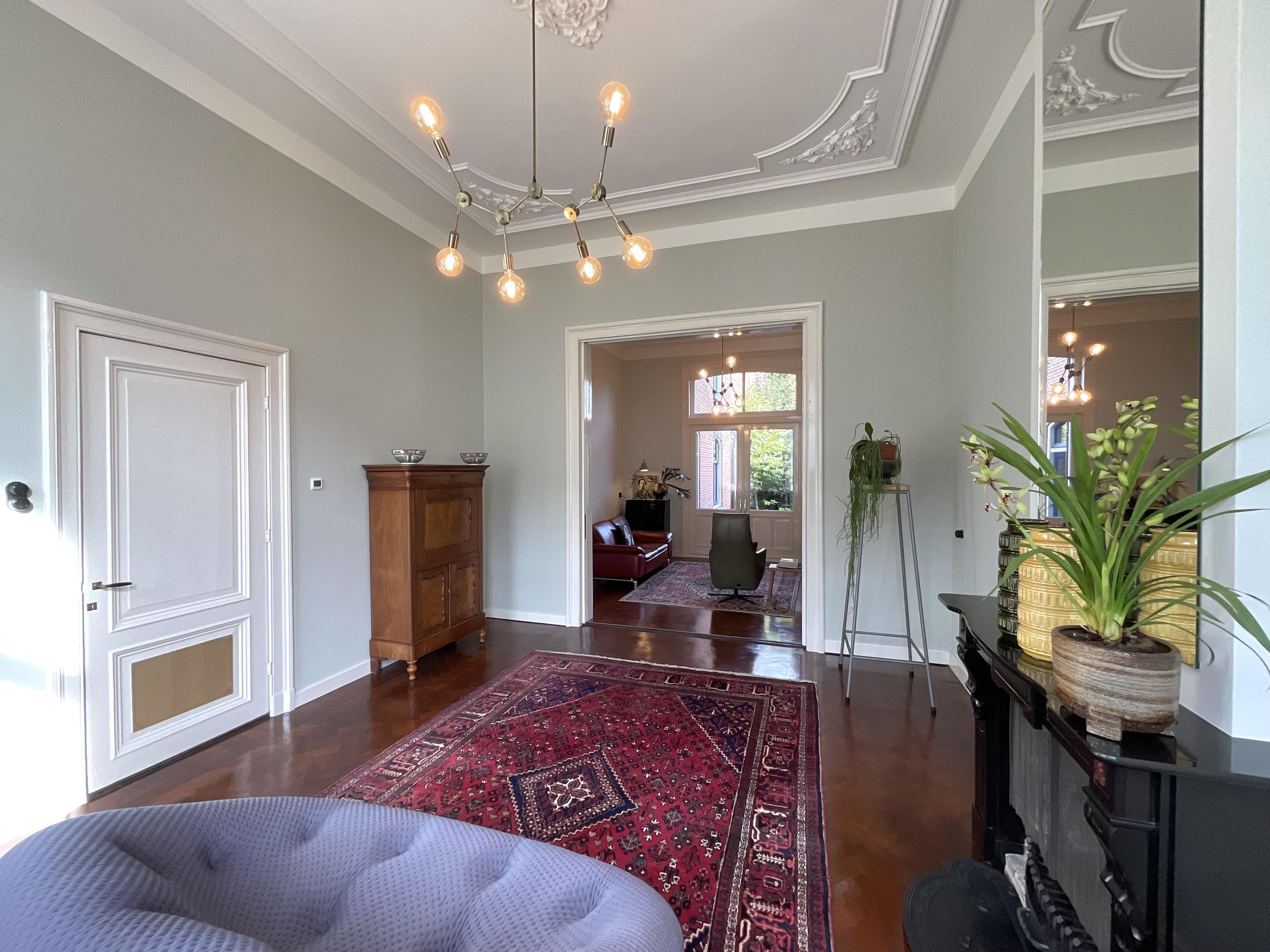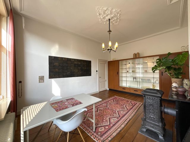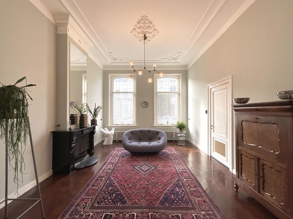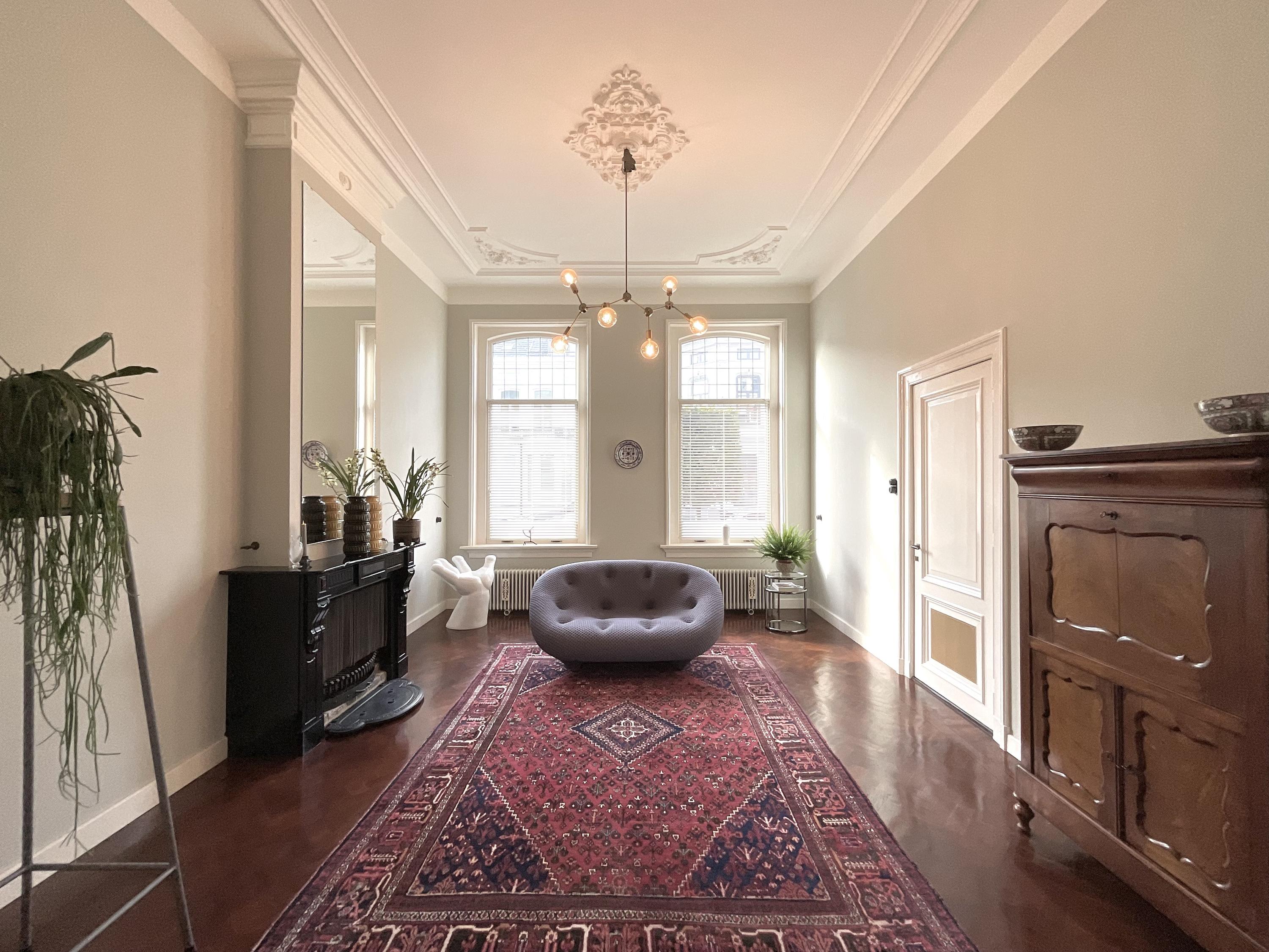 In de voorkamer laten we onze blik gaan over de elementen die deze kamer karakter geven. Van het visgraat parket en de sierlijke raam- en deurlijsten tot het hoge plafond met volledig gerestaureerde ornamenten en lijsten. En natuurlijk de typerende lamellen radiator en een marmeren schouw met open haard. Open de ensuite schuifdeuren en ontdek in de achterkamer dezelfde fraaie elementen. Anders dan in de voorkamer omlijst de marmeren schouw hier een houtkachel. En terwijl deze fijn is op koele(re) avonden is de grote schuifpui naar de achtertuin een pluspunt op warme dagen.