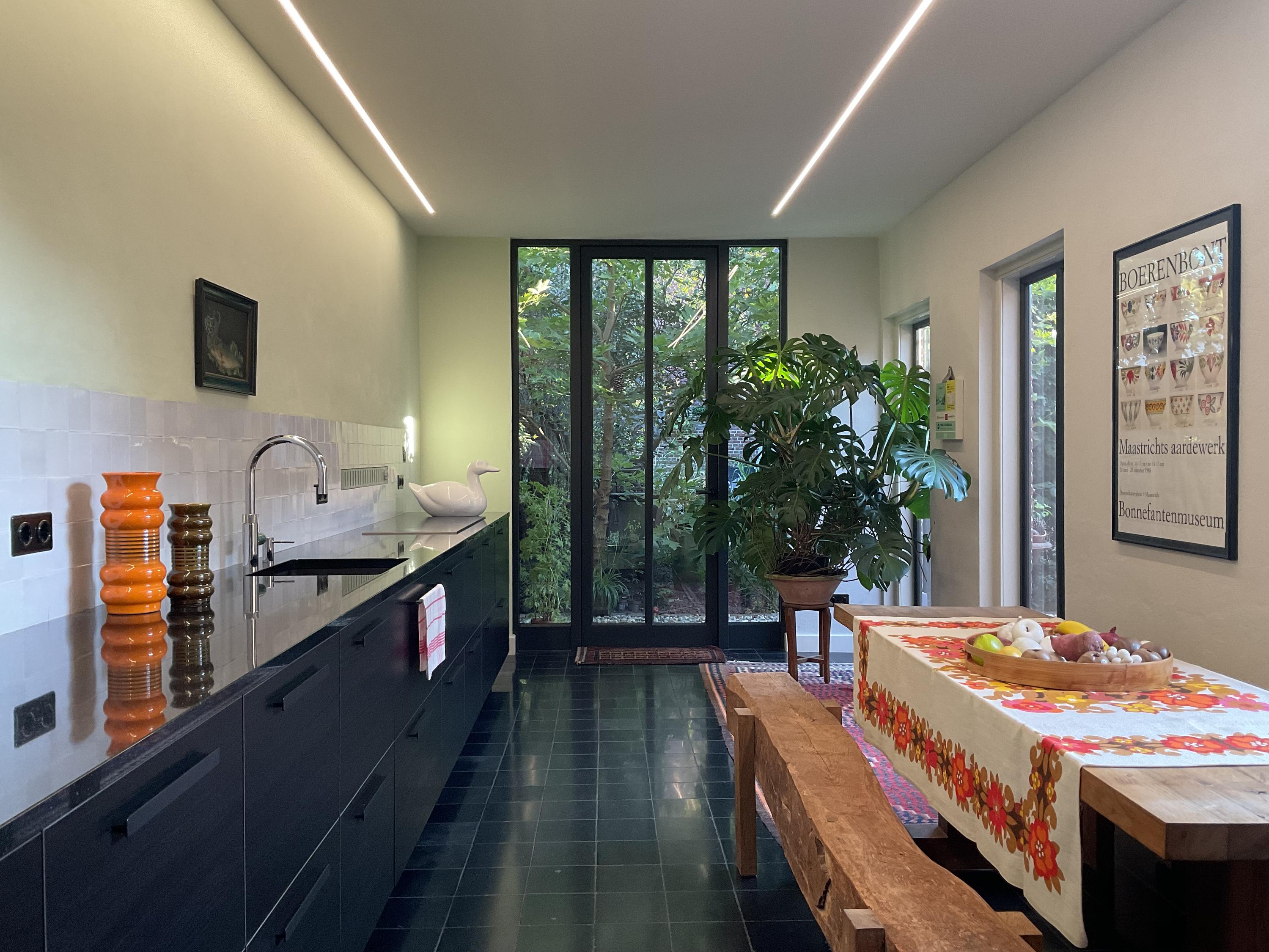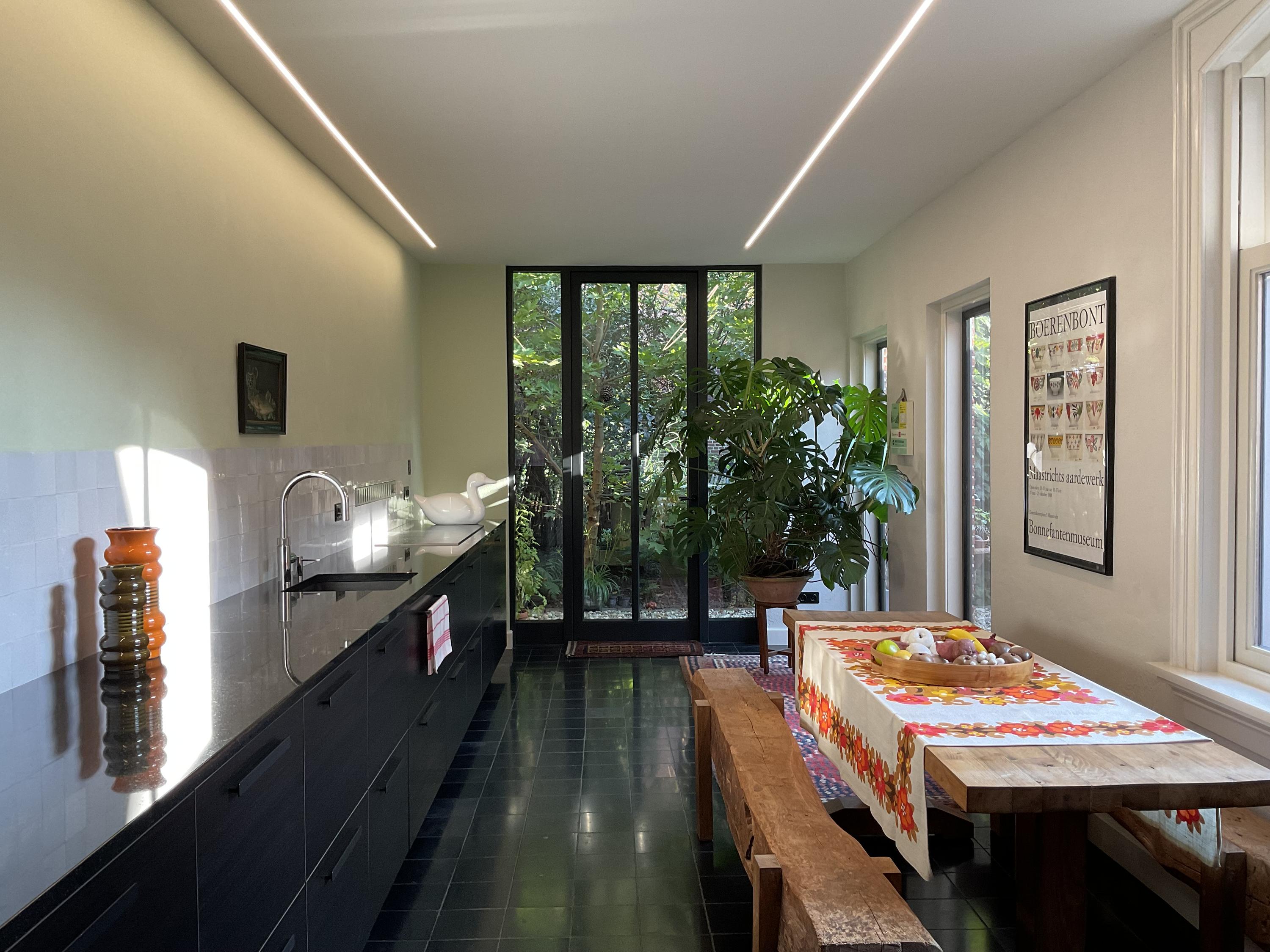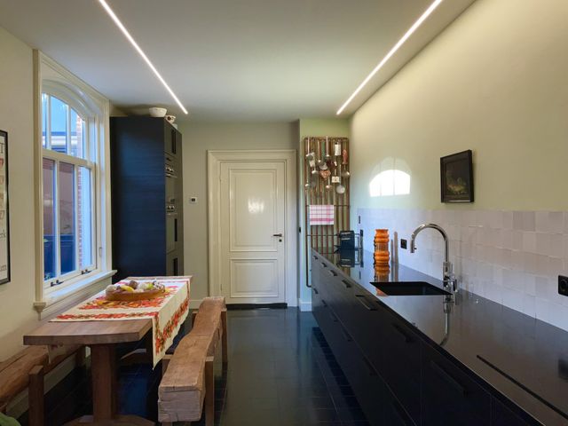 Zet één voet in de leefkeuken en ervaar een gevoel van ruimtelijkheid, door de afmetingen, hoog plafond én de raampartijen. Net als in de achterkamer is hier direct contact met de tuin. Het voelt echter nog meer als buiten, omdat het weelderige groen hier meer binnen handbereik is. De keuken heeft een rechte opstelling en is rijkelijk uitgerust. Wie hier kookt, komt niets tekort. Er is een 4-pits inductiekookplaat, een granieten werkblad van maar liefst 6 meter lang met daaronder 18 lades, een vaatwasser en een kastenwand met stoomoven, combi-oven, een koel-vriescombinatie. Het afzuigsysteem is fraai weggewerkt in de muur. De aanwezige Quooker (Flex en Cube) zorgt voor extra kookgemak in de vorm van kokend, bruisend en gekoeld water. De koperen radiator is letterlijk een ‘blikvanger’, een sfeermaker, net als de dimbare, stripverlichting die in het plafond is geïntegreerd.
