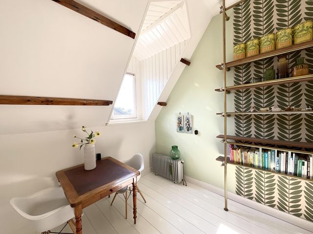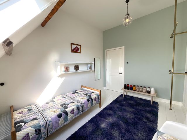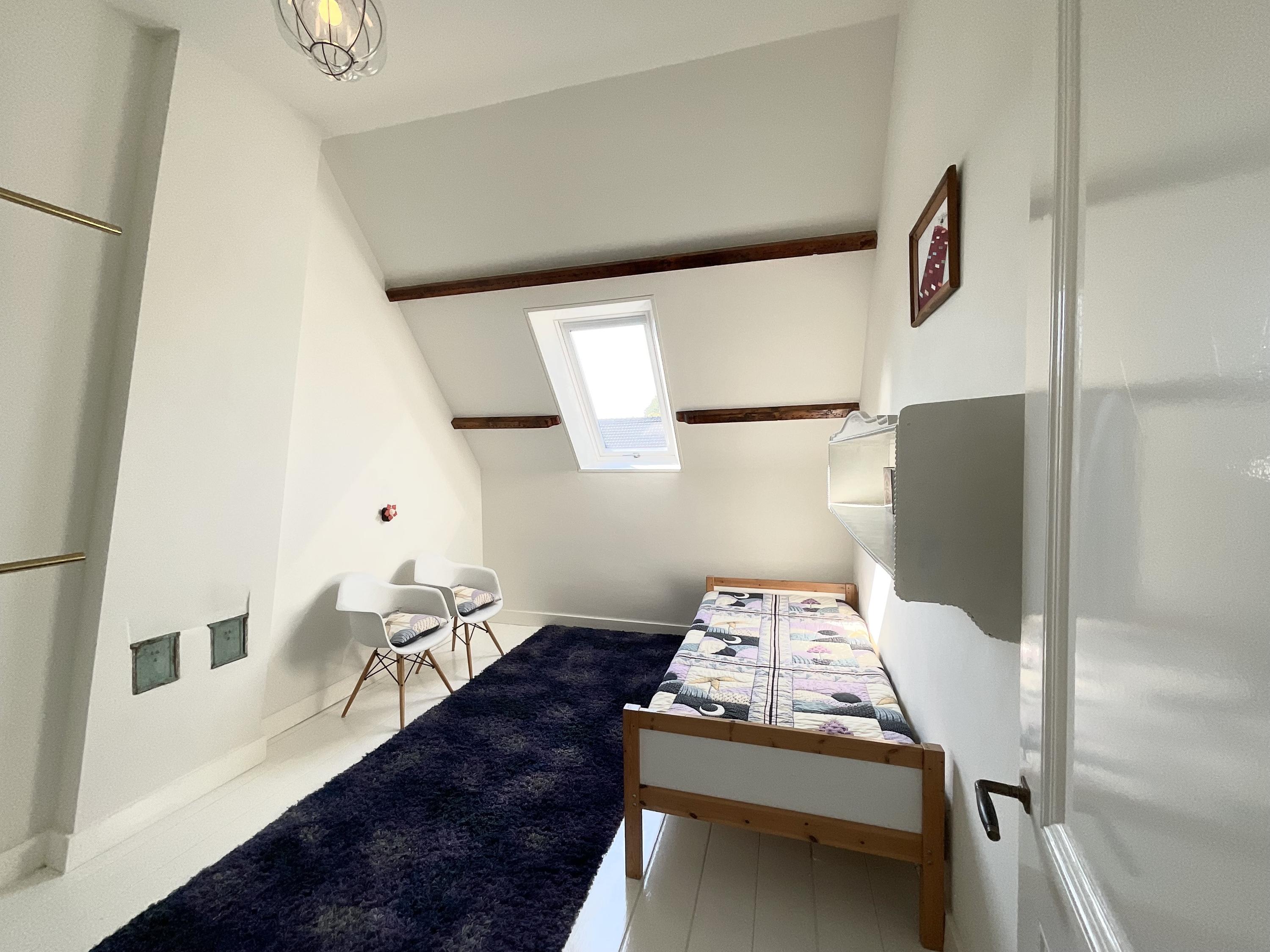 Elke kamer – drie slaapkamers in totaal – heeft bovendien iets speels. Van een schuin dak tot een dakkapel en zichtbare houten balken. Op deze verdieping vinden we naast de drie slaapvertrekken ook een tweede badkamer en een inloopkast. De badkamer heeft een inloopdouche, een toilet en een wastafel met daarboven een spiegel met verwarming. De badkamer heeft vloerverwarming en ook deze inloopdouche is voorzien van een warmteterugwinsysteem waarbij een warmtewisselaar warmte haalt uit het wegstromend douchewater en dat gebruikt wordt om koud leidingwater voor te verwarmen.