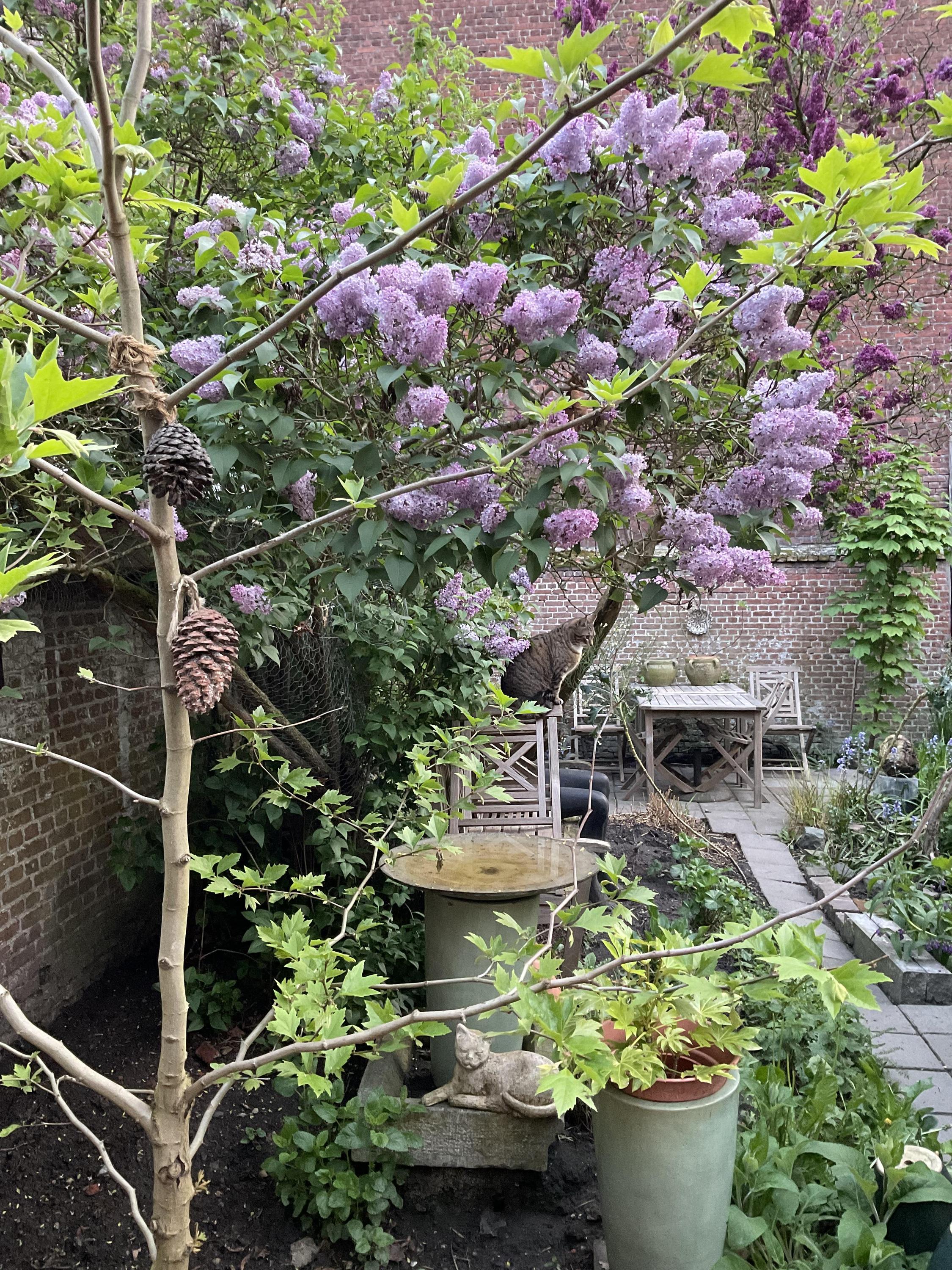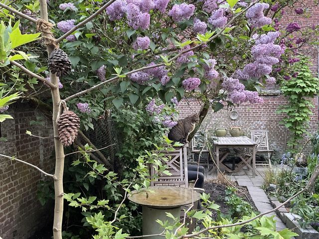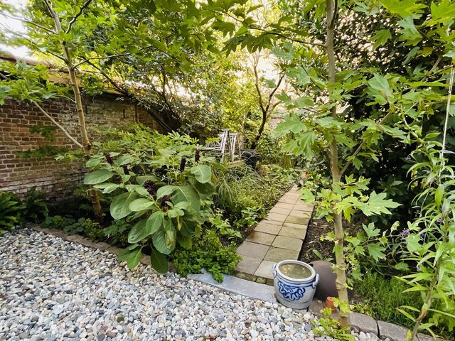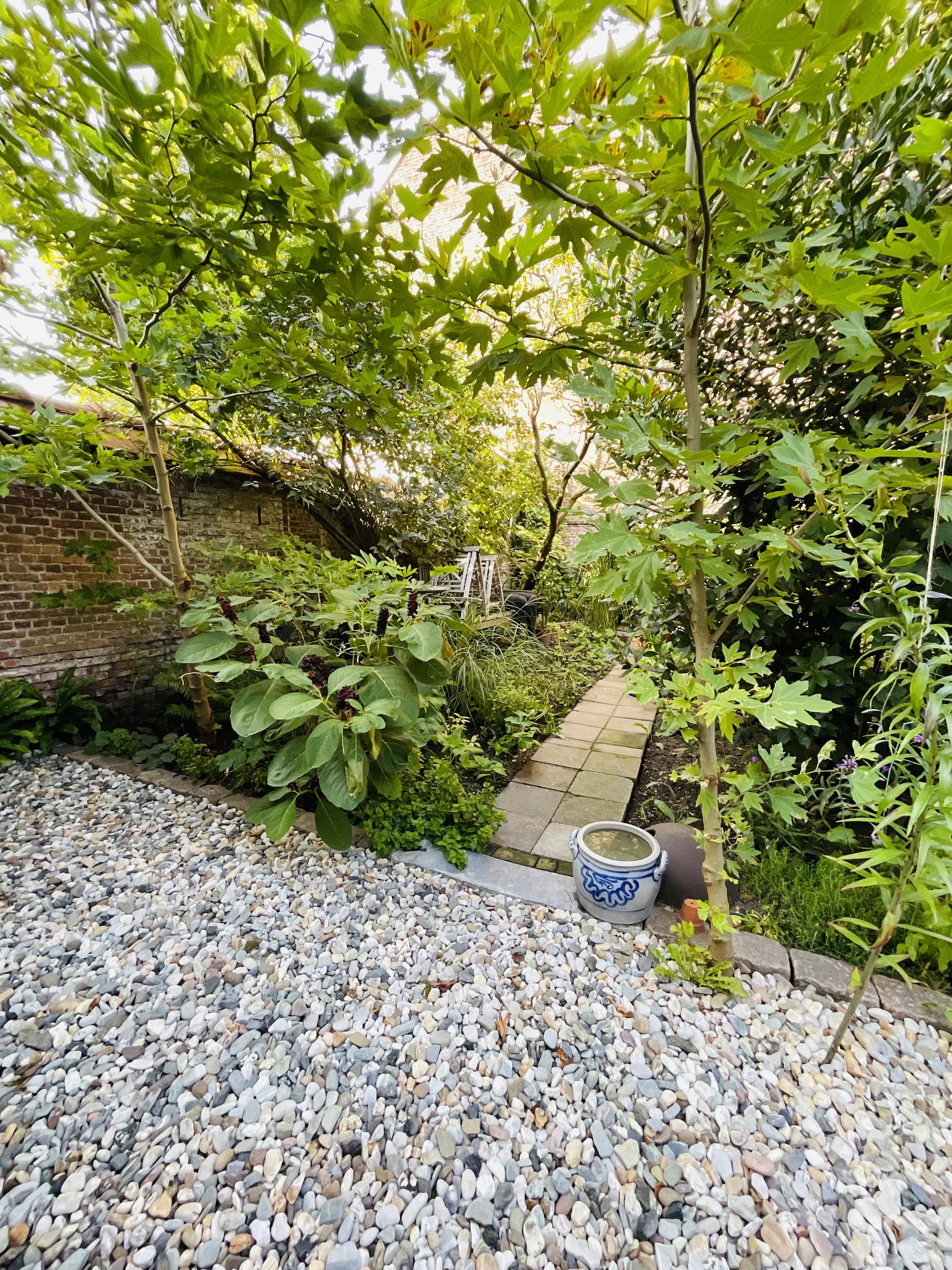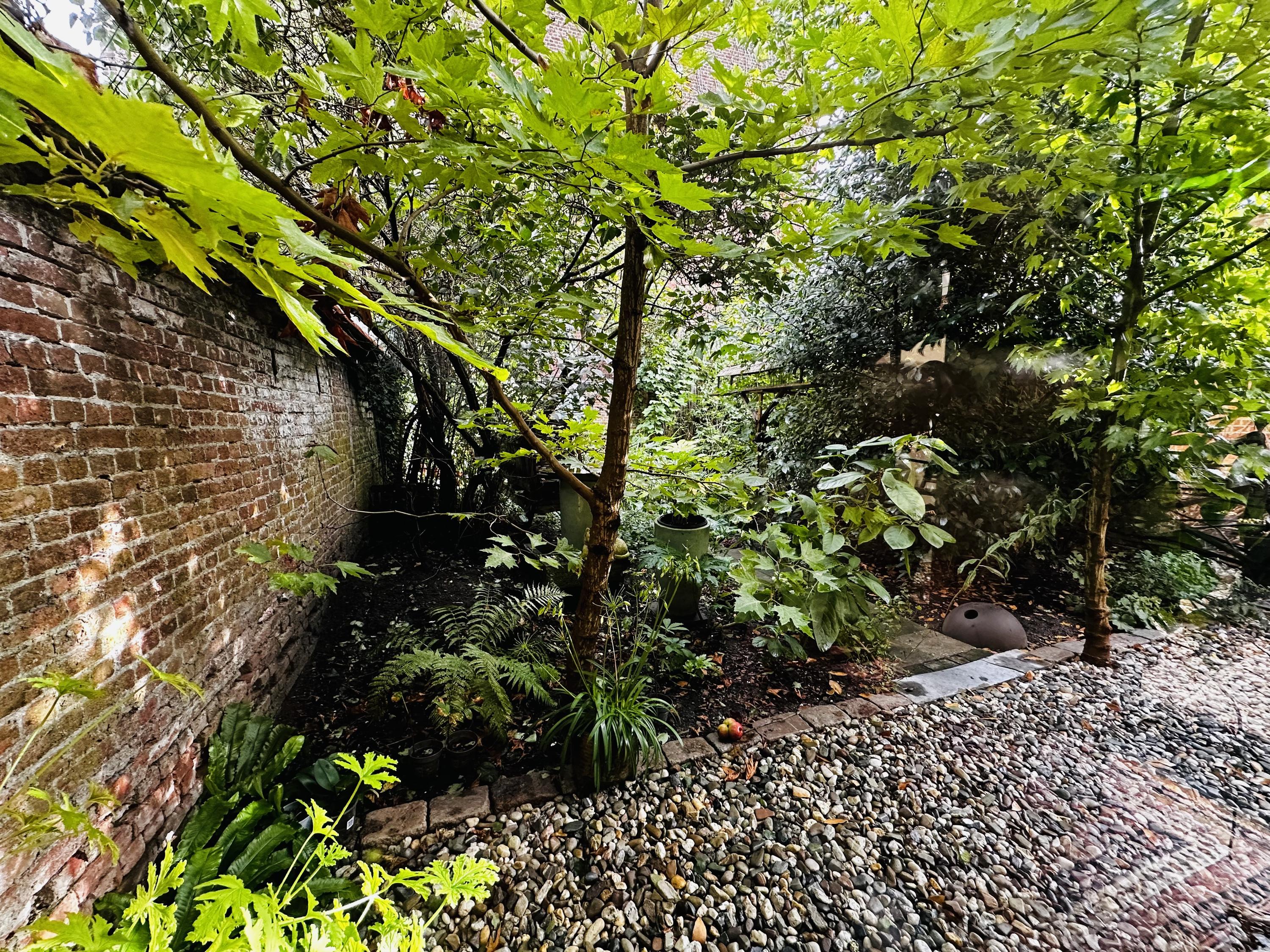 Privacy is één van de sleutelwoorden van deze royale, op het noorden gelegen stadstuin. De originele hoge steens tuinmuren van ruim 2 meter hoog die het terras aan huis flankeren en het weelderige groen aan de achterzijde van de tuin, dragen daar aan bij. De tuin bestaat uit twee delen: een ‘strak’ terras aan huis en een zitgedeelte midden in het weelderige groen. Exclusief in deze stadstuin komen elk jaar in de winter, dagelijks tientallen puttertjes foerageren. Het is een groene oase van rust in hartje Bergen op Zoom.