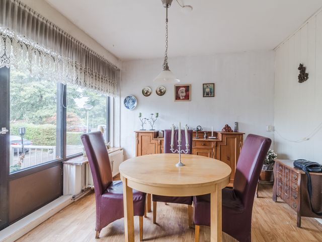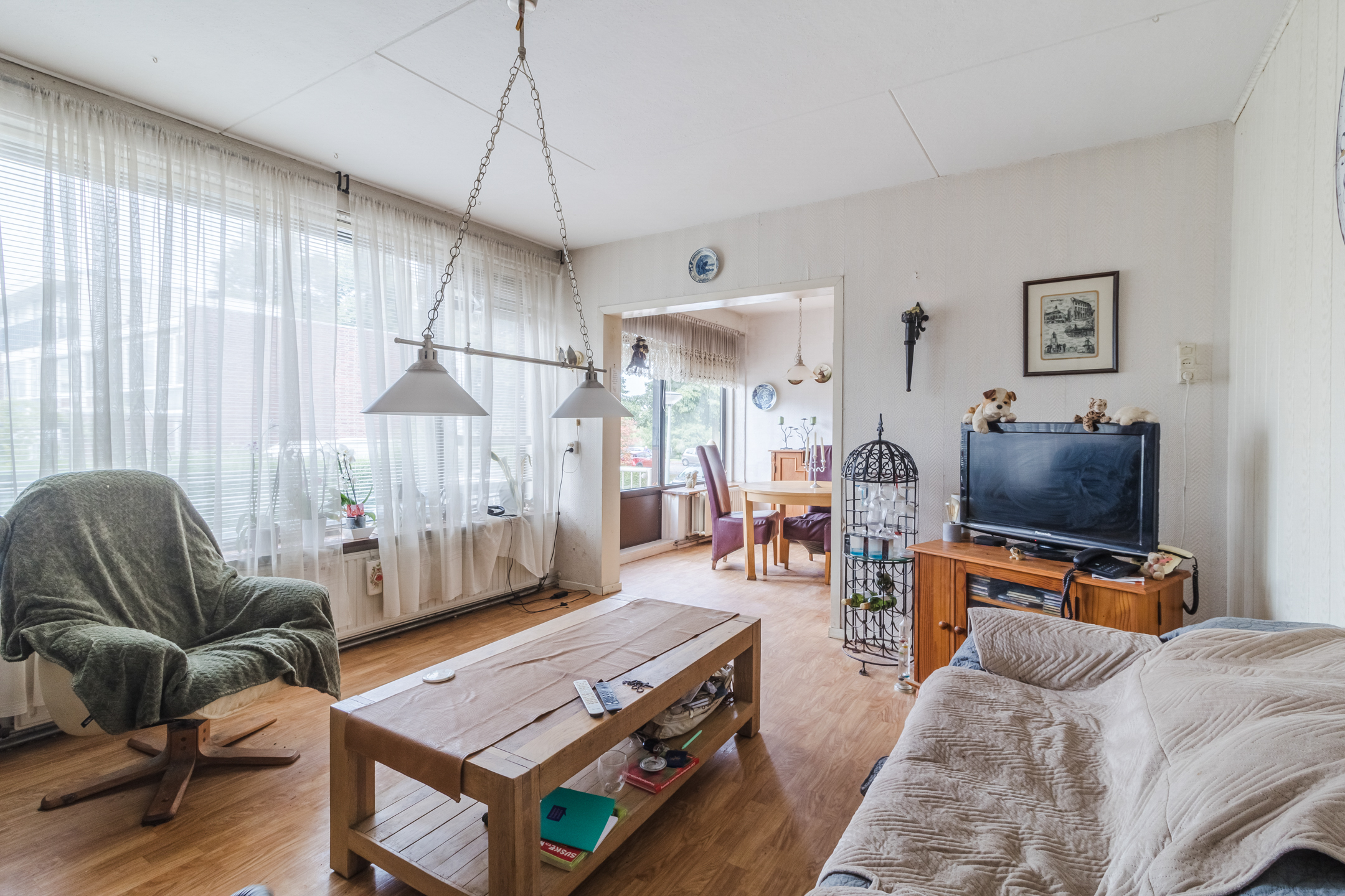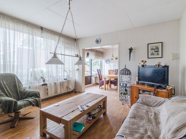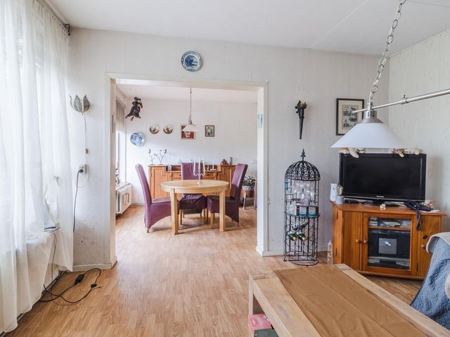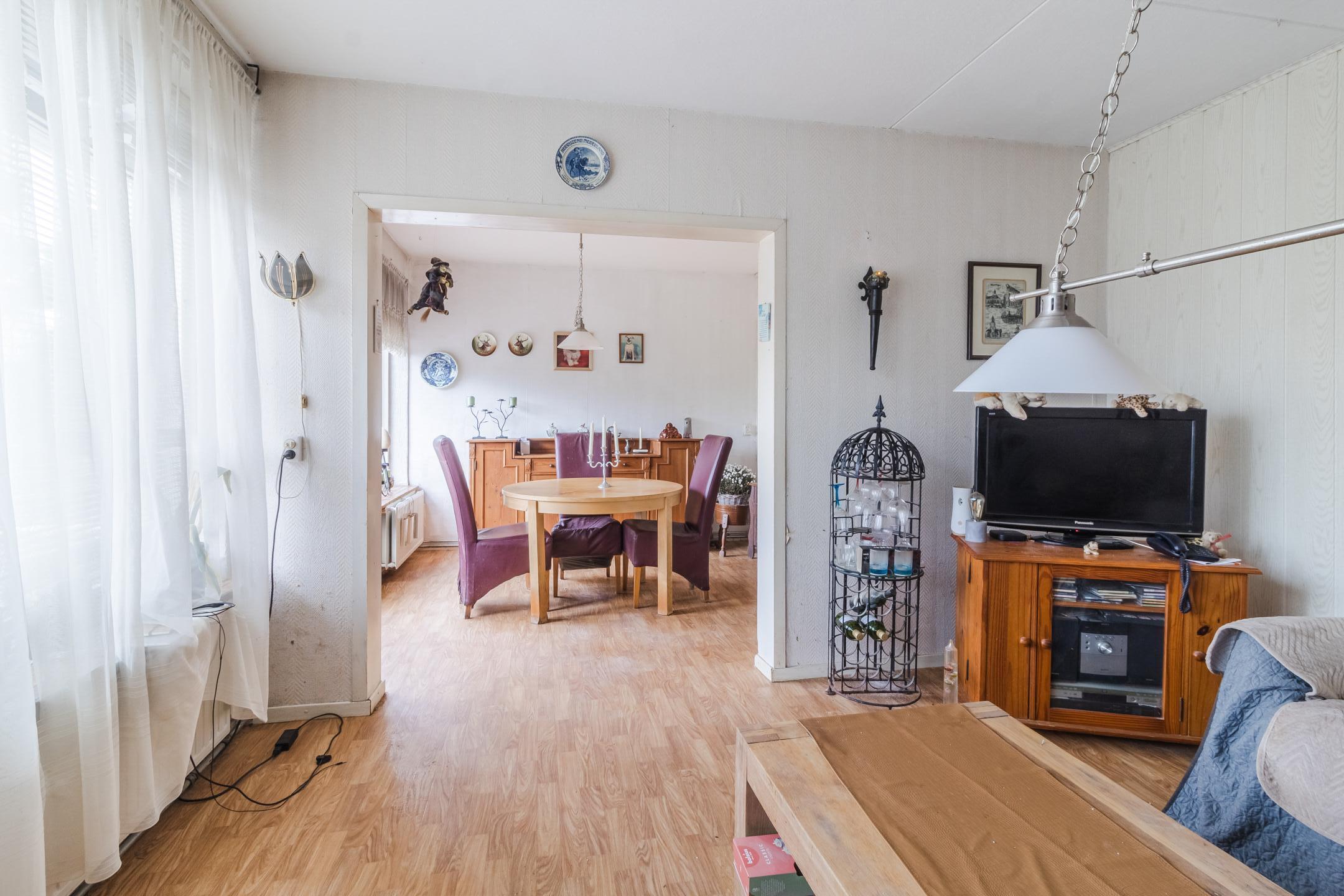 De ruime woonkamer heeft laminaat vloer en kunststof kozijnen met dubbelglas.