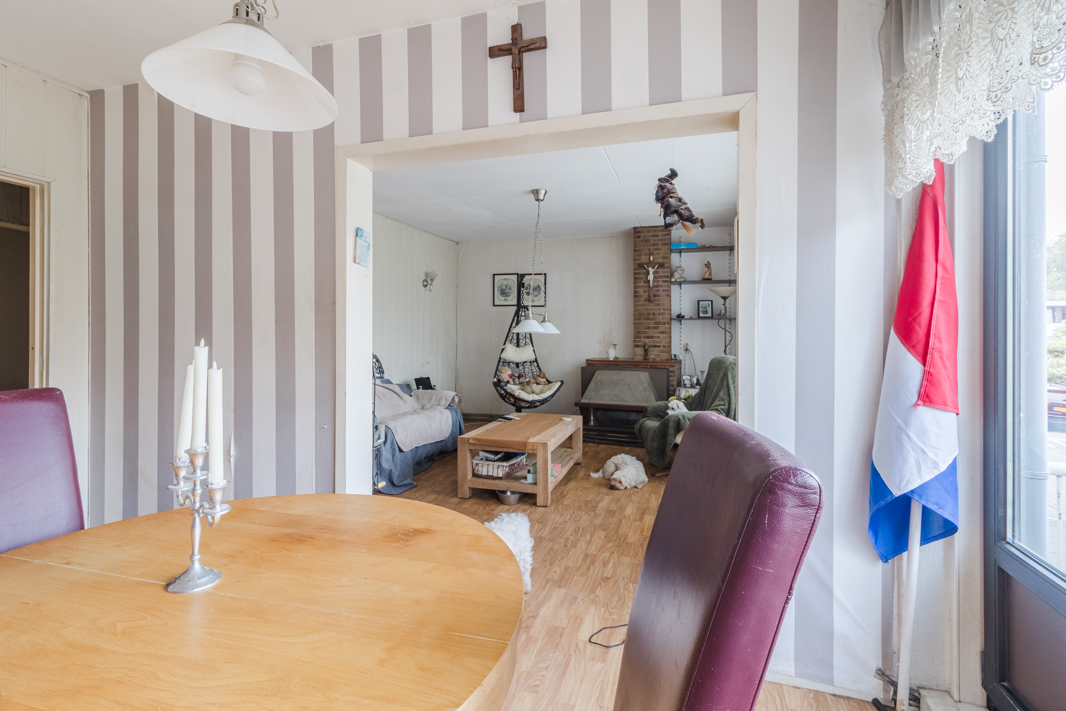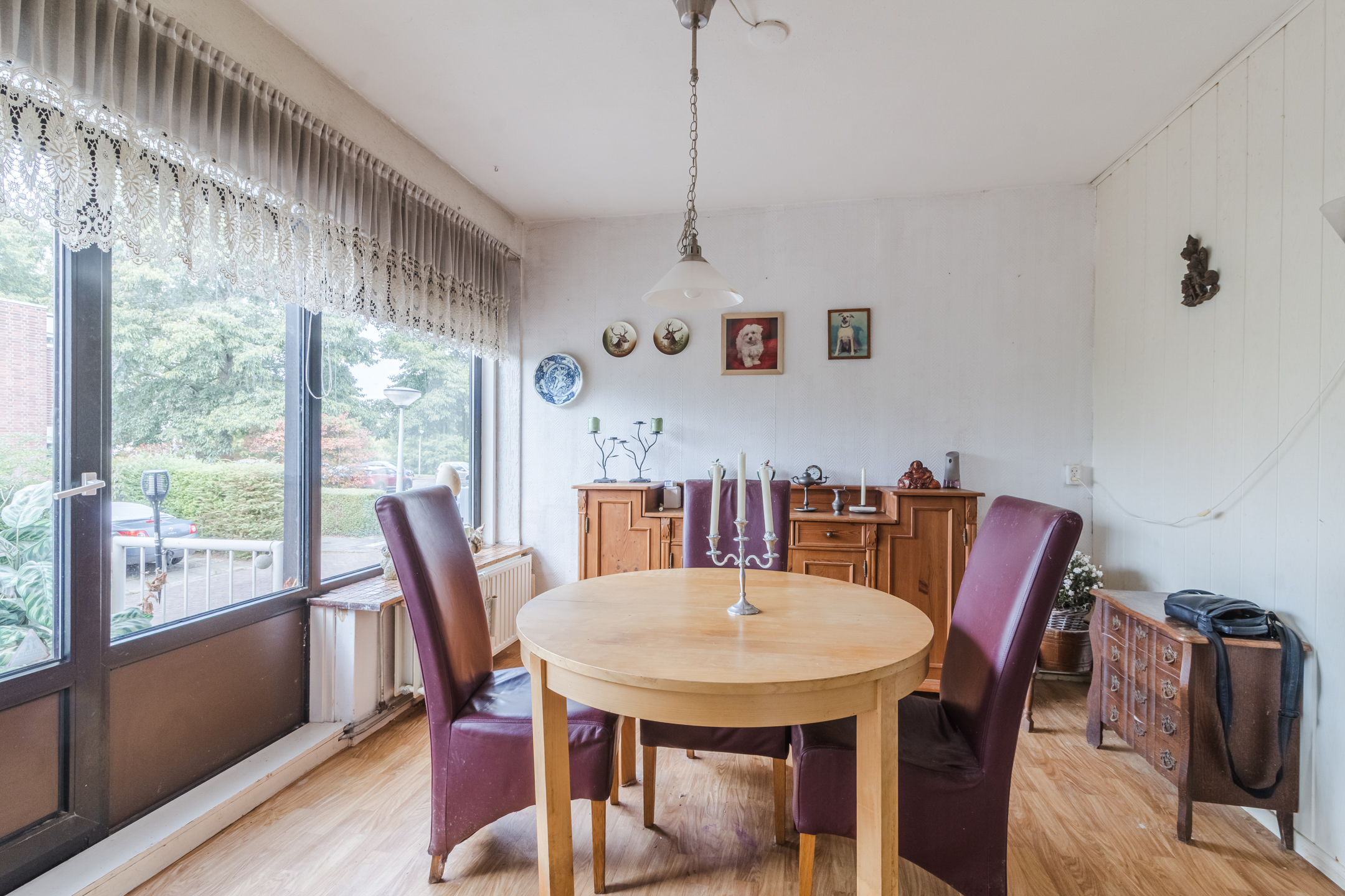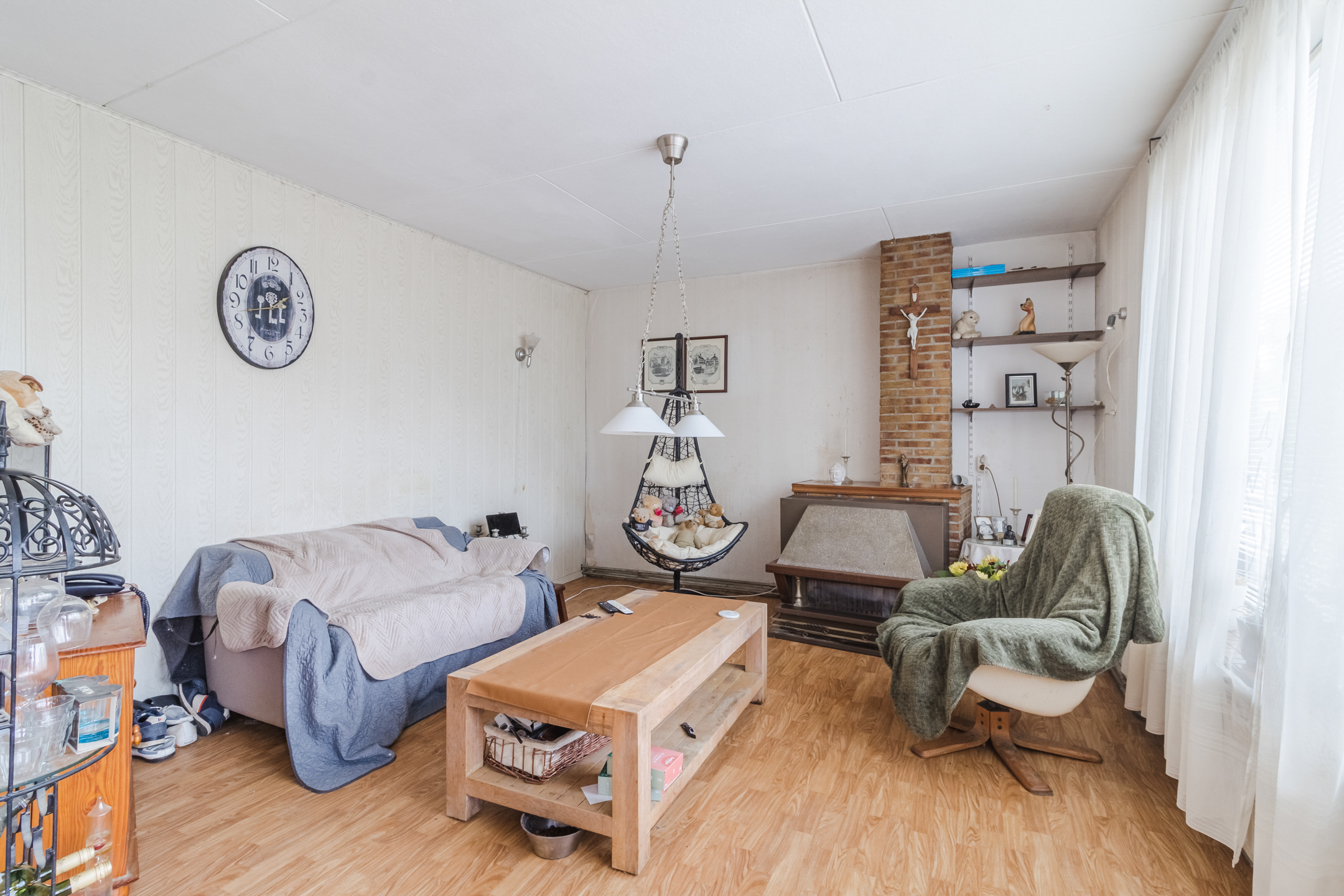 De ruime woonkamer heeft laminaat vloer en kunststof kozijnen met dubbelglas.