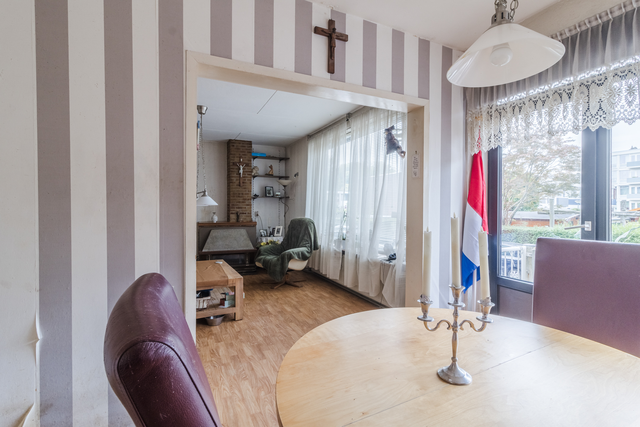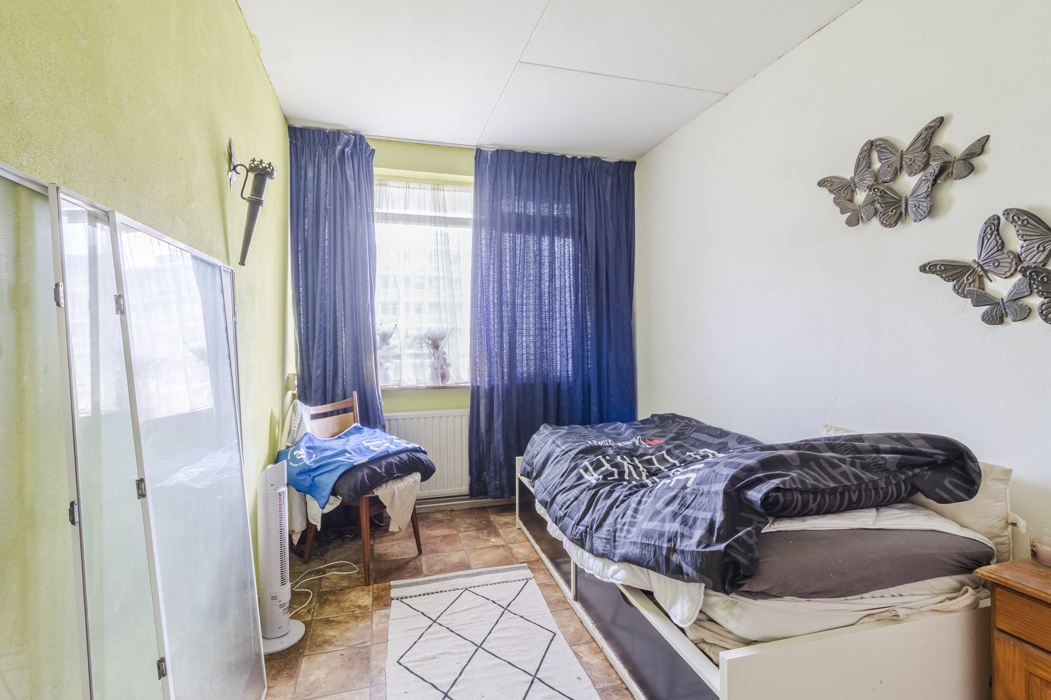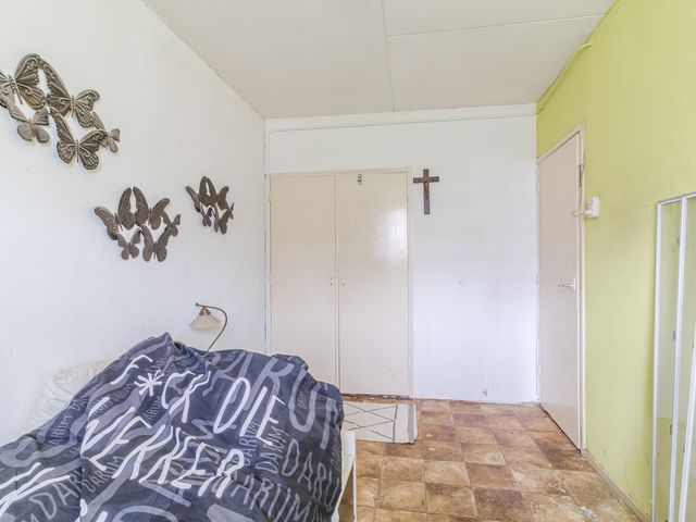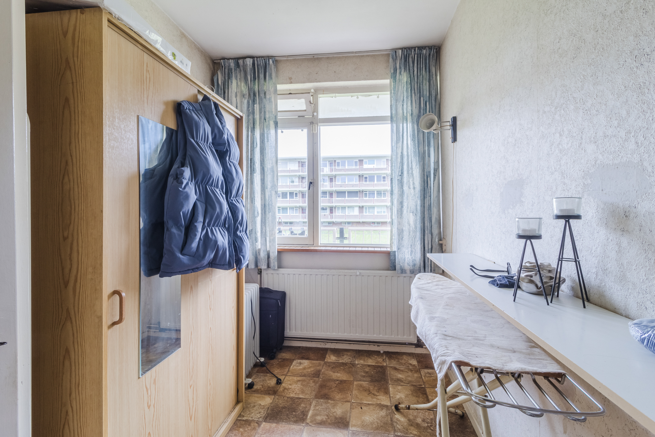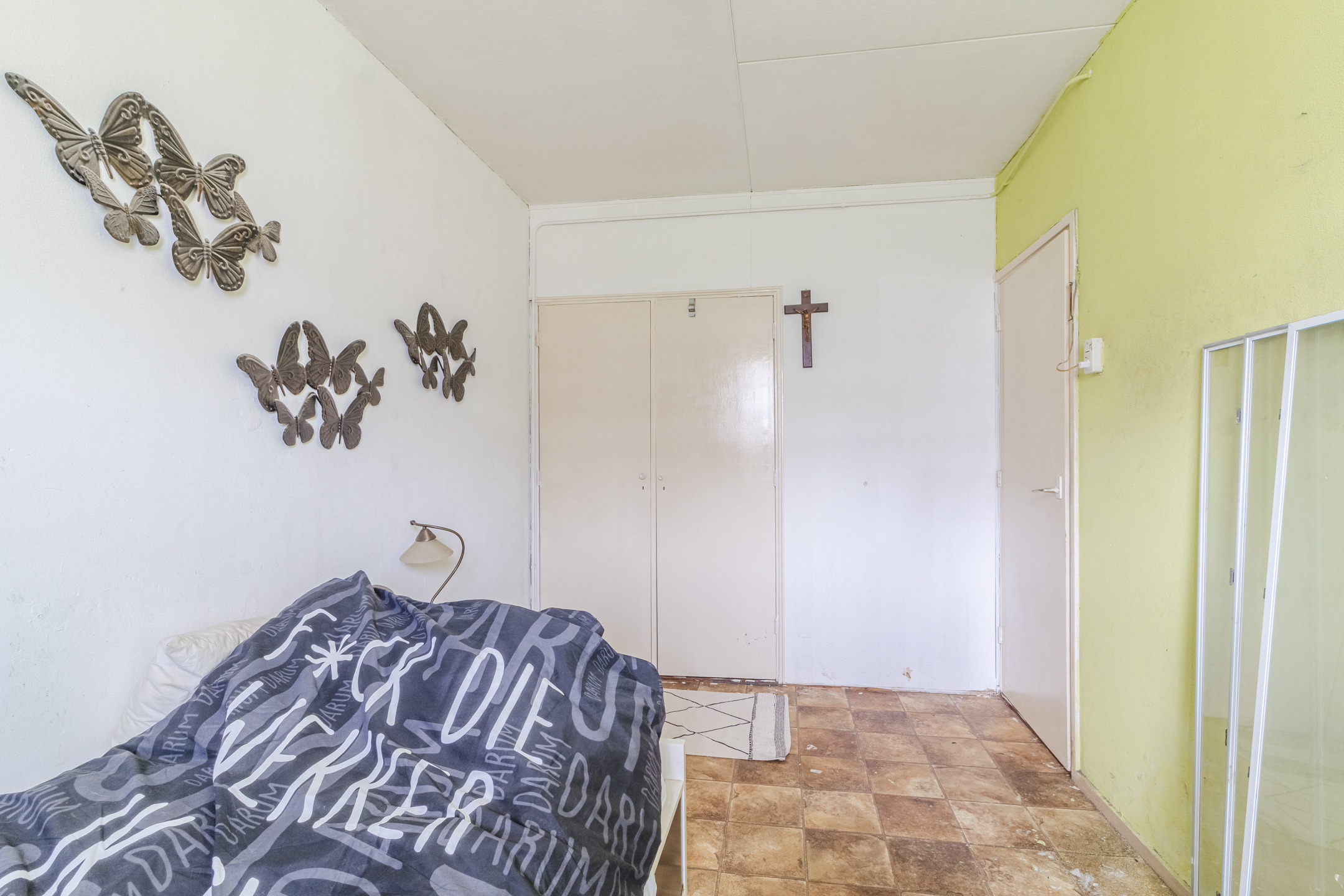 Slaapkamer I heeft een tegelvloer en houten kozijnen met enkelglas.