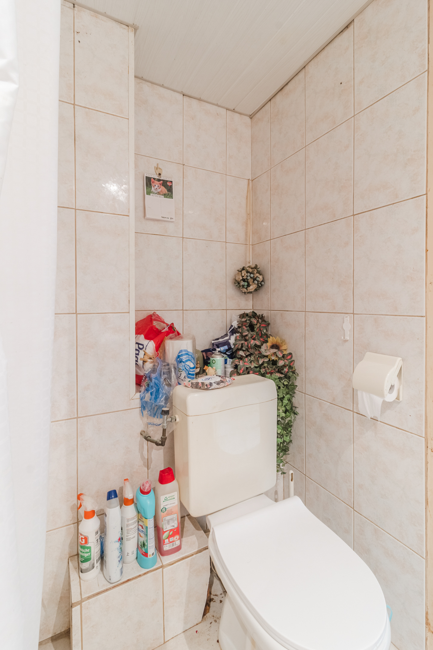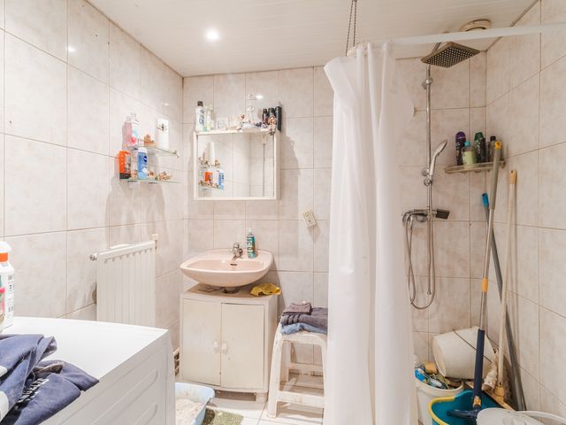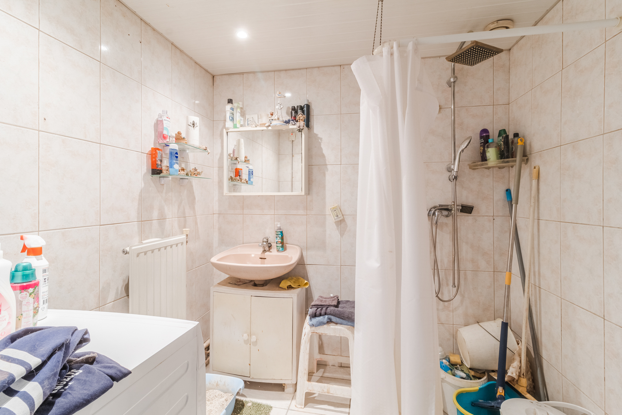 De volledig betegelde badkamer met douche, toilet, wastafel en wasaansluiting.