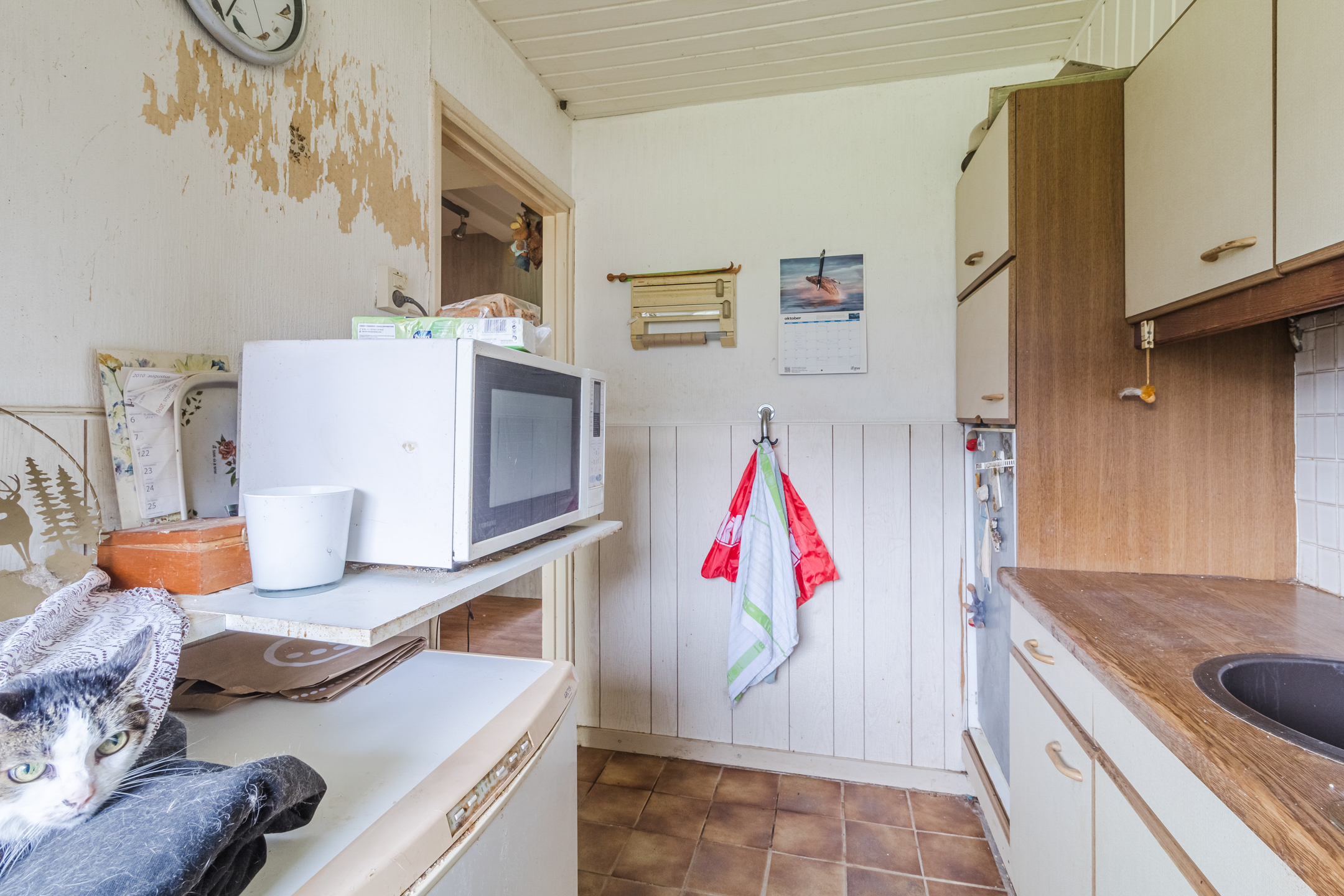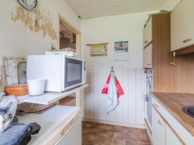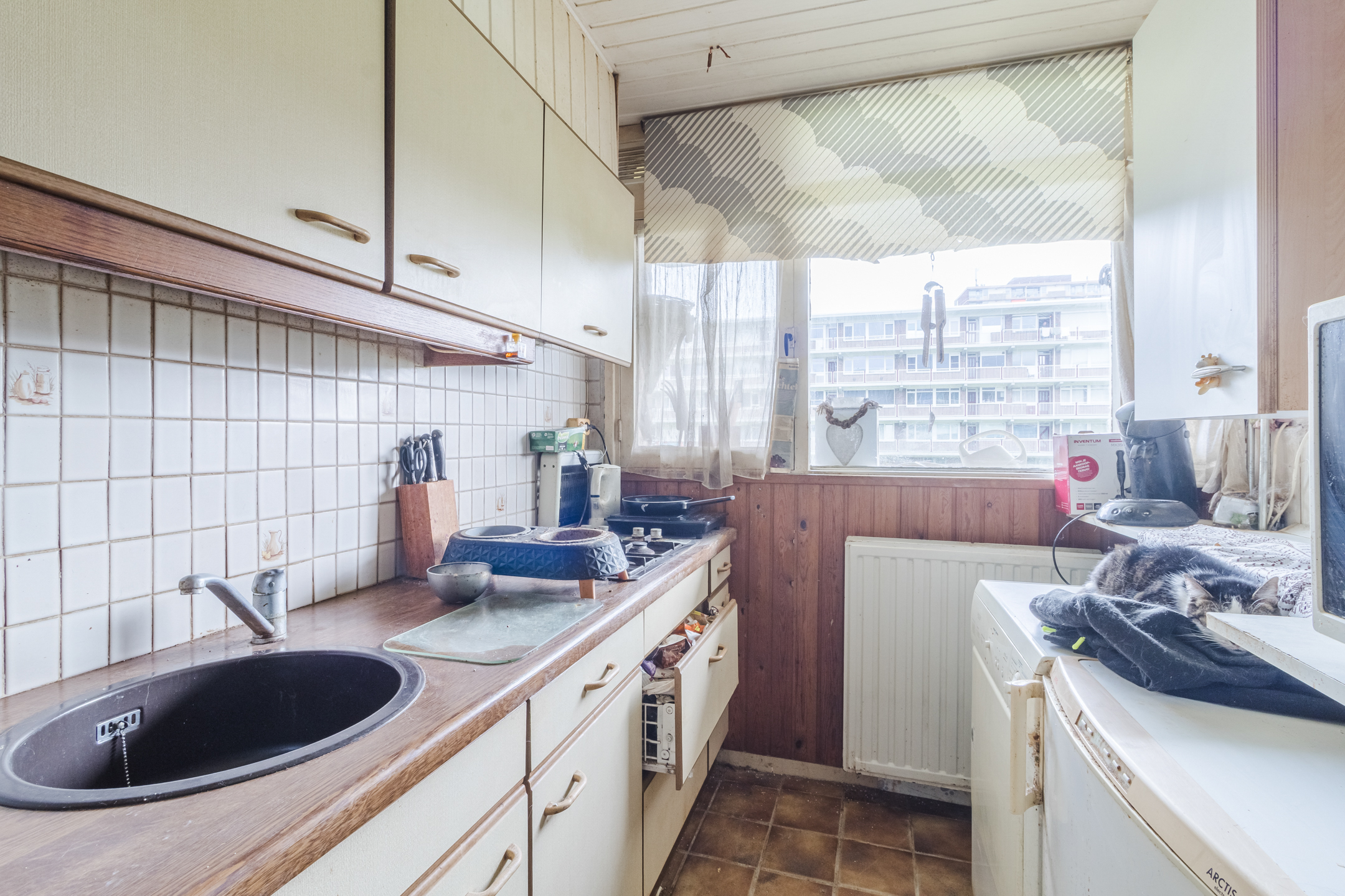 De keuken met tegelvloer en keuken met houten kozijnen van enkelglas.