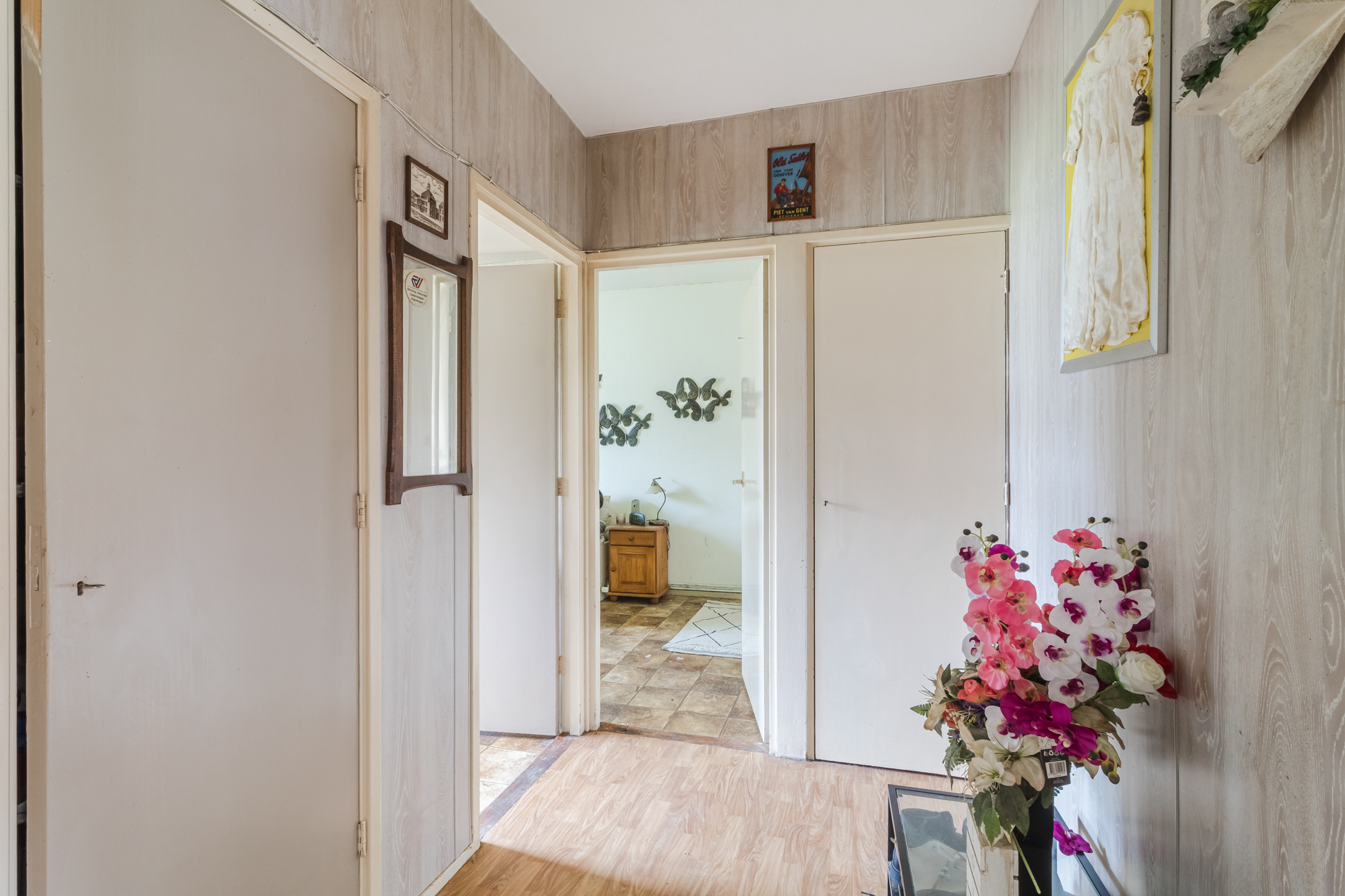 Hal met tegelvloer en toegang tot de entree, keuken, slaapkamer I, slaapkamer II, kast, meterkast, badkamer en de woonkamer.