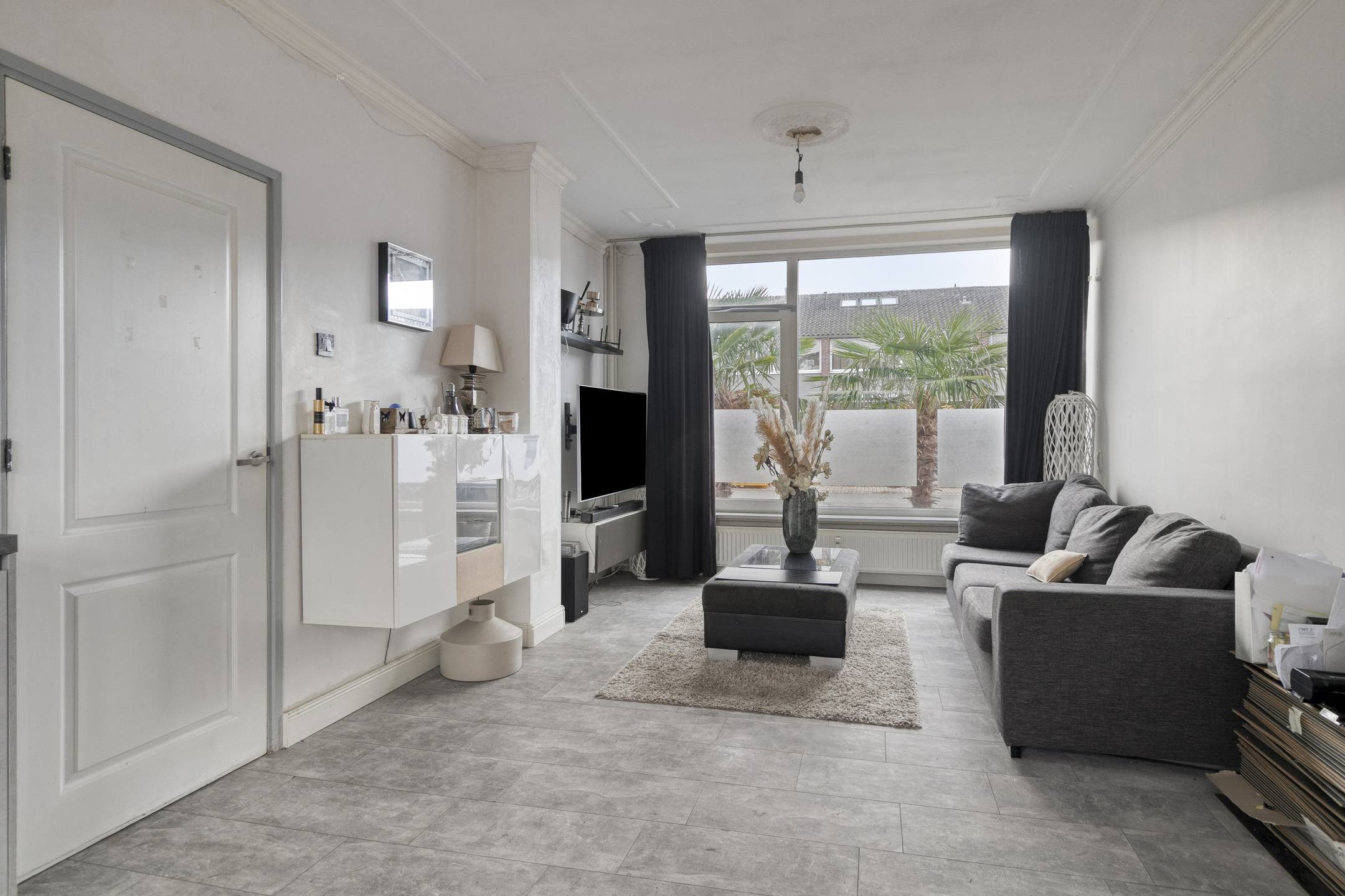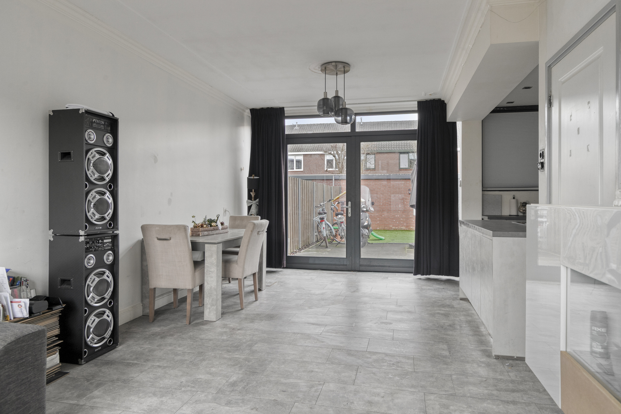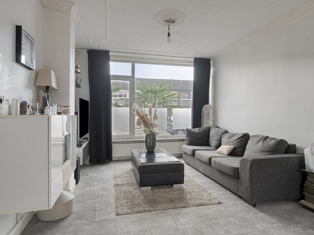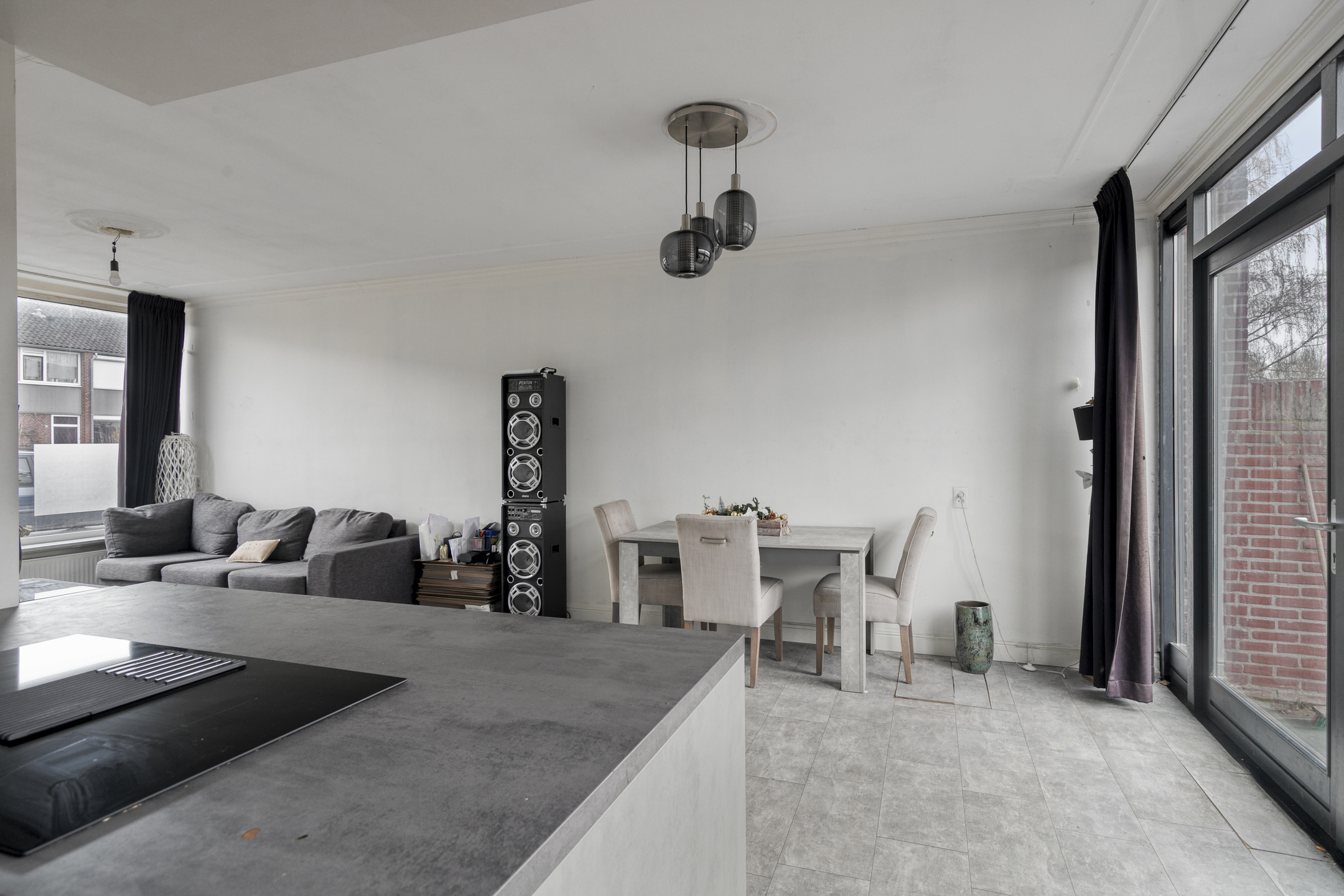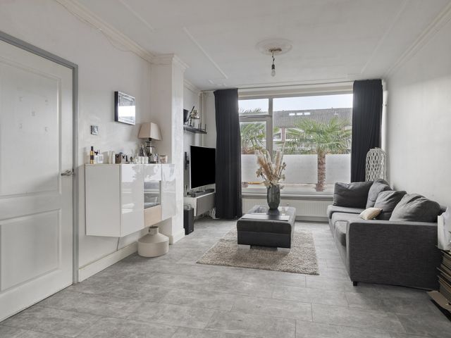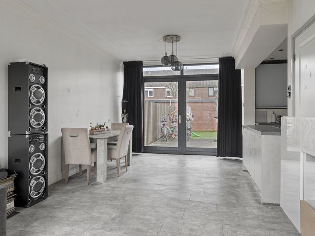 De ruime woonkamer is voorzien van een laminaatvloer en strak gestucte wanden en plafonds. Aan zowel de voor- als achterzijde bevinden zich kunststof kozijnen met HR++ beglazing. De woonkamer beschikt over openslaande deuren naar de achtertuin, wat zorgt voor een prettige lichtinval en directe verbinding met buiten.