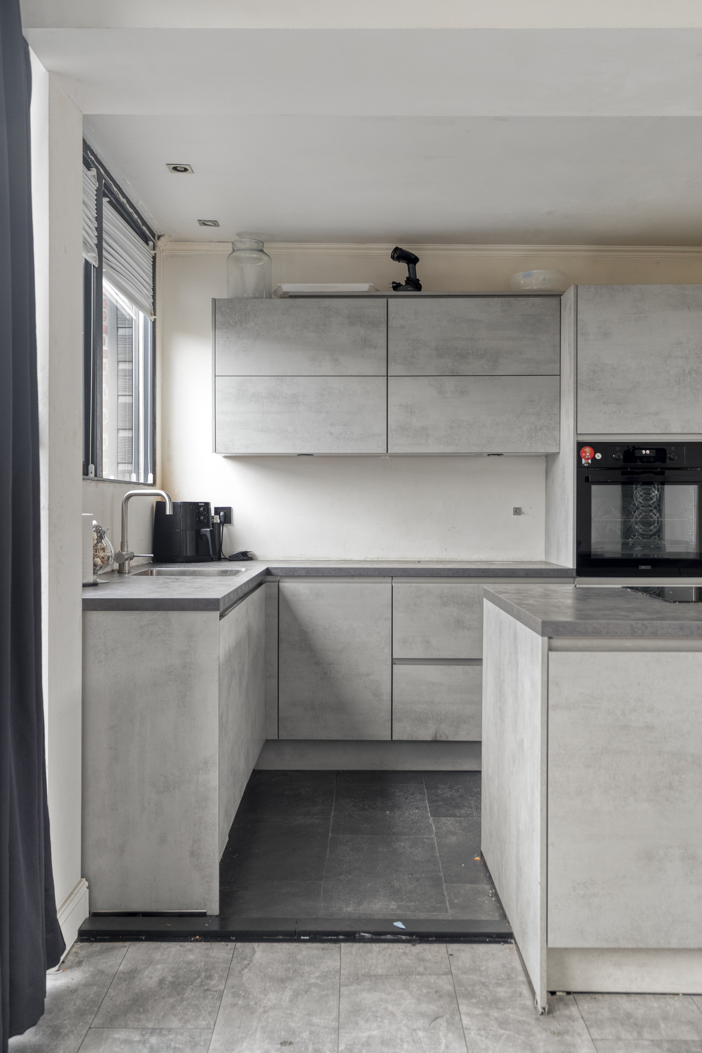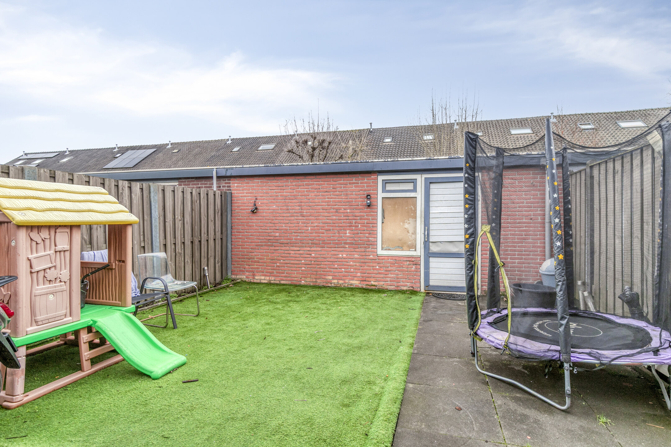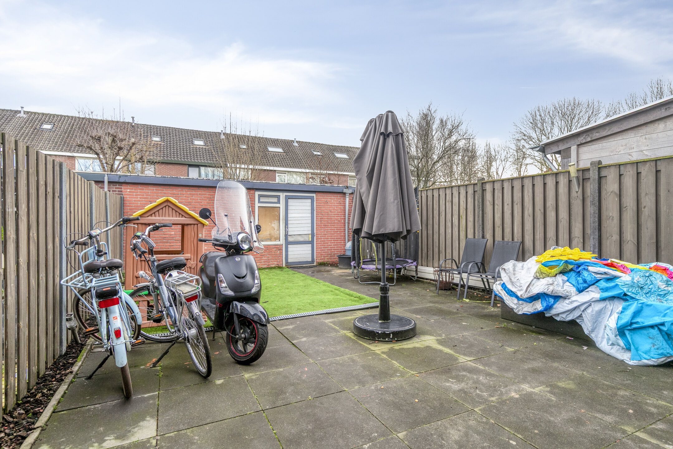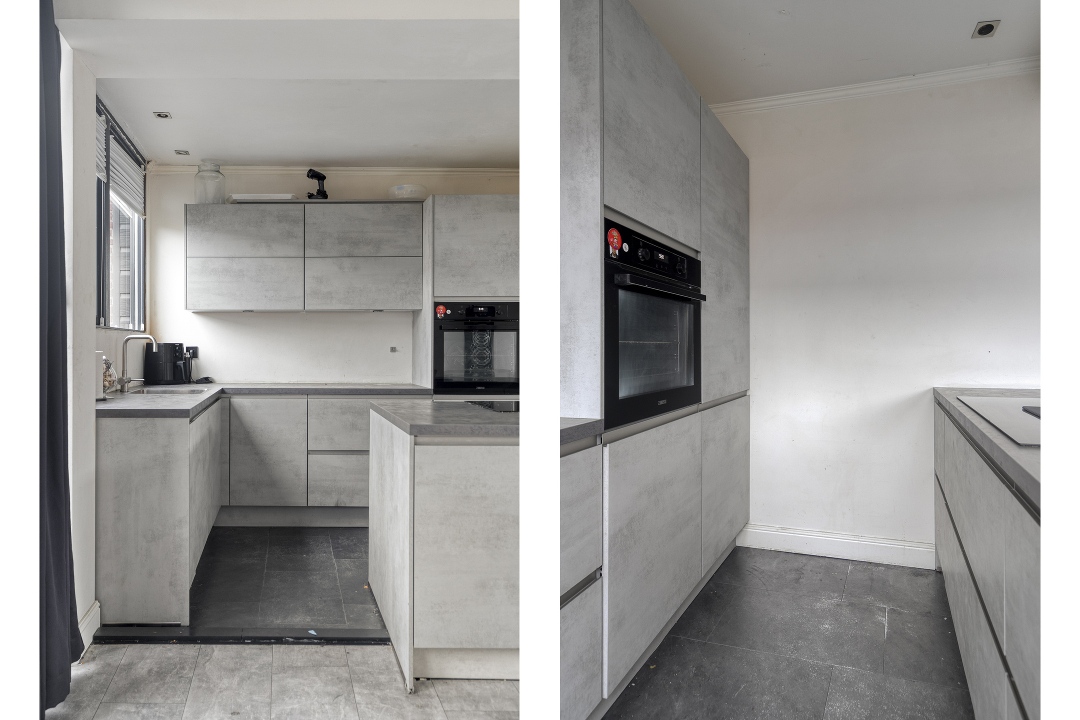 De ruime woonkamer is voorzien van een laminaatvloer en strak gestucte wanden en plafonds. Aan zowel de voor- als achterzijde bevinden zich kunststof kozijnen met HR++ beglazing. De woonkamer beschikt over openslaande deuren naar de achtertuin, wat zorgt voor een prettige lichtinval en directe verbinding met buiten.