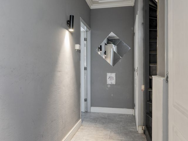 Entree/hal met laminaatvloer, welke toegang biedt tot het toilet, de trapkast, de woonkamer en de trapopgang naar de eerste verdieping.