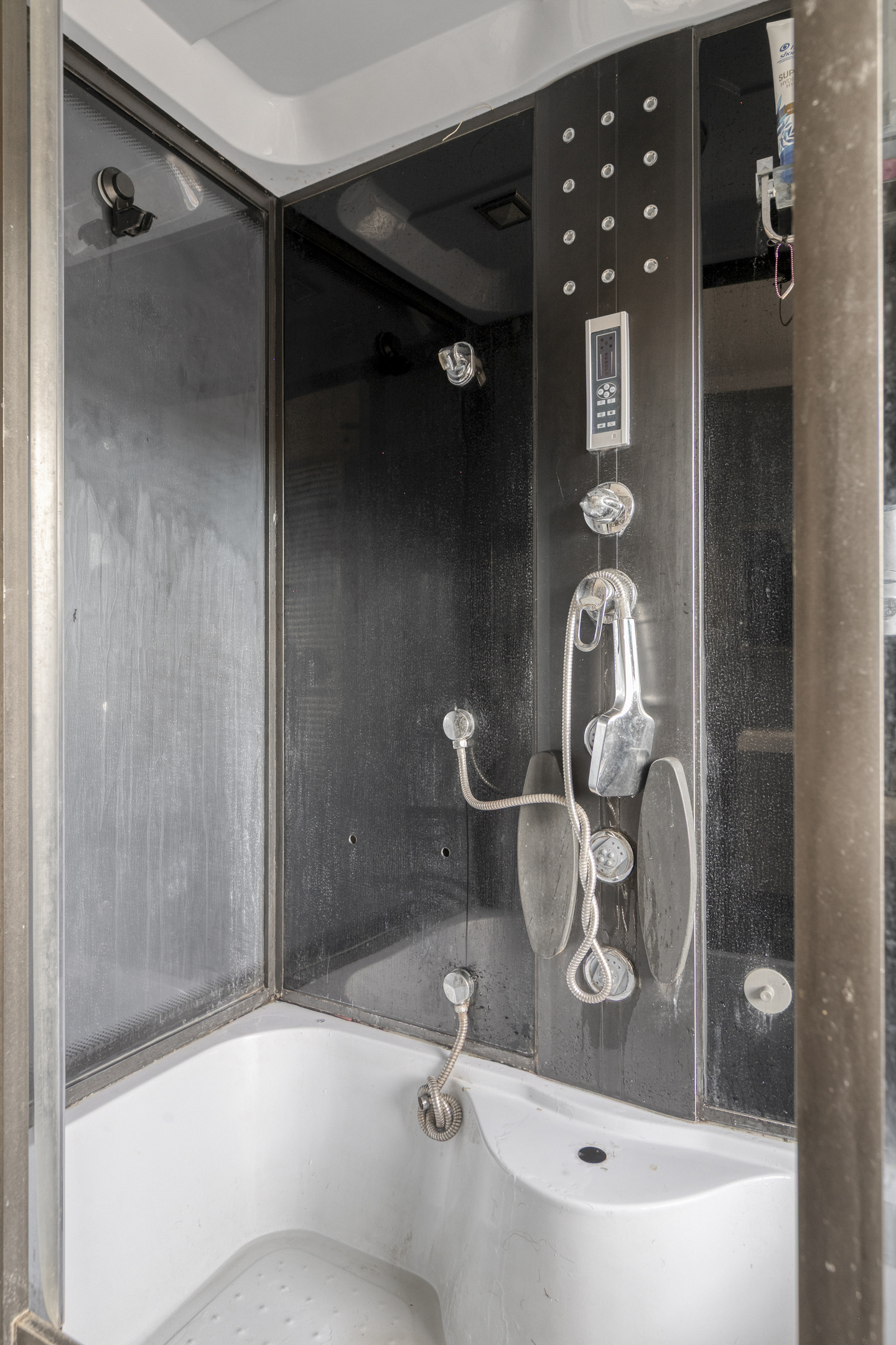 De badkamer is uitgerust met een zwevend toilet, wastafel en een douchecabine.