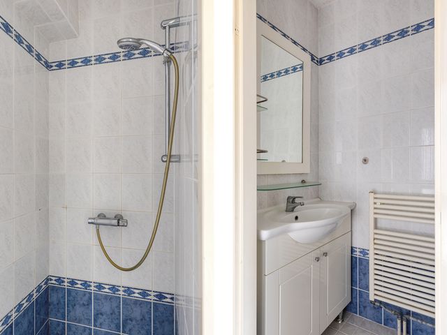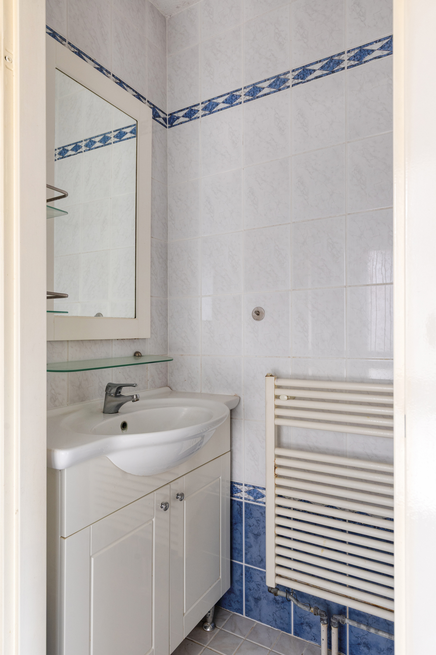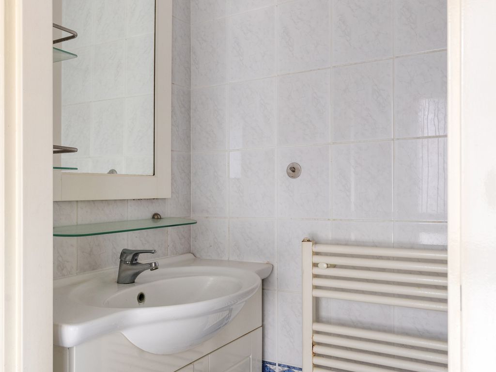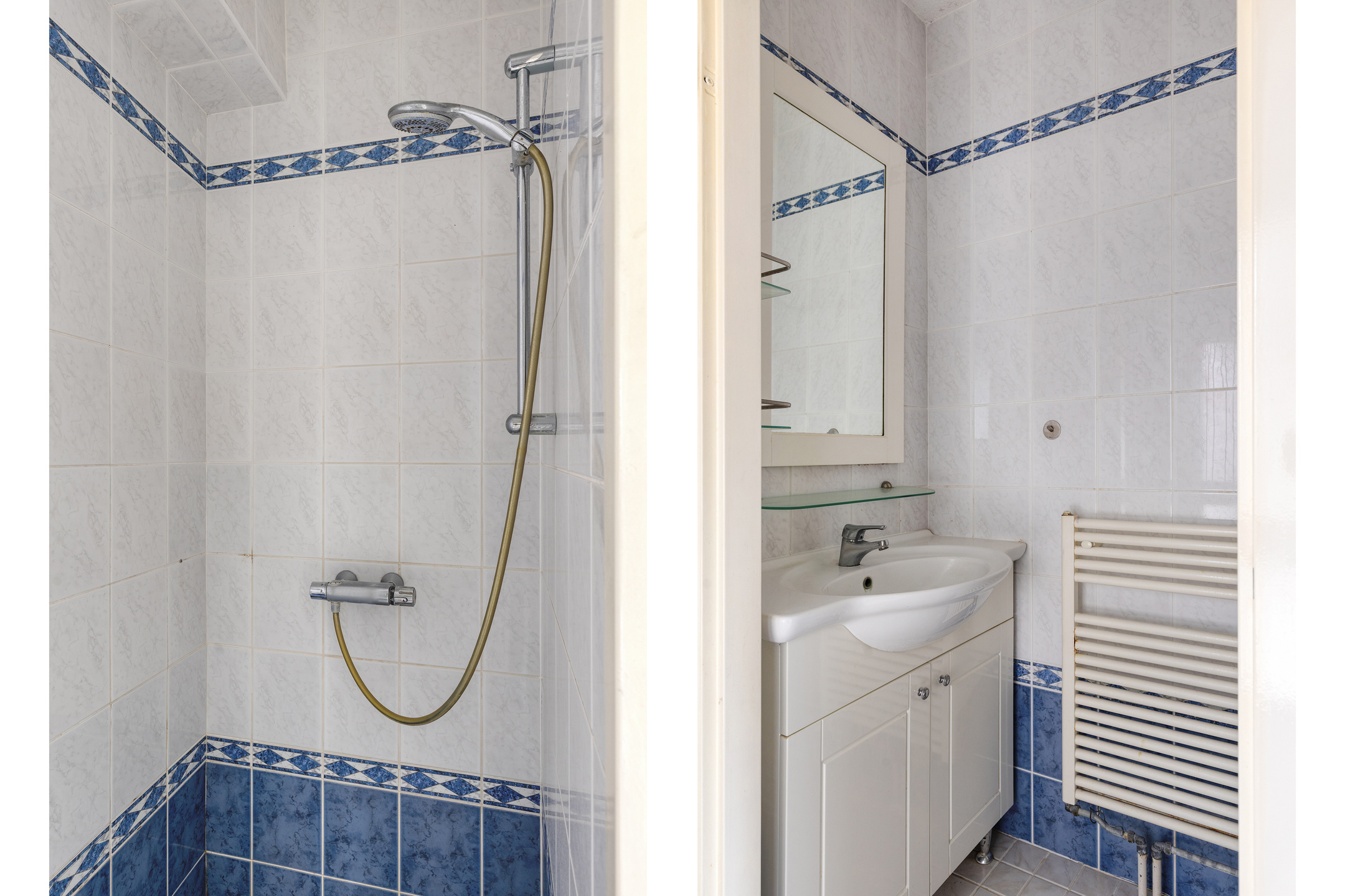 Hal met toegang tot de deels betegelde toiletruimte met toilet en fonteintje, een volledig betegelde badkamer met douche en wastafel, twee slaapkamers en de woonkamer met open keuken.
