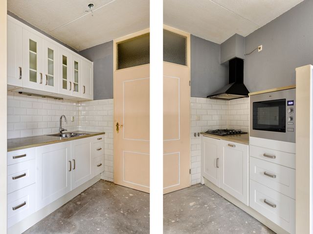 De open keuken is voorzien van diverse inbouwapparatuur en staat in verbinding met de bijkeuken. In de bijkeuken bevinden zich de cv-ketel (Nefit, 2019) en de wasmachineaansluiting.