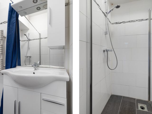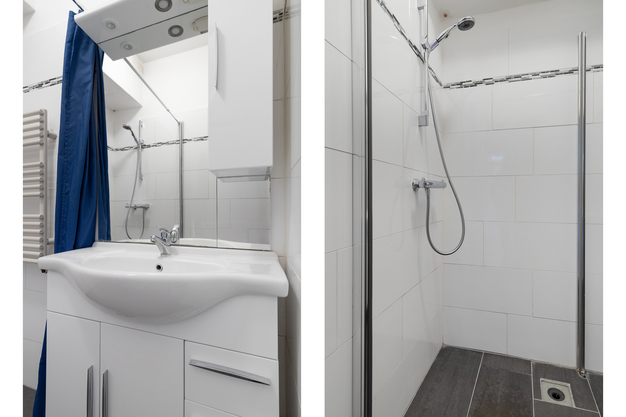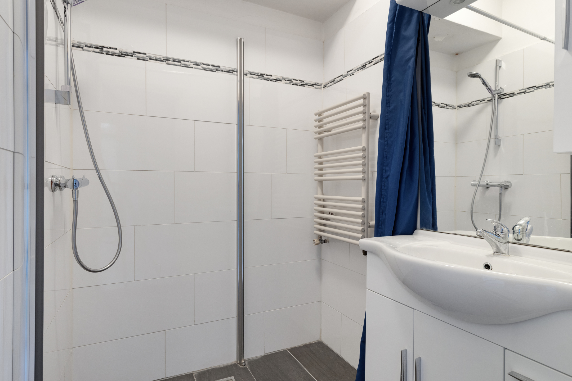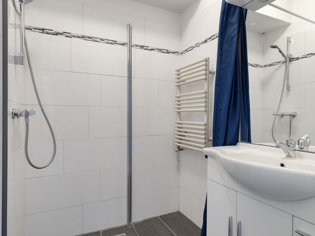 De badkamer is praktisch ingericht met een douche en een vaste wastafel met meubel.