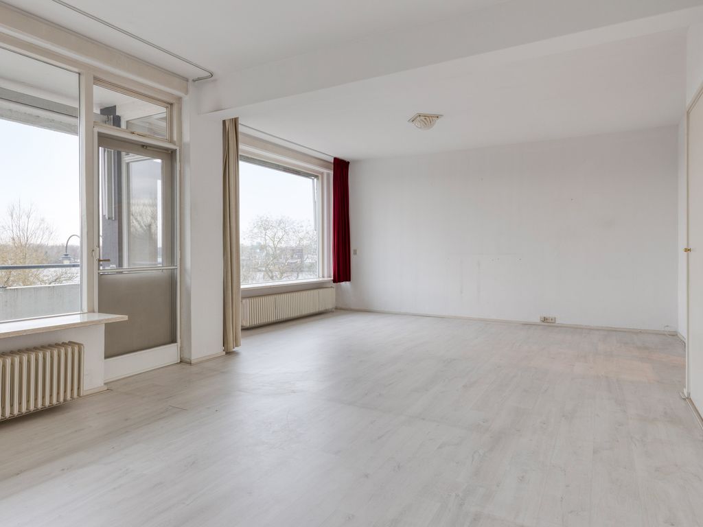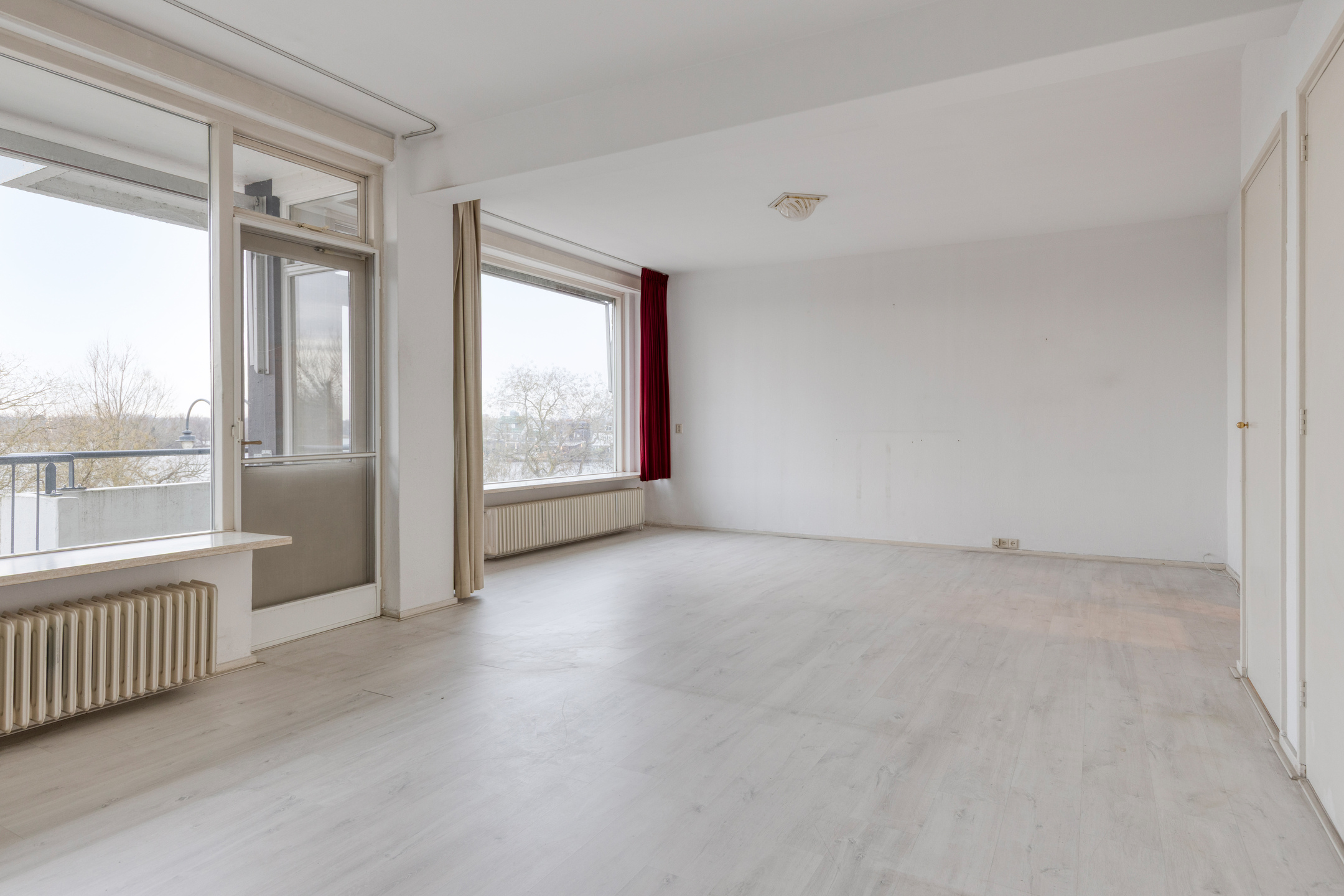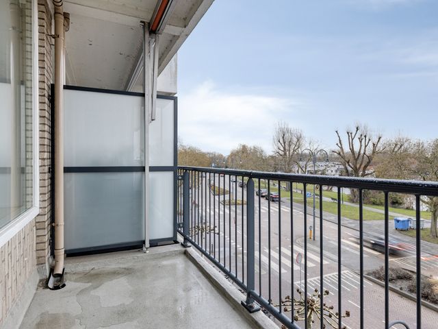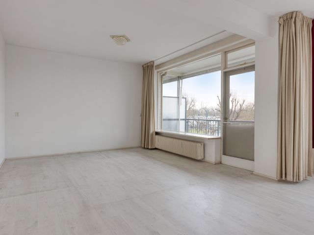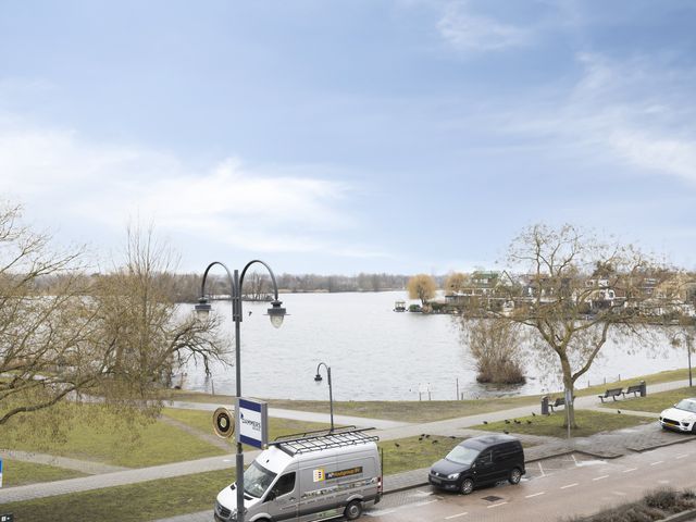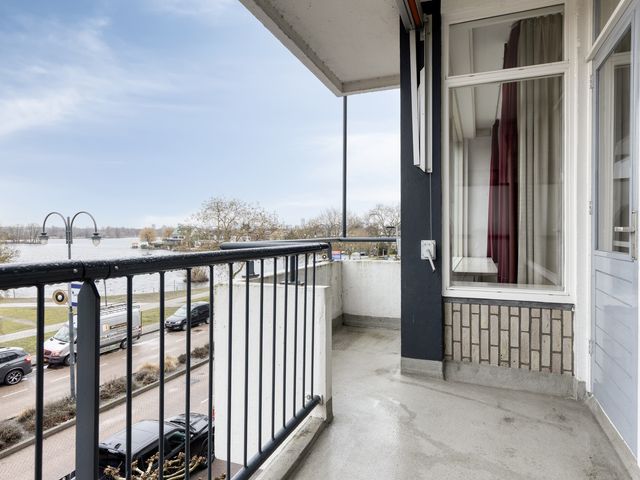 De lichte woonkamer is voorzien van grote raampartijen, twee inbouwkasten en een fenomenaal uitzicht over het water. Vanuit de woonkamer stap je zo het balkon (8 m²) aan de voorzijde op, waar je heerlijk kunt genieten van de zon en het uitzicht.