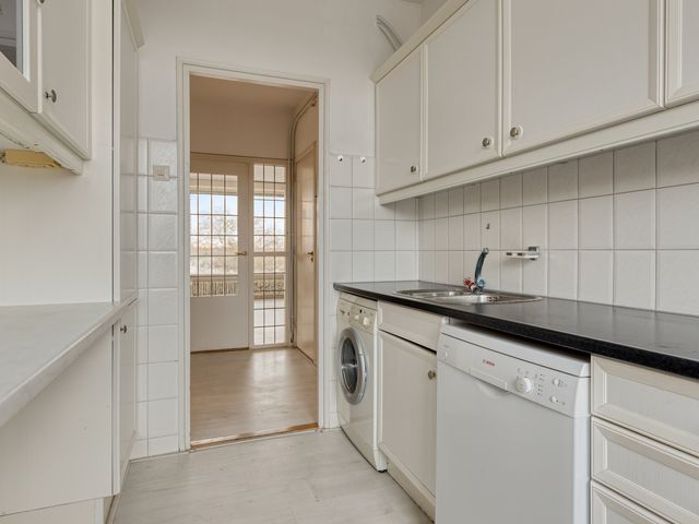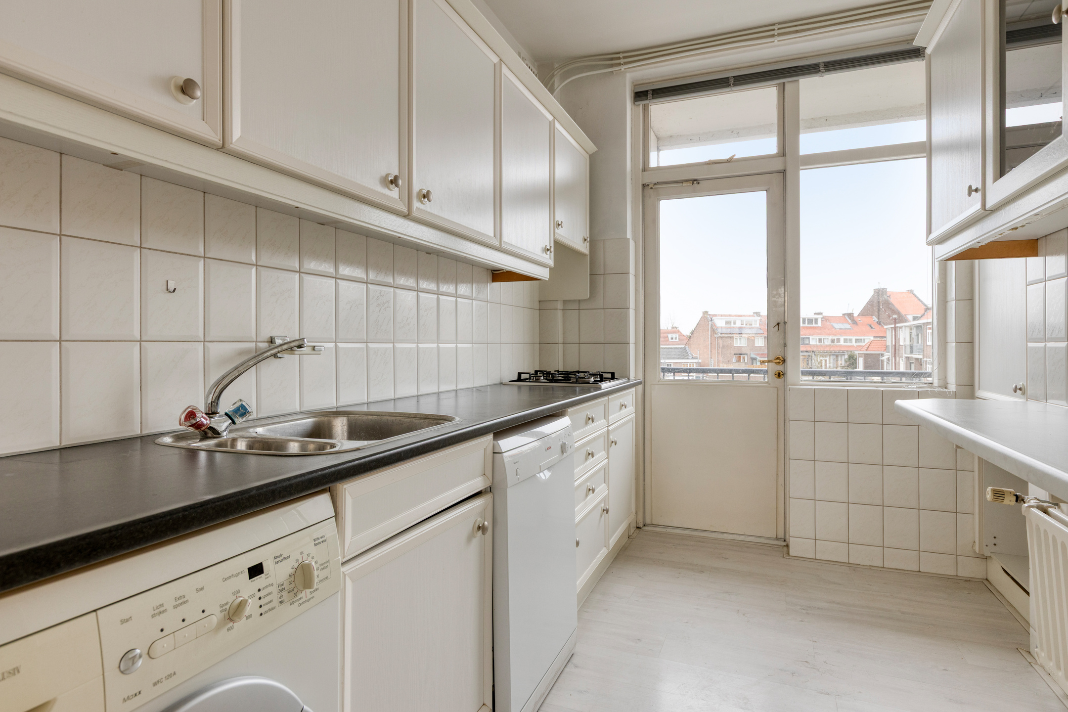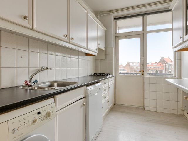 De keuken is gelegen aan de achterzijde en beschikt over een spoelbak, vaatwasmachine, koelkast, gaskookplaat en afzuigkap. Vanuit de keuken is er toegang tot het tweede balkon, waar zich tevens een bergkast bevindt met de opstelling van de Cv-ketel (2016).