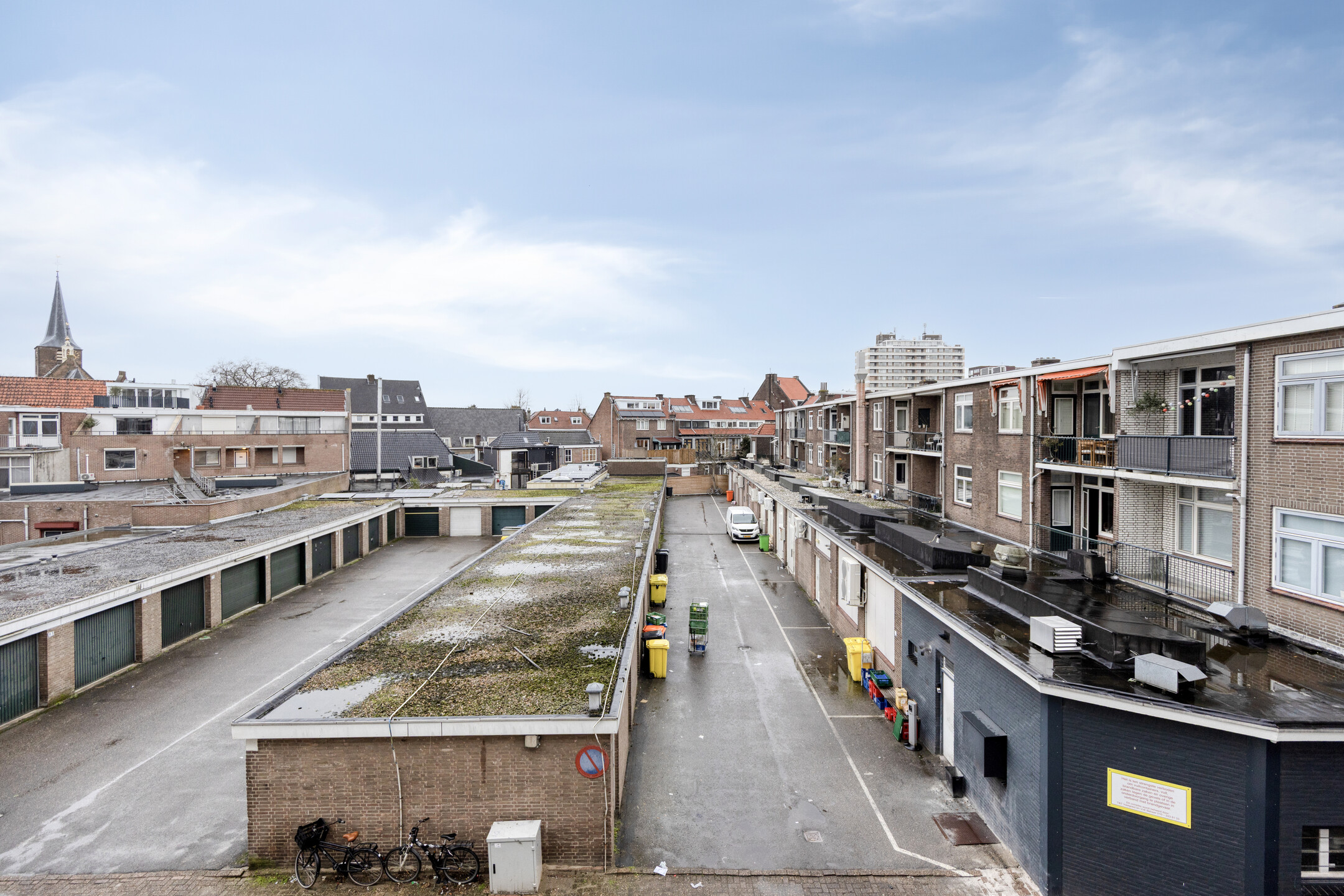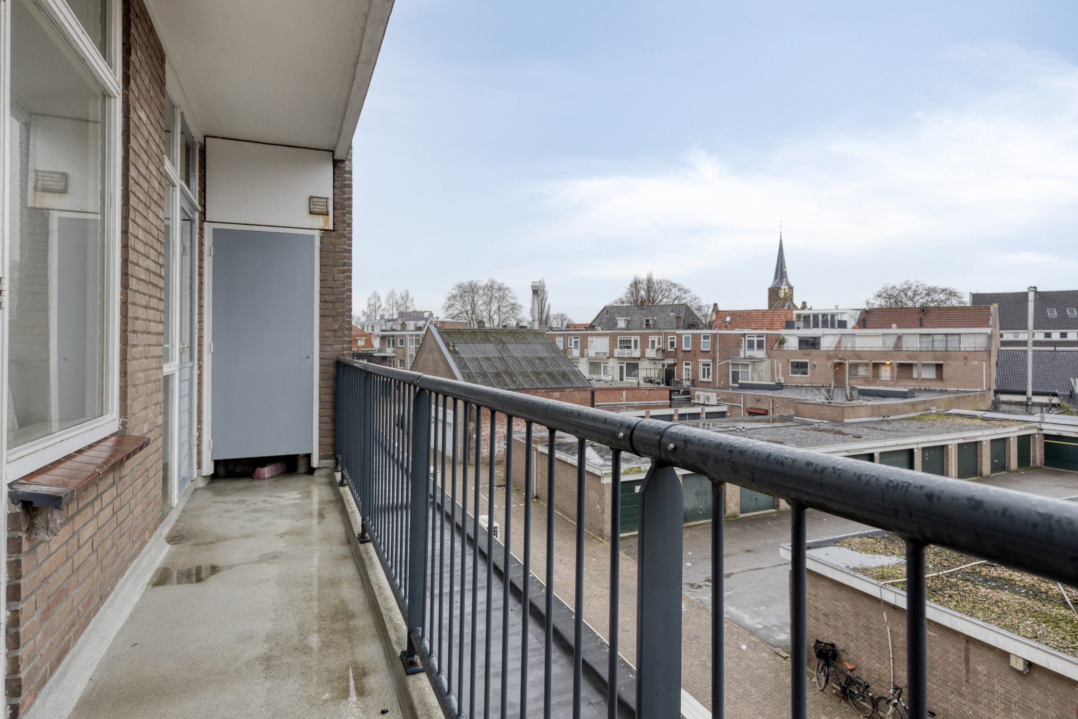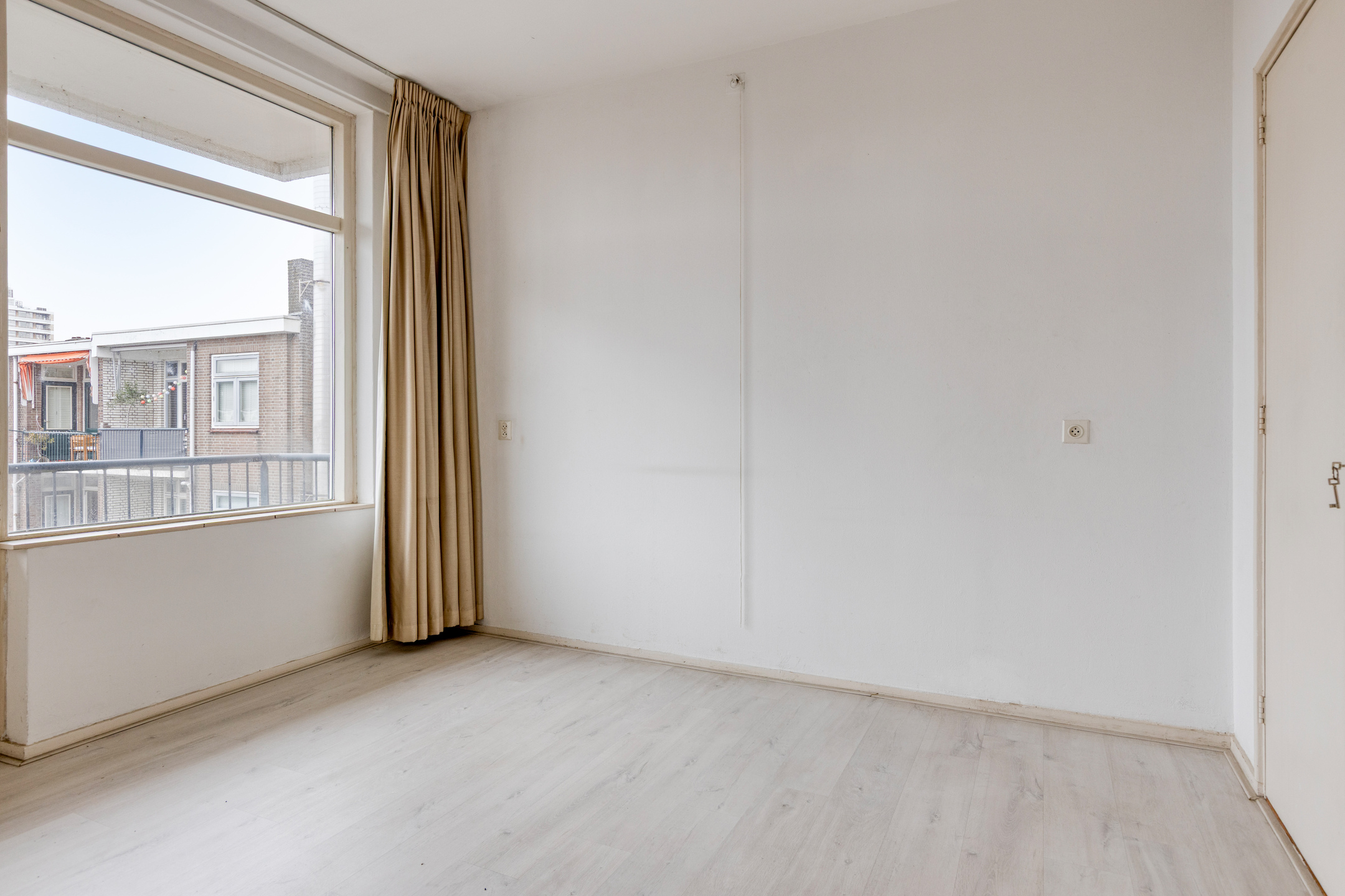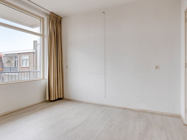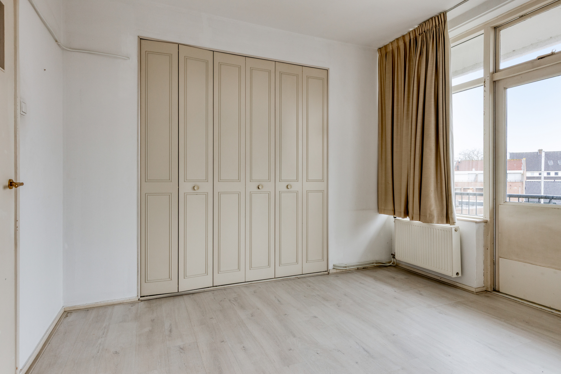 De slaapkamer, eveneens aan de achterzijde, is voorzien van een laminaatvloer, inbouwkasten en een deur naar het balkon.