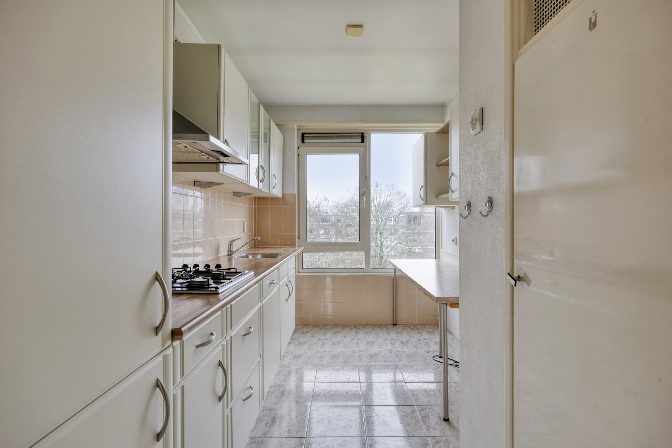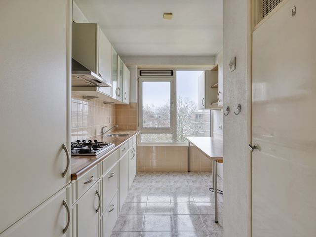 De keuken bevindt zich aan de achterzijde en is afgesloten van de woonkamer. De keuken is uitgerust met een gaskookplaat, afzuigkap, vaatwasser en spoelbak en biedt voldoende opslagruimte, opstelling CV ketel en aansluiting wasapparatuur.